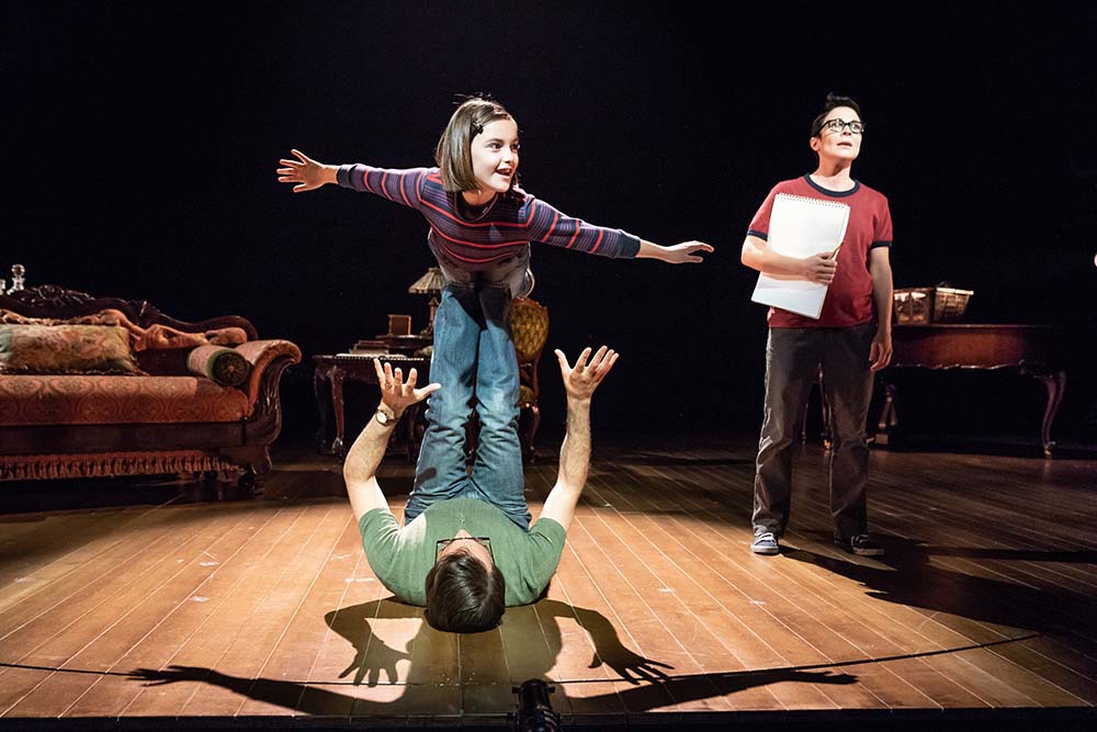 Maintaining the novel’s non-linear structure, the musical flips between Alison’s Big (Kaisa Hammarlund), Medium (Eleanor Kane) and Small (played in the press performance by Brooke Hayes), the oldest version of the artist constantly captioning her younger selves as she seeks to dig into the truth of her family. Most of that searching revolves around her father Bruce (Zubin Varla), a difficult man whose struggles with his own sexuality act as a sad mirror version of the cartoonist’s journey.
