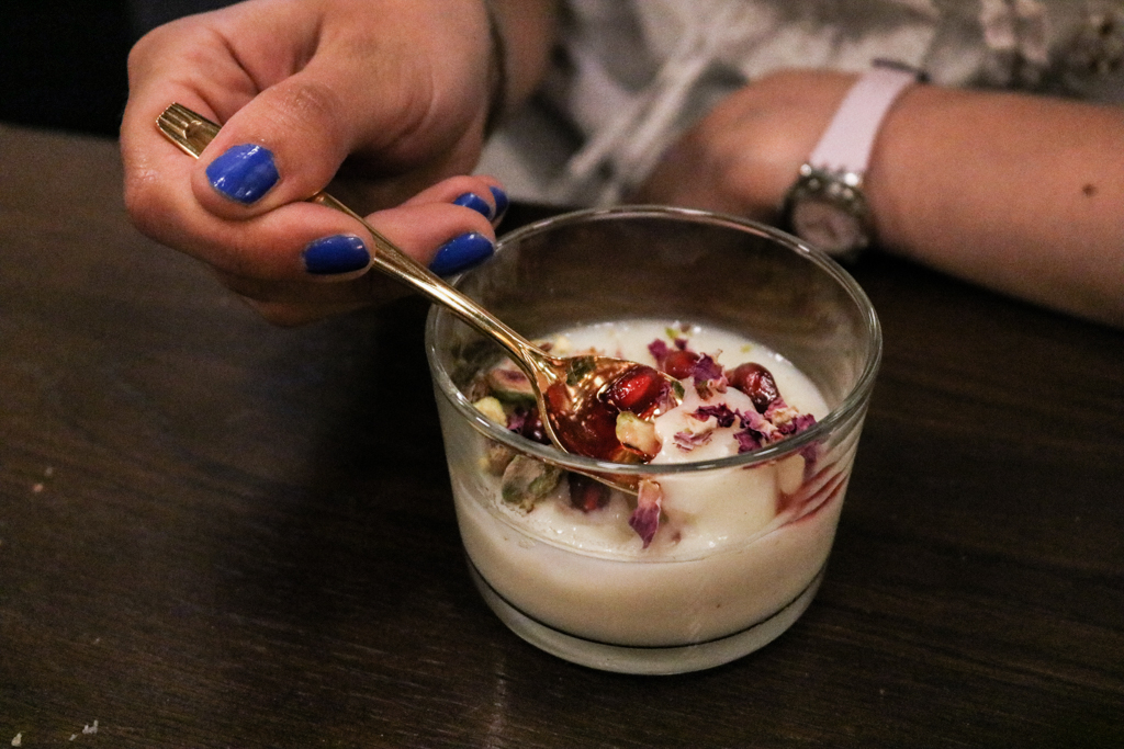 “The way we eat in Syria and Lebanon is very similar to what we experienced tonight: we like to taste small dishes and share. And it is a good way to meet people,” Mia confides. Indeed, this writer felt absolutely no shame in her appreciation of the hummus, and my neighbour couldn’t hide her enjoyment in tasting the stuffed vine leaves, the first being from a traditional recipe – with whole chickpeas and thick olive oil decorating the top – and the second pleasantly seasoned.