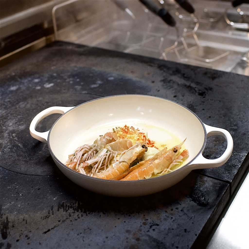Heat a large shallow casserole dish (we use a 26cm cast iron shallow dish from Le Creuset) over a medium heat.
