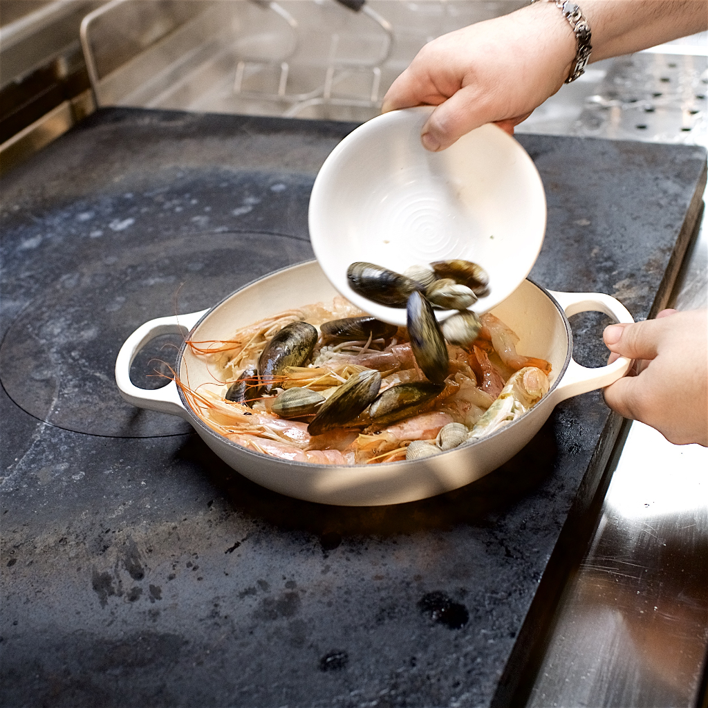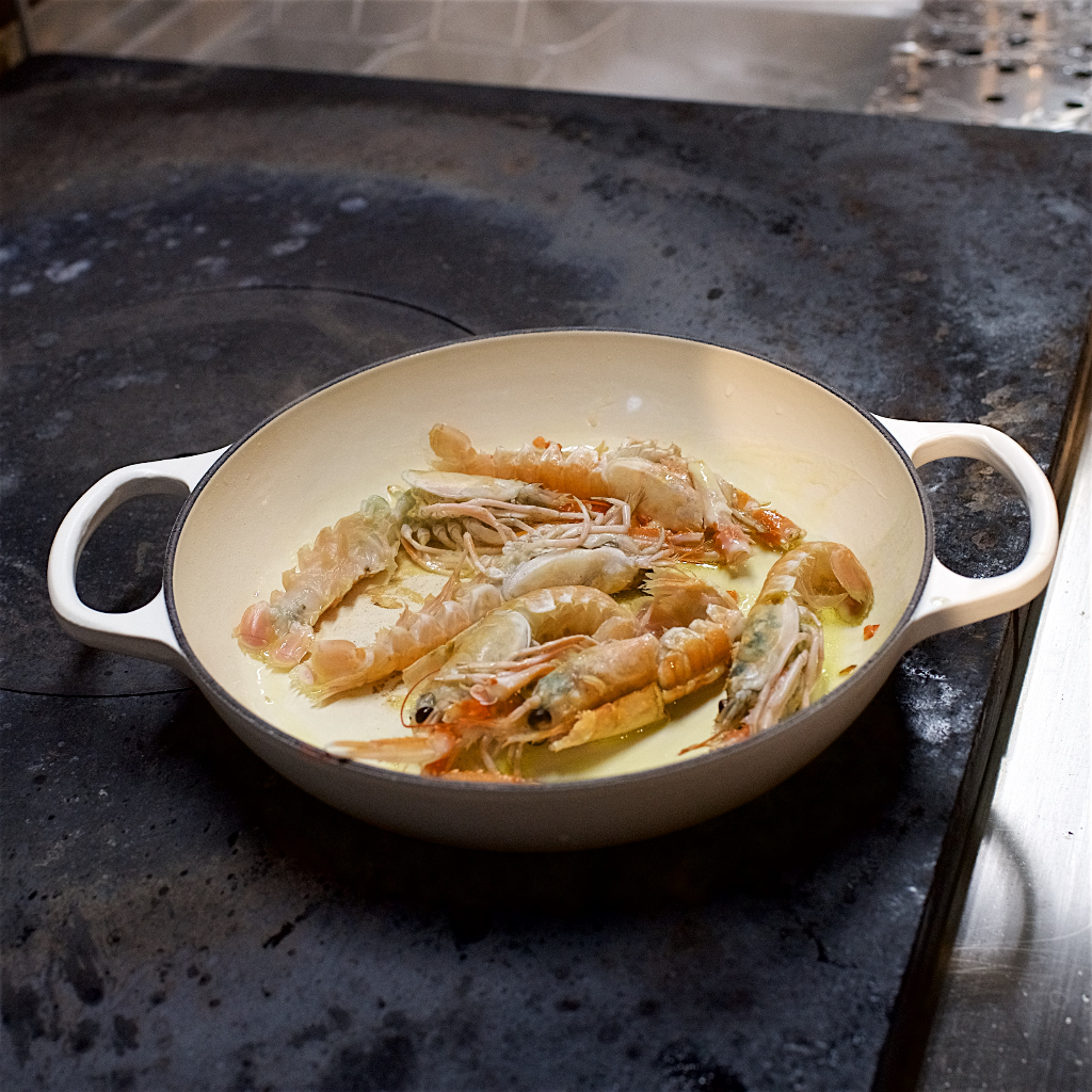Make sure you have everything ready as above: garlic chopped and all the seafood prepped etc. – you’ll need to move fast once you get going.