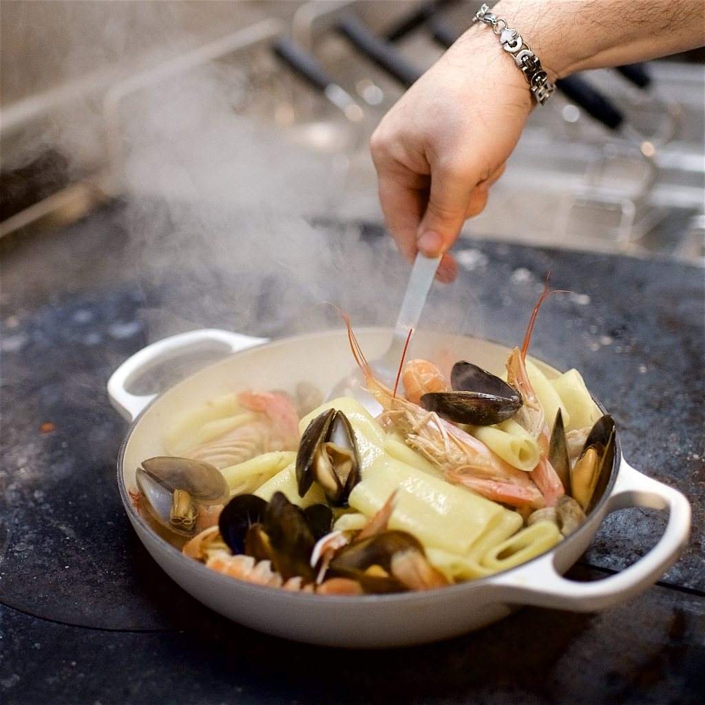 Change up the seafood as you like; bits of fish, crab claws, picked lobster would all be good. I think it’s important to include clams or mussels though, as the juicy umami broth they create is an integral component. We use paccherri, a Sicilian pasta like a very large rigatoni.