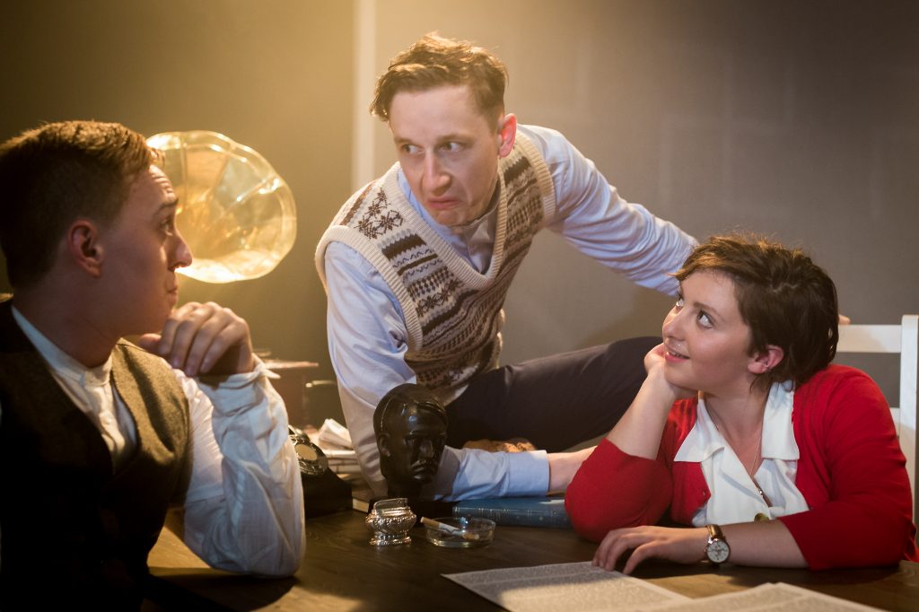 The scene changes from the blinding white lights of the interrogation room to cosy orange lights of a home. Here, we are introduced to Sophie’s brother, Hans Scholl (Will Pinchin), who says that speaking his mind in one room is not enough. Answering him, Alexander Schmorell (Conor Moss) arrives with a typewriter, and The White Rose blossoms. The group consists also of Hans’s girlfriend Traute Lafrenz (Beatrice Vincent), the brave Willi Graf (Alex Stevens) and kind-hearted Christoph Probst (Pearce Sampson). The piece alternates between scenes in the prison and flashbacks, showing just how Sophie and her friends lead the only major act of civil disobedience to the Third Reich by making and distributing leaflets across Germany.
