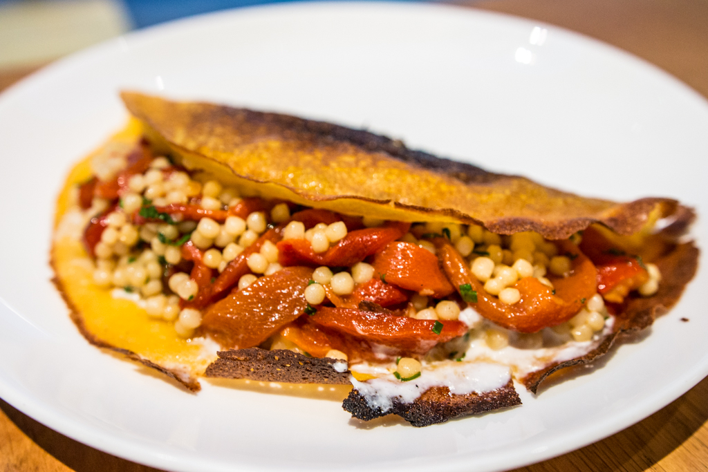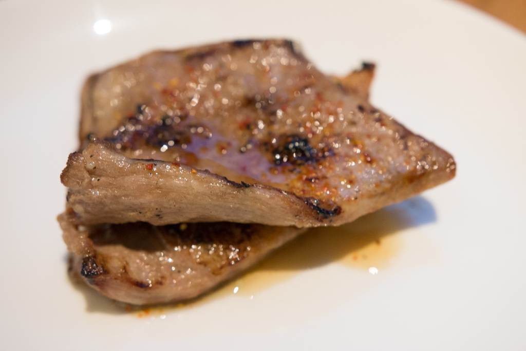 The mains herald the consummation of the promise from the inviting smokey smell which still pervades the room. Dishes from the grill are served without sides, and the presentation feels somewhat barren against the white crockery. The whole mackerel with fennel and cod’s roe sees the protein overshadowed by the fresh vegetable on the plate. Off the meat trail, the Socca Niçoise (a chickpea pancake) with barbecued peppers and giant couscous is a collection of three separately delicious components; the Iberico Secreto, cooked to a rosy pink, sits a little unceremoniously on the plate, and despite great colouring remains a little chewy.
