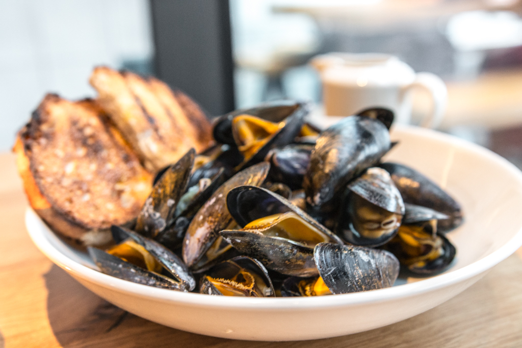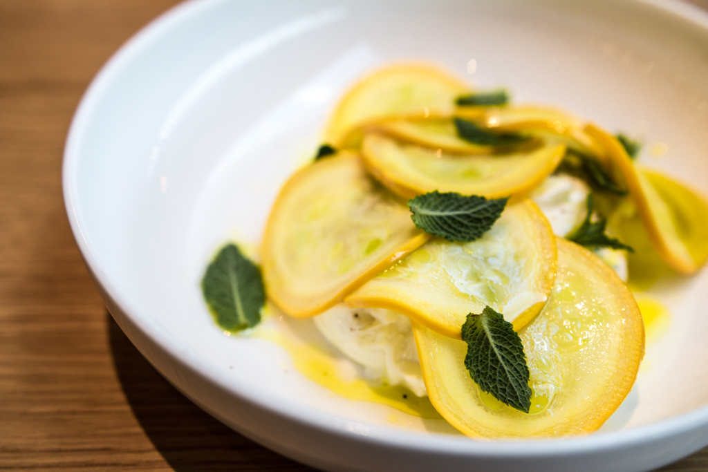 Reading through the menu, there is a distinctly Mediterranean feel to this modern British venture. This is hardly surprising given the other two locations for Wellbourne are the Spanish Pyrenees and Bristol. Before the arrival of our starters, four charming vol-au-vents appear at the table. Laid out on slate, these are far from drab relics of our national cuisine. Most surprising is the pulled lamb shoulder with violet mustard, the sauce sweet and floral even against the richness of the meat. Next, the fresh burrata with shaved yellow courgette and mint is wonderfully creamy and well balanced, far outstripping the charcoal mussels with vinaigrette and sourdough.