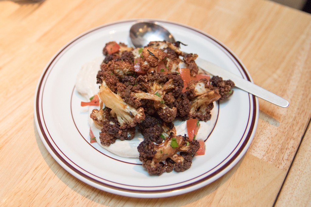 This is showcased in an eye-catching salad of organic tomatoes of all colours, served with grated unpasteurised Akawi cheese, typically found in Palestinian and Levantine households. Fresh oregano and a sprinkling of za’atar add wonderfully fragrant notes to the dish while showing that a simple ripe tomato is sometimes all you need. Cauliflower, Tahini and Sumac is another standout starter, florets of the vegetable fried until lightly crispy. They’re a handy tool to mop up the tahini underneath, and the sumac offers a lemony finish.