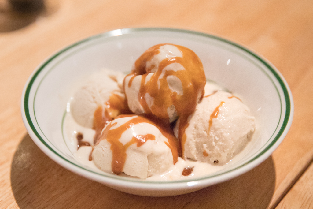 To finish, we enjoy the Tahini Ice Cream with a caramel sauce, which is reminiscent of halva. The caramel, cooled by the ice cream, solidifies and becomes chewy, making this dessert indulgent and moreish.