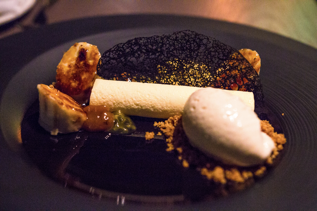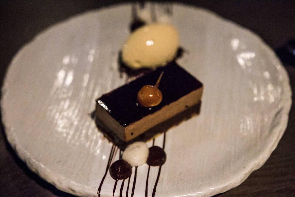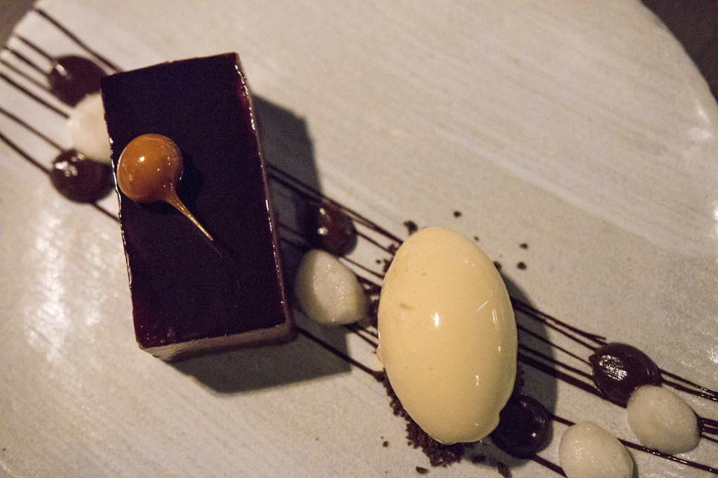 As the spoon made its way through the Chocolate Bar, it revealed the different consistencies of the three layers: from a soft mousse to a hard-baked macadamia shortbread. Accompanied by white chocolate ice-cream, this final course was an intense revelation.