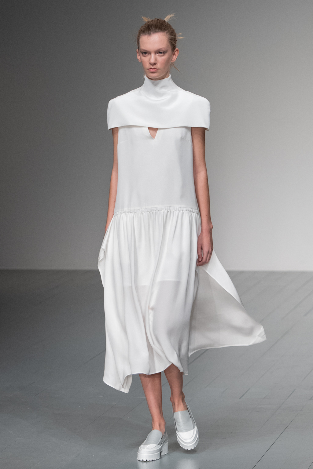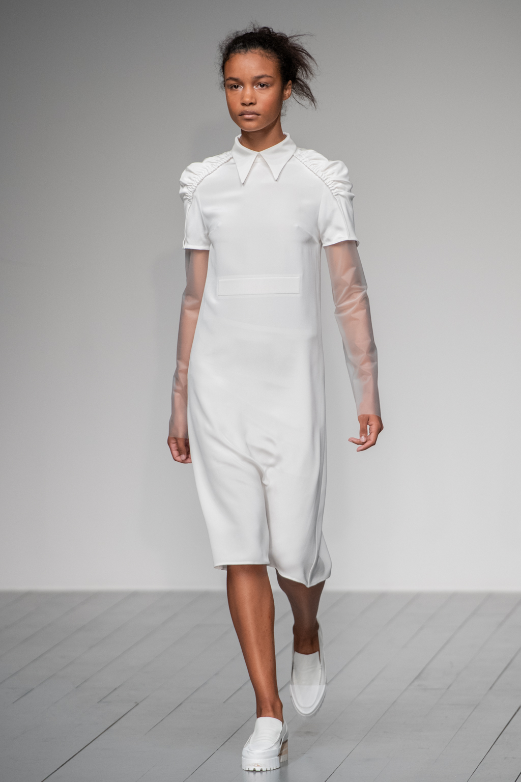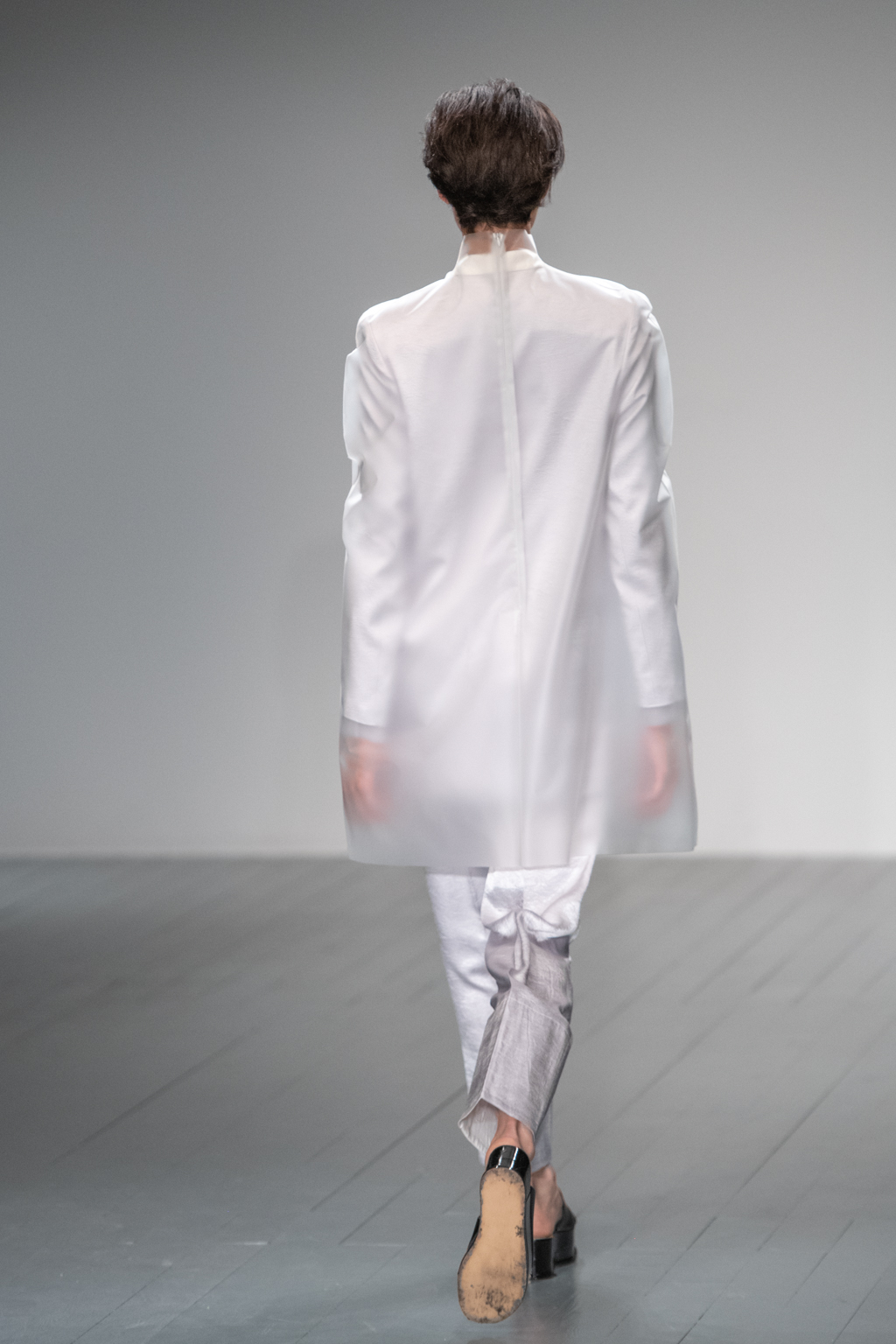 Minimalism was key, but there were a few eye-catching motifs. Block colour hems and ruched details, clear PVC sleeves and shoulder covers alluded to the contemporary, or perhaps more to futurism.