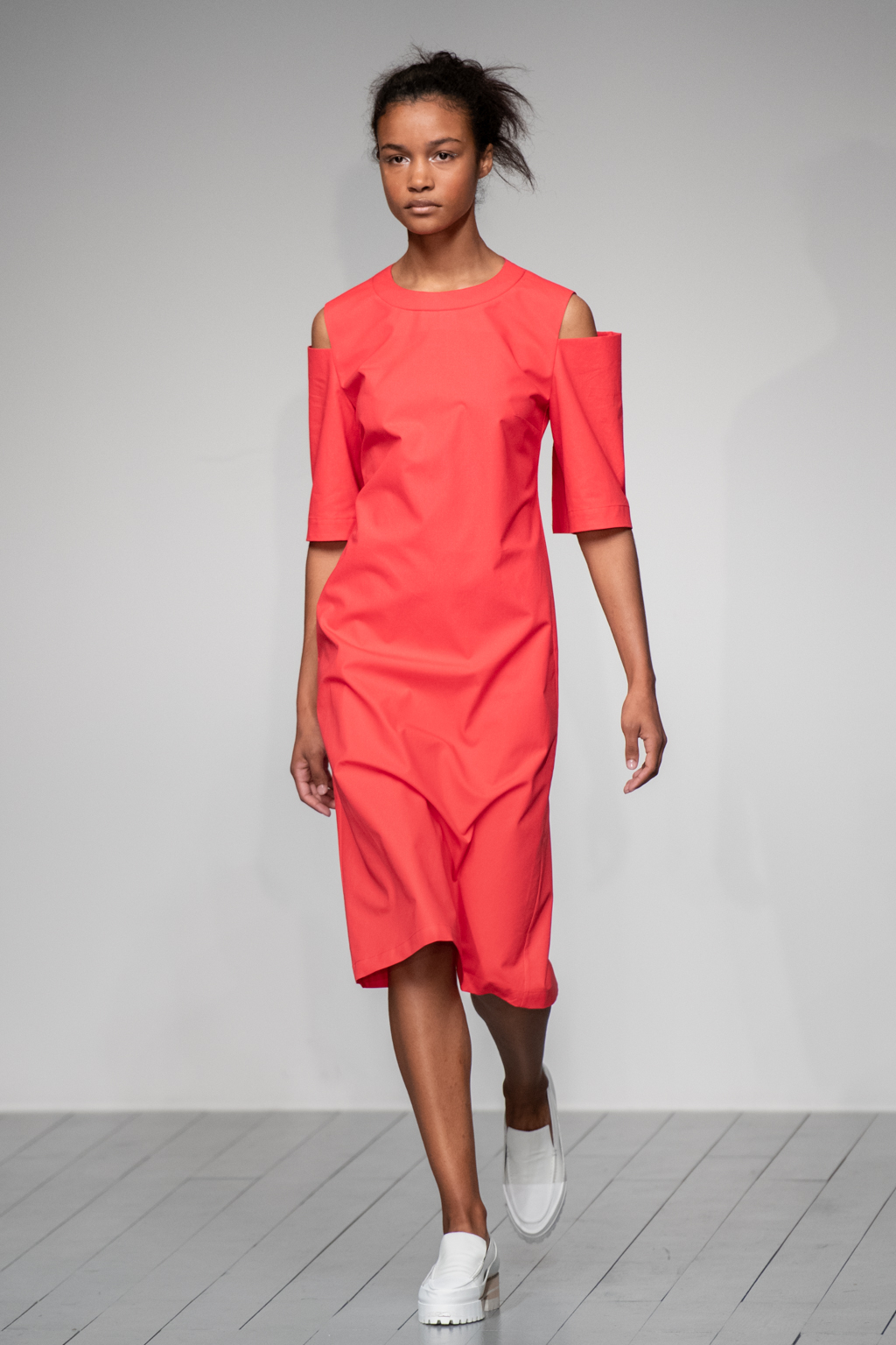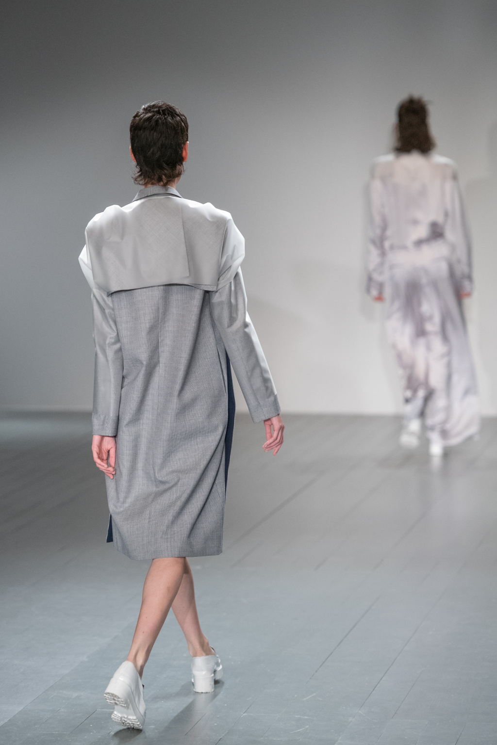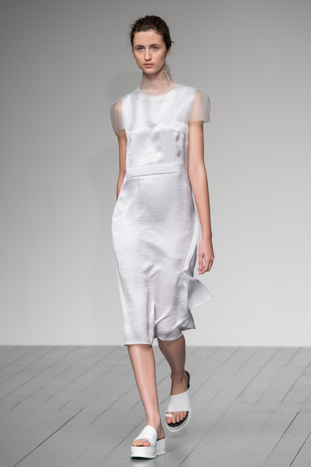 Minimalism was key, but there were a few eye-catching motifs. Block colour hems and ruched details, clear PVC sleeves and shoulder covers alluded to the contemporary, or perhaps more to futurism.