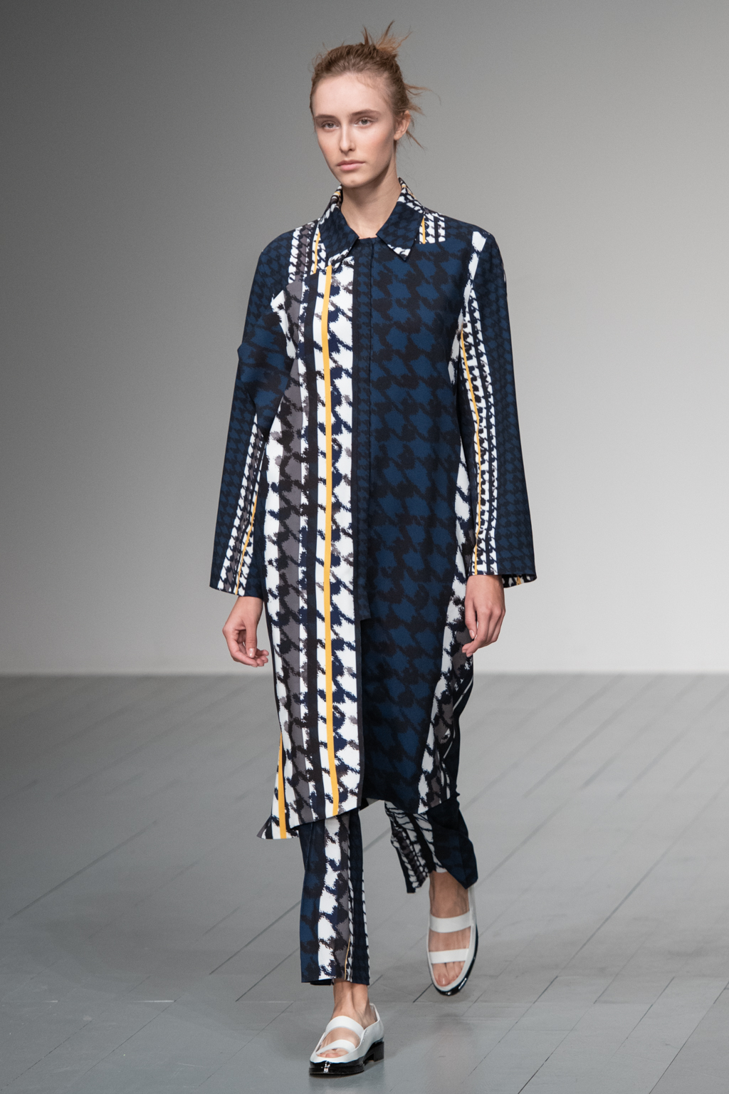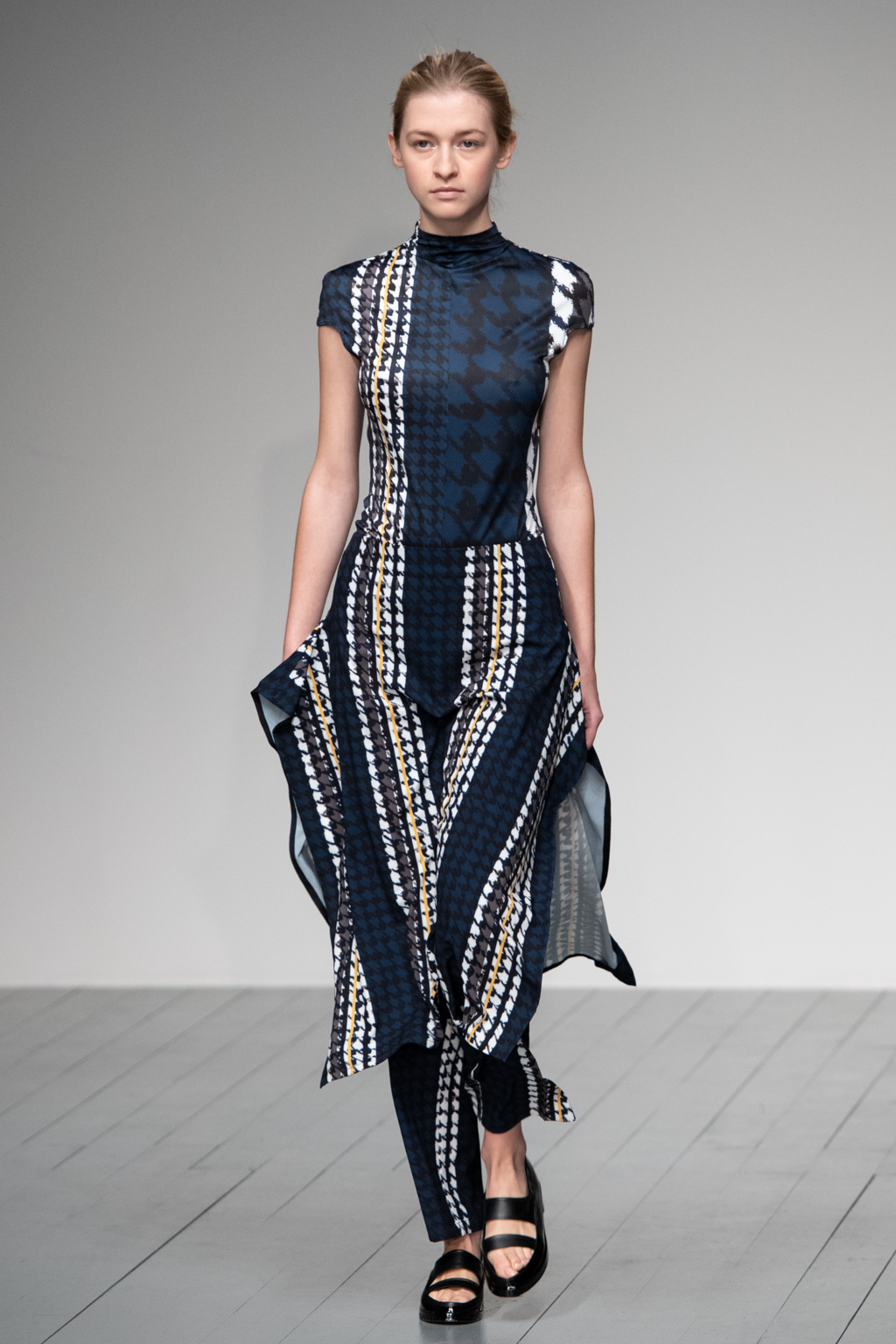 The collection evolved to become softer and more feminine with lighter hues. A blurred, ikat-like print cascaded down navy co-ords in a more fluid fabric to its predecessors.