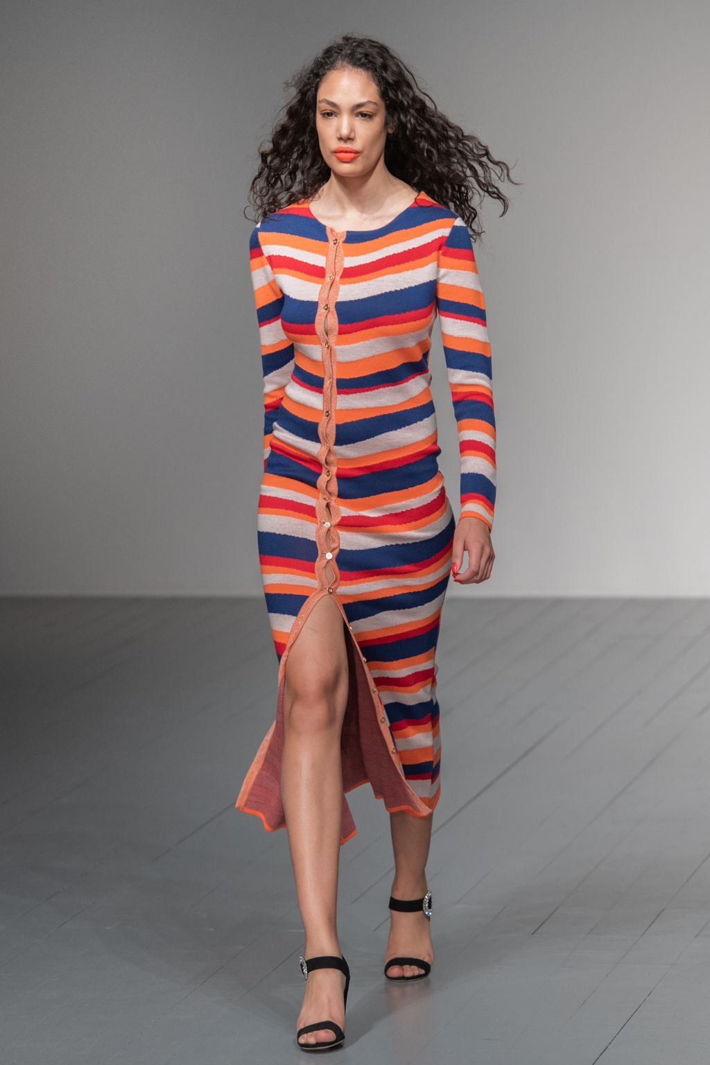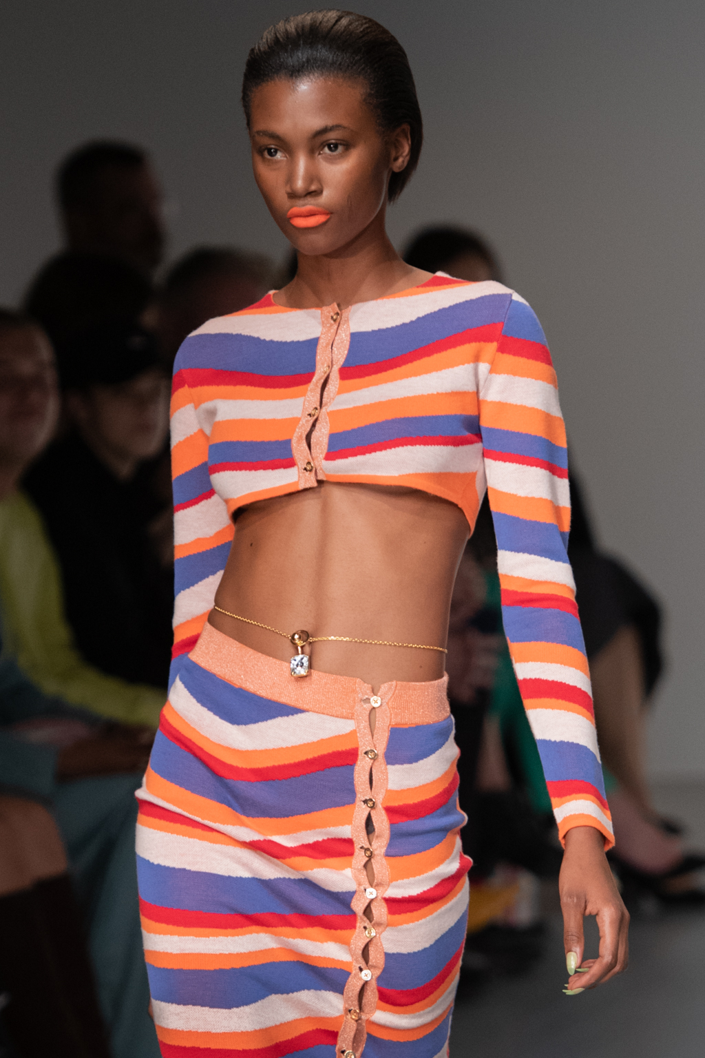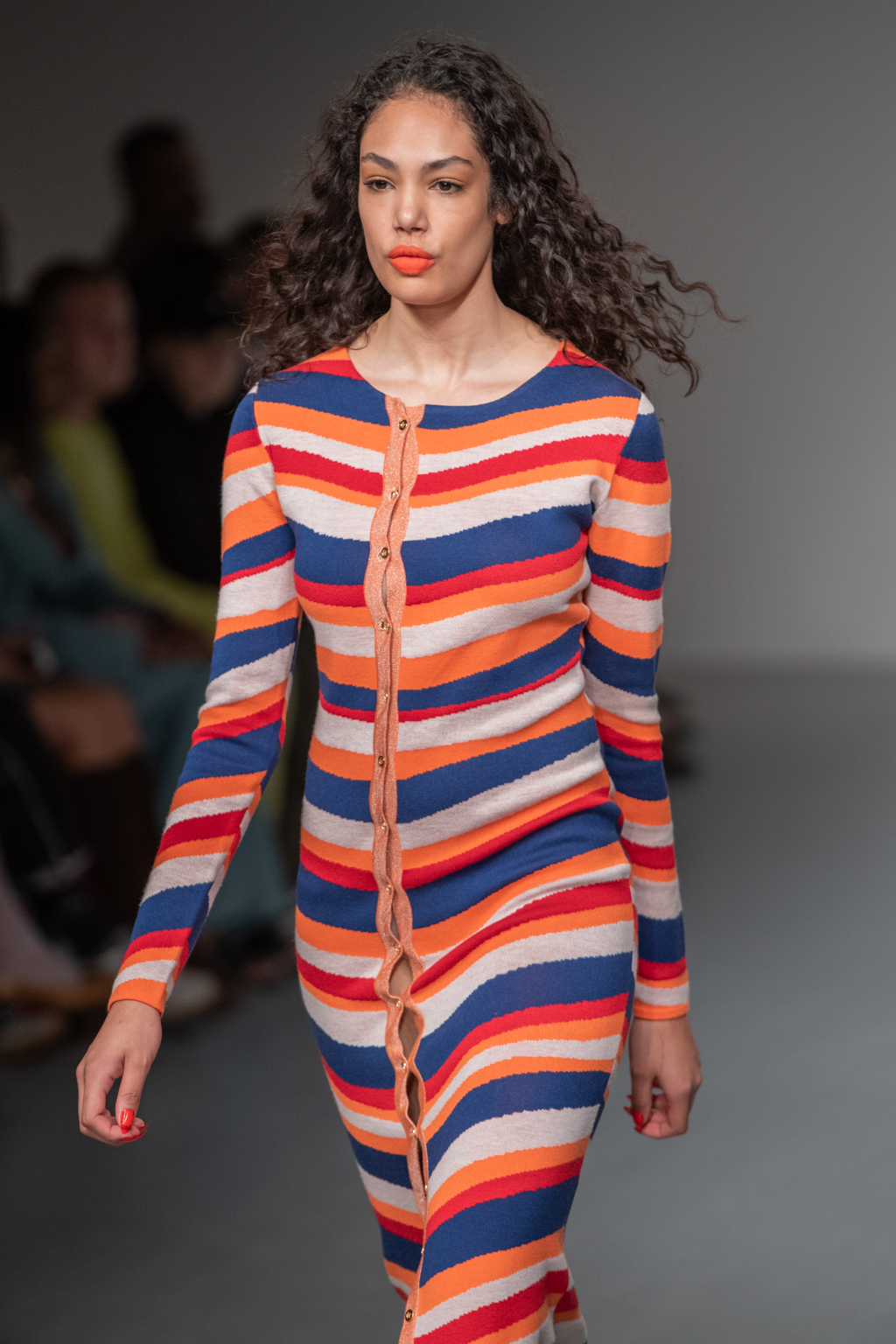 Vibrant horizontal stripes adorned figure-hugging dresses and separates, while fluorescent colour combinations were a delightful ode to decades past, the standout example being a neon parachute parka.