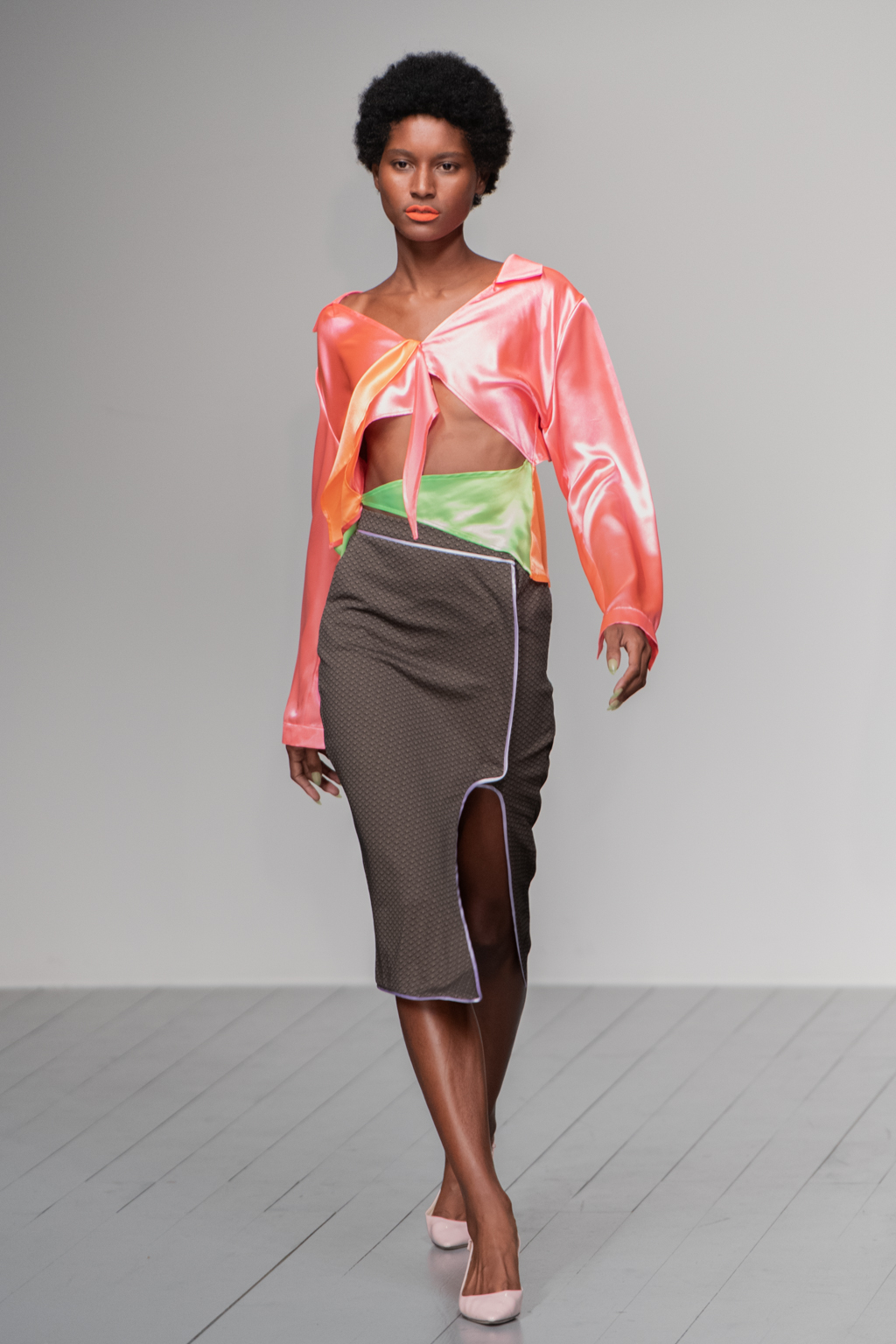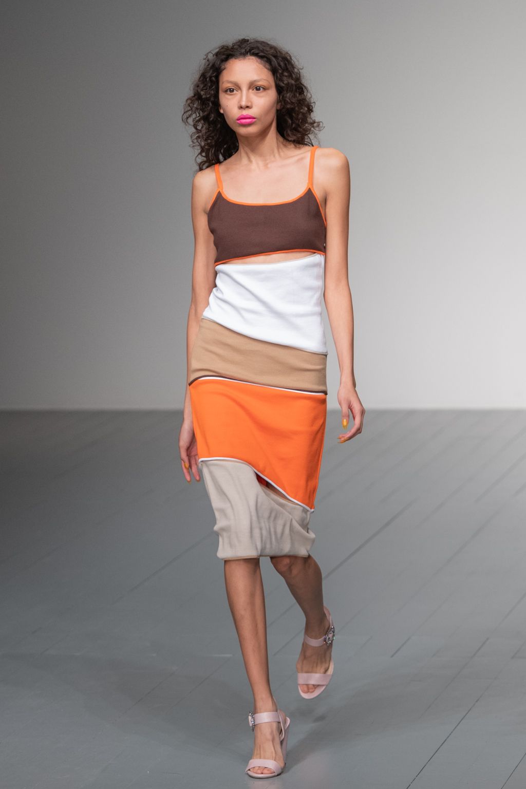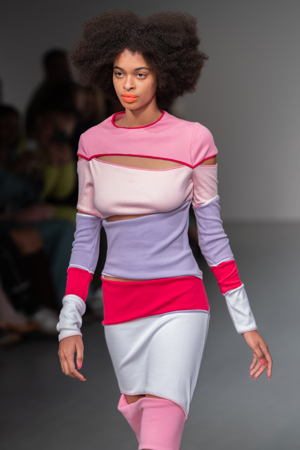 Vibrant horizontal stripes adorned figure-hugging dresses and separates, while fluorescent colour combinations were a delightful ode to decades past, the standout example being a neon parachute parka.