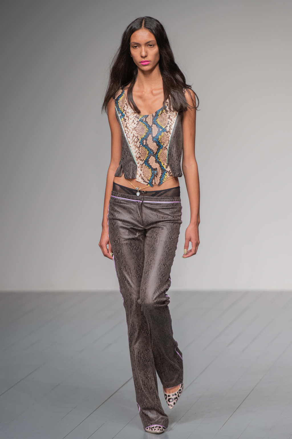 Jakubowski’s “chic raving gear”, inspired by recent trips to Ibiza, featured baggy shirts in popping pink and lime green, lifted by navel piercings – representing every parent’s nightmare – and sparkling body jewellery. Low-slung and tight trousers provided a fun twist on casual wear.