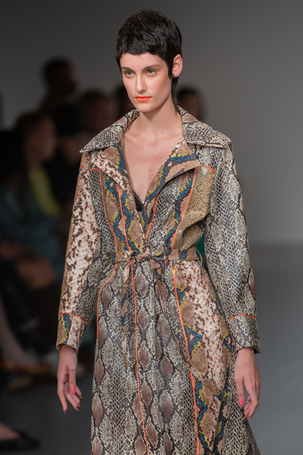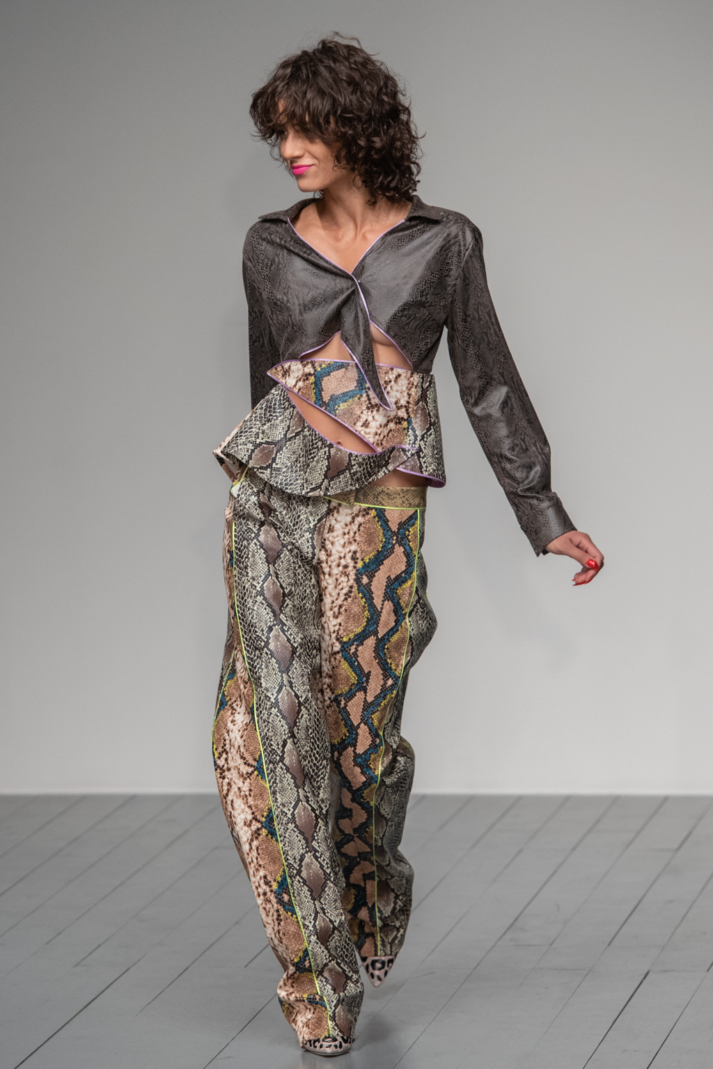 One of the most striking pieces paired together a broad-shouldered, masculine suit with a tight, shapely corset. Another standout item was a longline patchwork snakeskin coat, its rich textured patterns a bold celebration of the audacious.