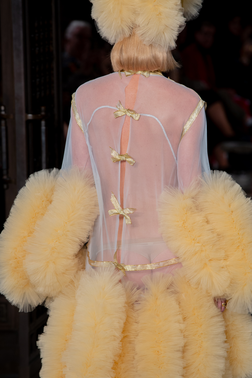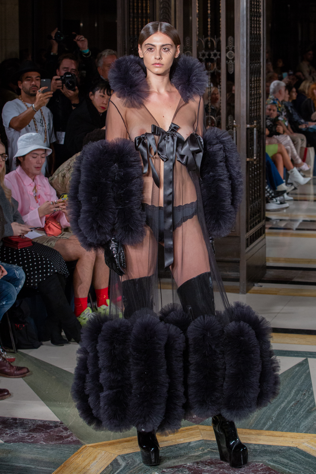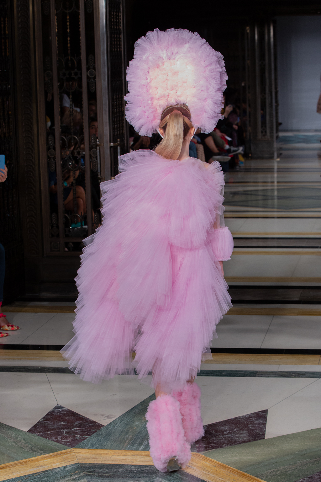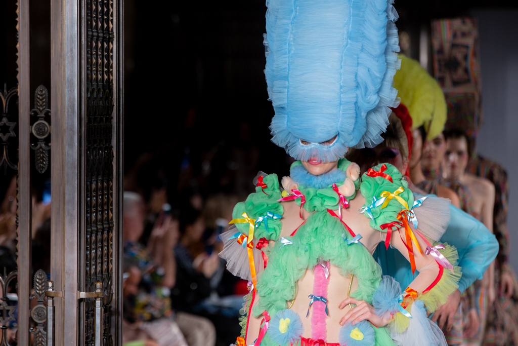 In keeping with the tulle theme, Hogg introduced towering headpieces and frocks in cerise, candyfloss pink and sky blue. A standout ensemble was a black sheer gown with large fur pieces on the arms, and trailing off the dress. There were cheeky and racy designs too, where the models would be fully covered from the front, but slightly more exposed at the back.