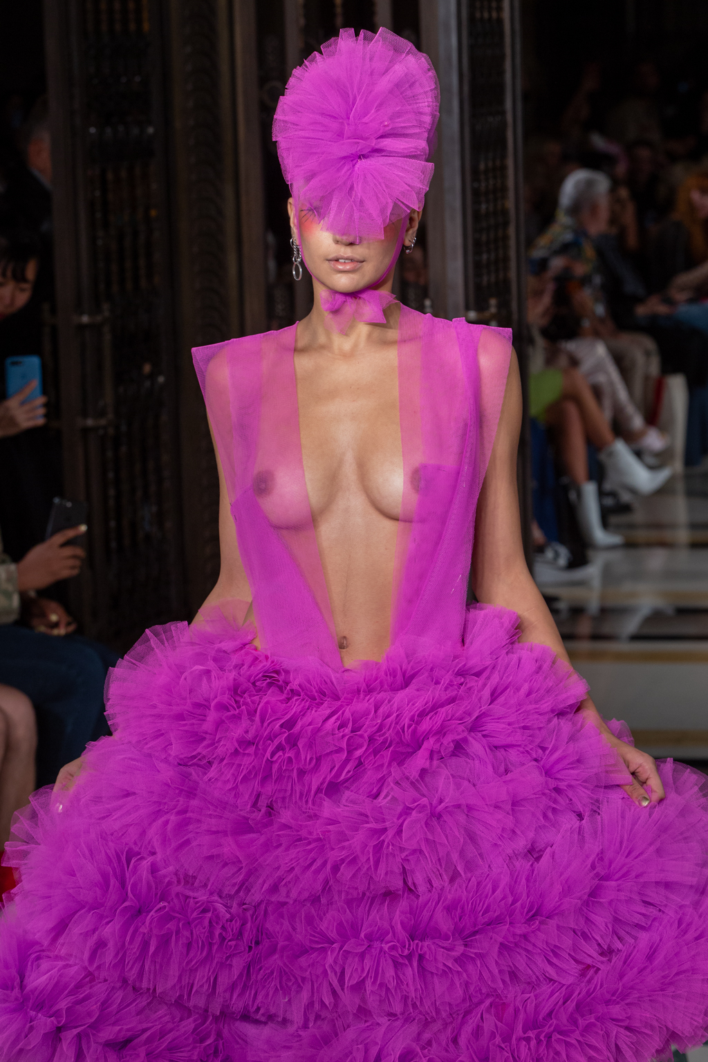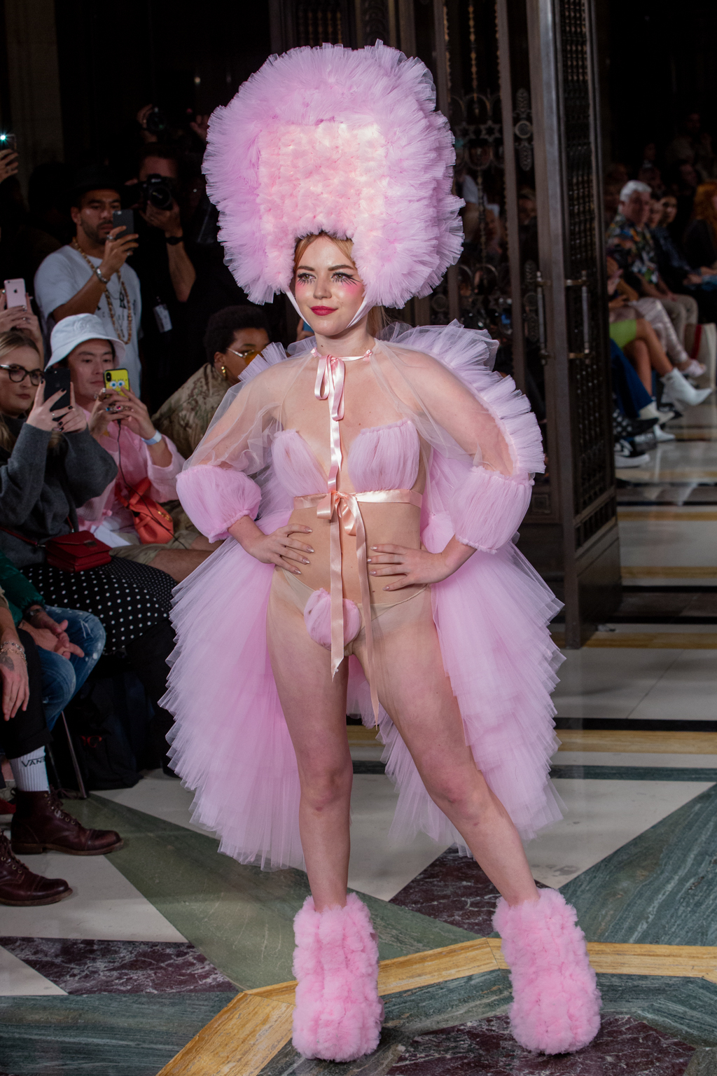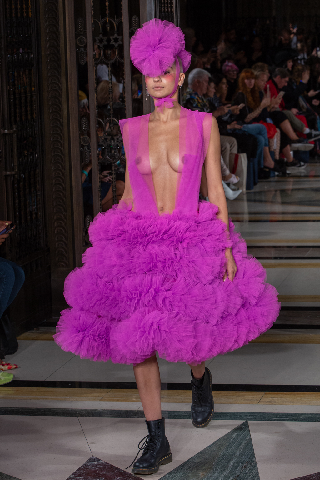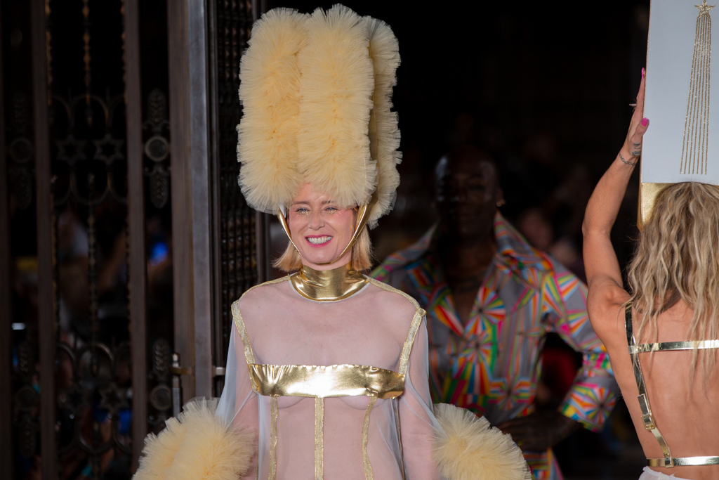 In keeping with the tulle theme, Hogg introduced towering headpieces and frocks in cerise, candyfloss pink and sky blue. A standout ensemble was a black sheer gown with large fur pieces on the arms, and trailing off the dress. There were cheeky and racy designs too, where the models would be fully covered from the front, but slightly more exposed at the back.