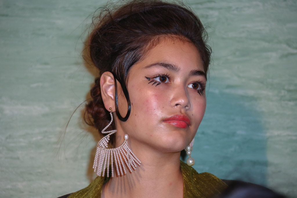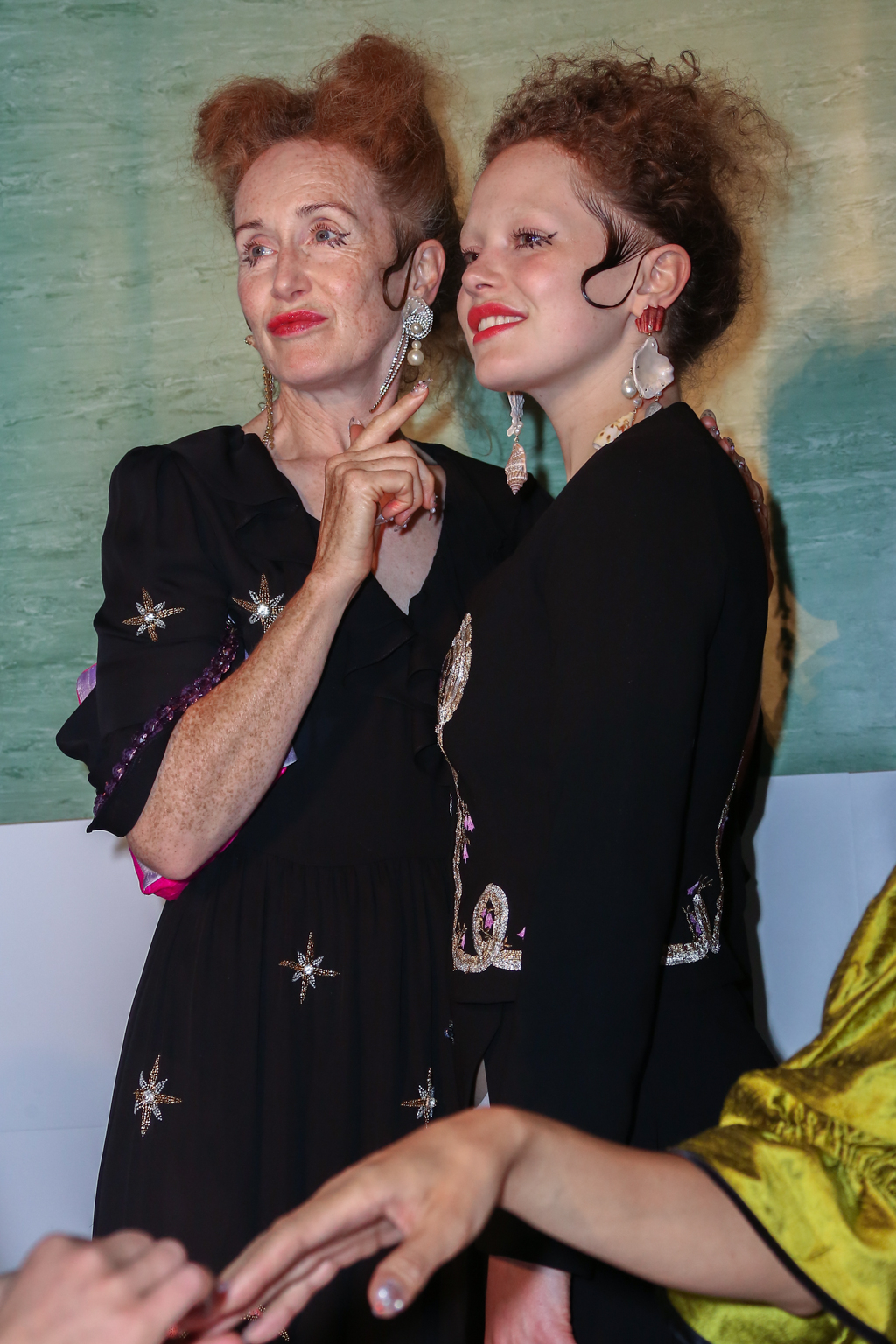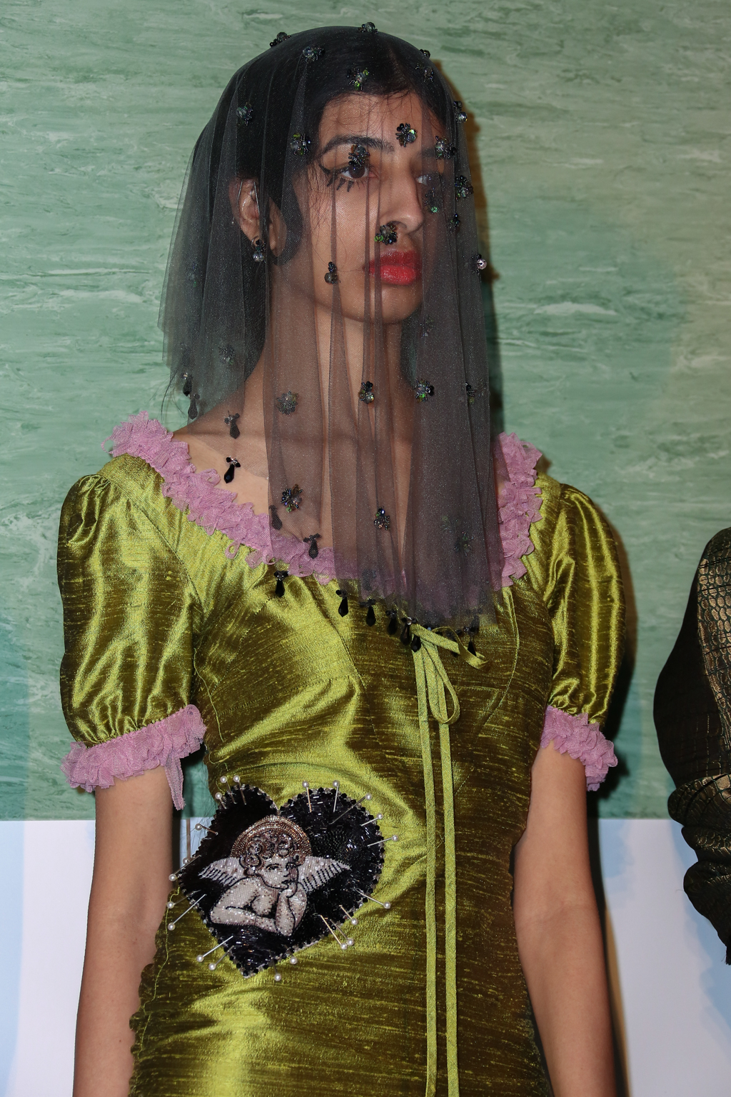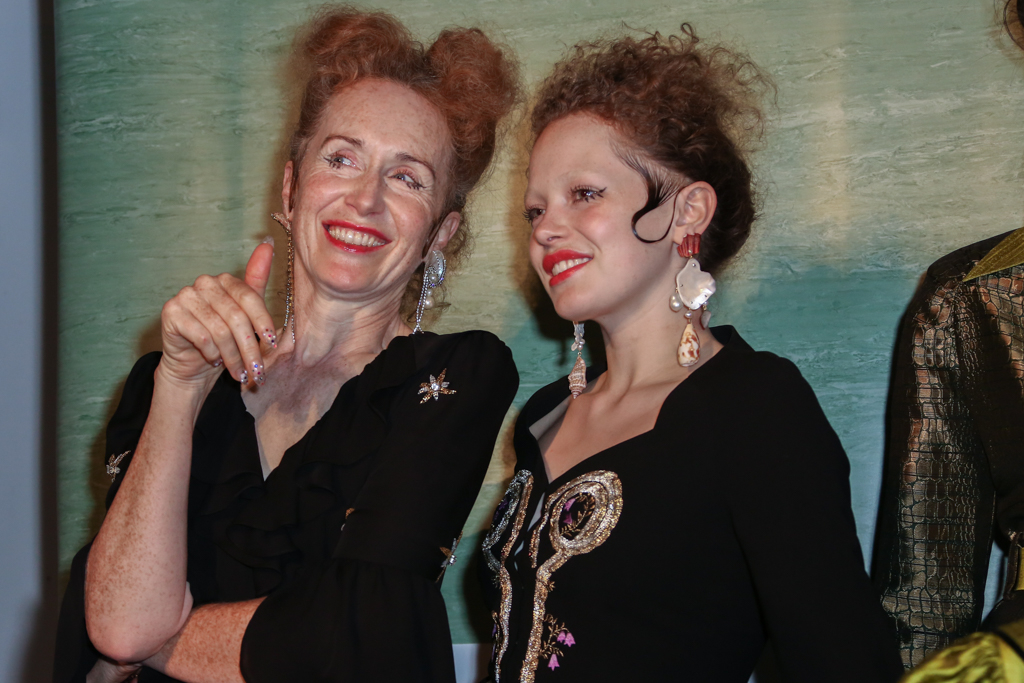 In the same spirit, giant beaded safety pins fastened a thigh-high split in a pencil skirt, blurring the lines between functionality and glamour. Peppiatt had minute detail down to a T – tiny “lover’s eyes” glimmered in lacework embroidery and on robes like a constellation. A curiously alluring juxtaposition of strangeness and charm.
