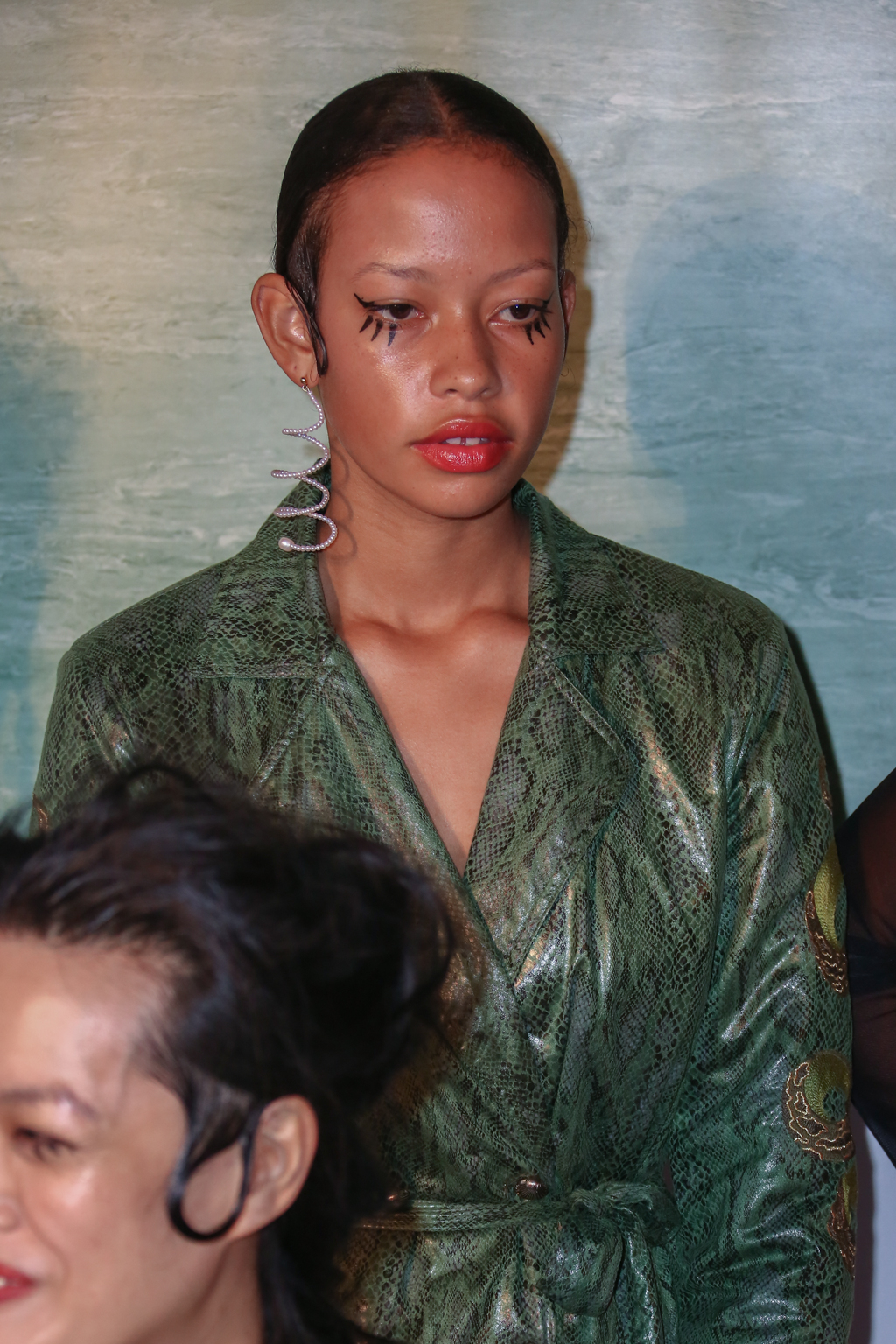 Some motifs were seemingly inspired by sorceresses or voodoo queens. Stars and moons loomed over a jet black calf-length dress. Shimmering serpents coiled around the waists of a skirt, climbed up a jacket and slithered up a trouser leg. Angelic cherubs were appliquéd onto bags and dresses.