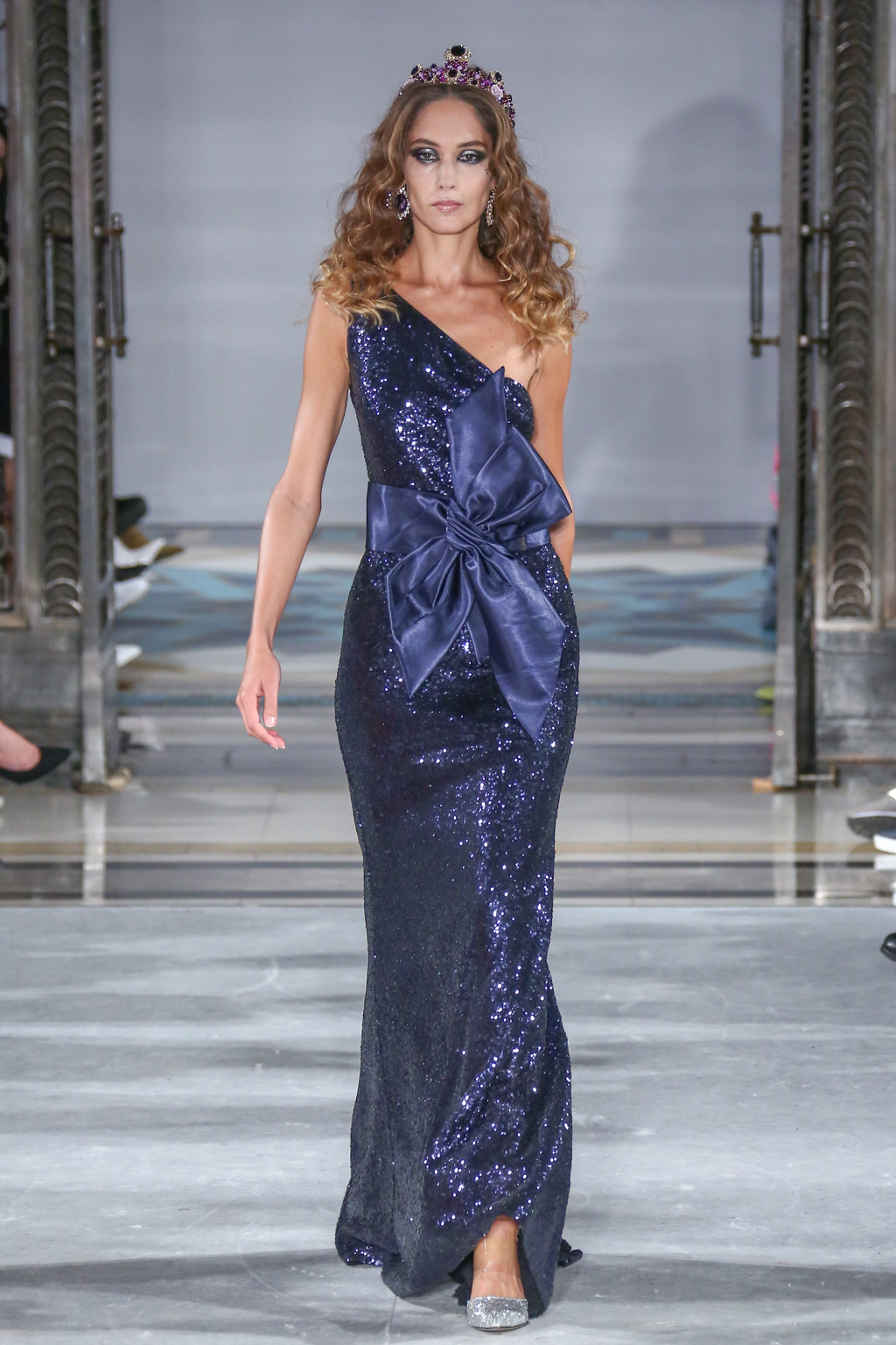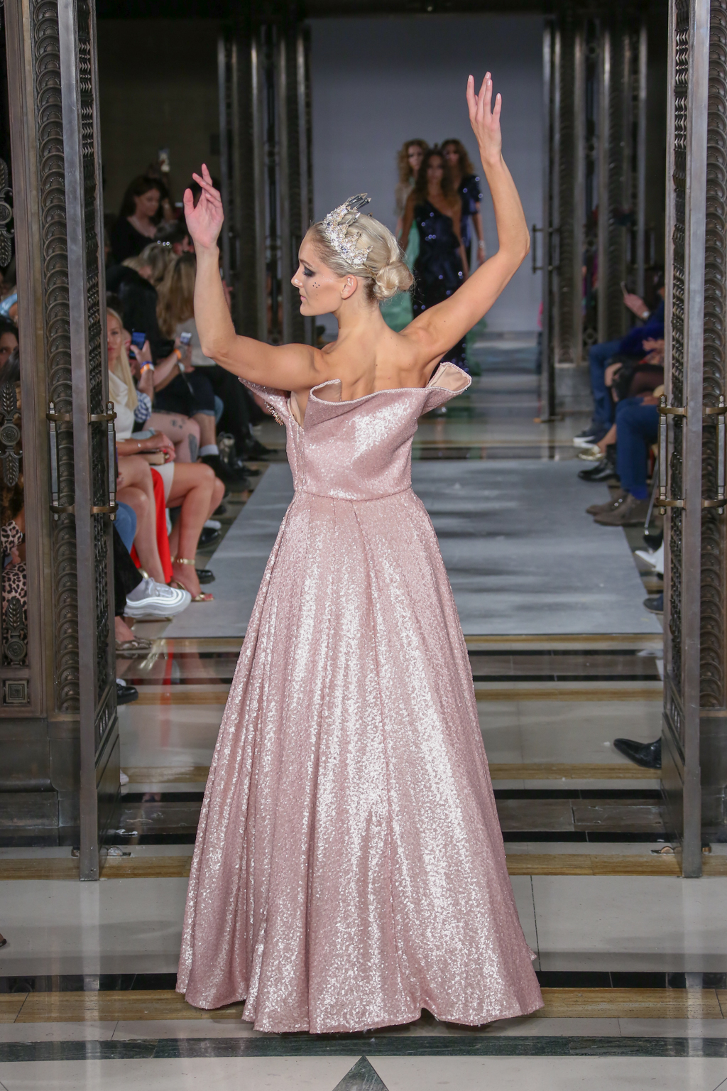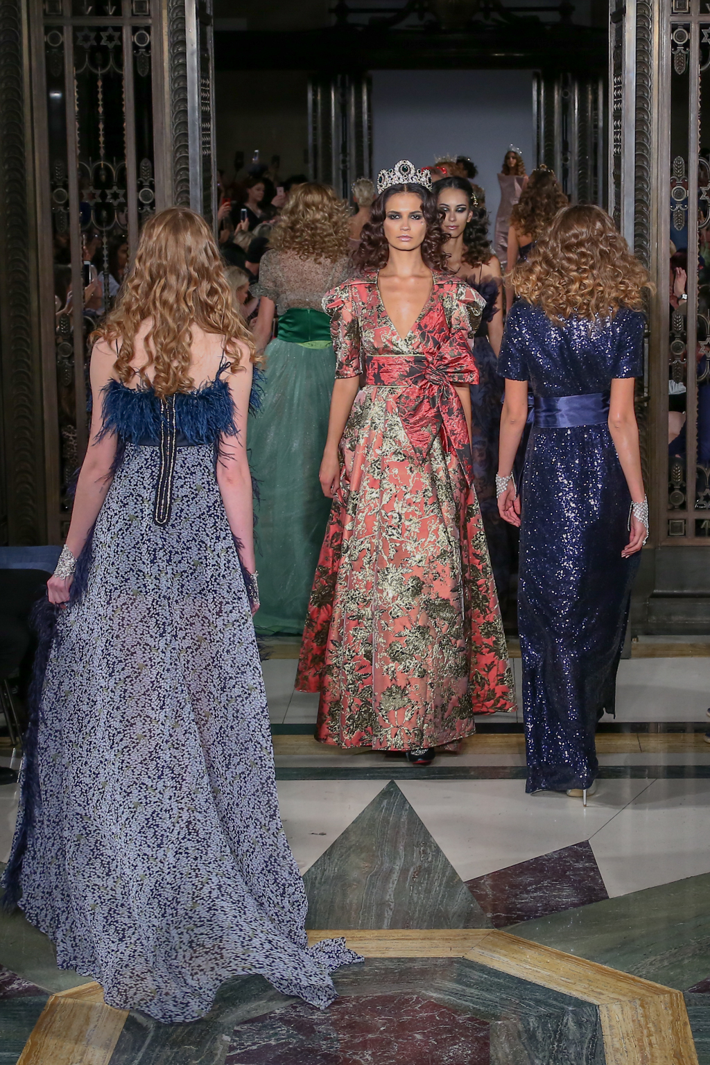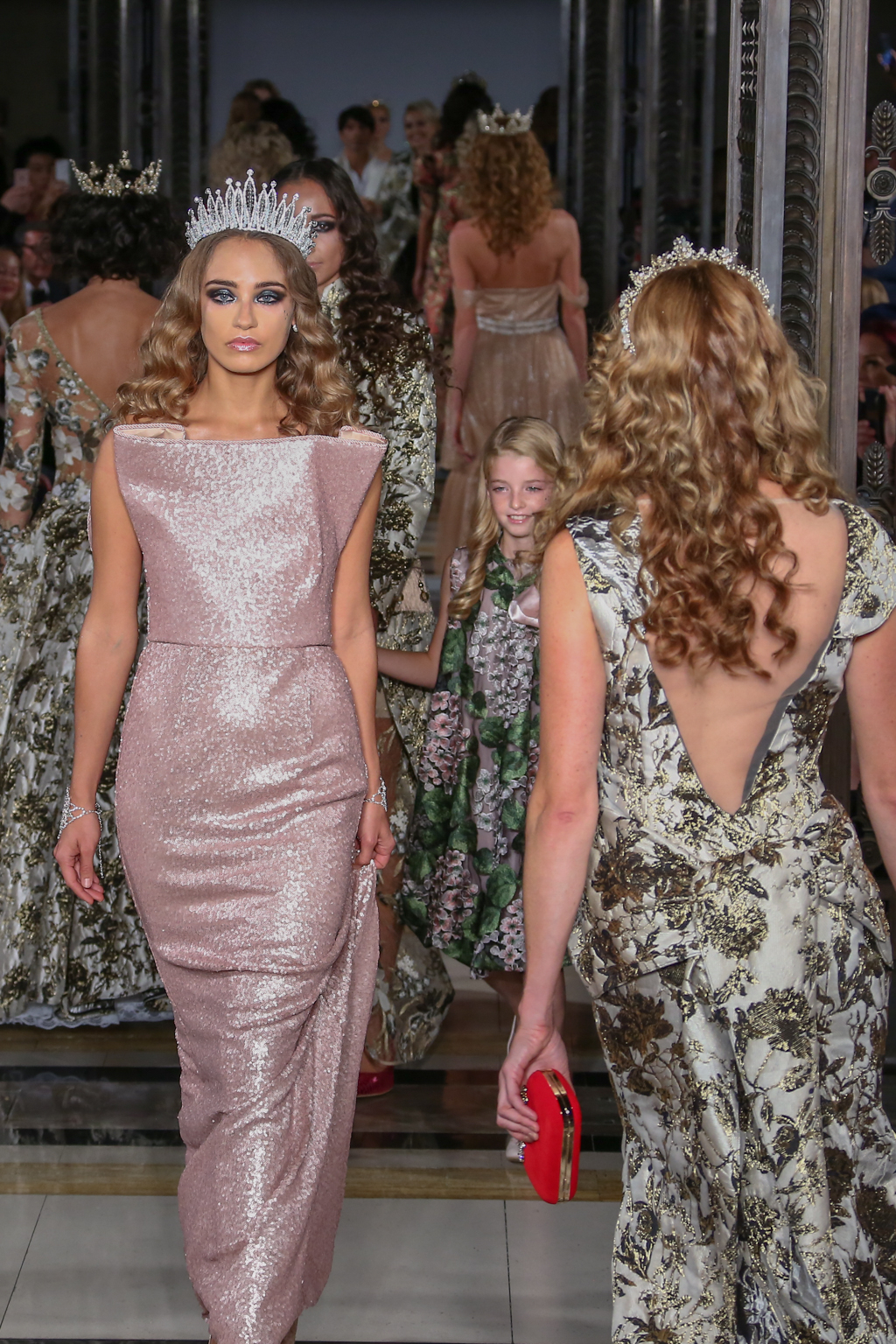 This evolved to a series of even more fanciful gowns fit for a royal queen. To top off these ensembles, models wore rhinestone tiaras, rounding off the story of regality.