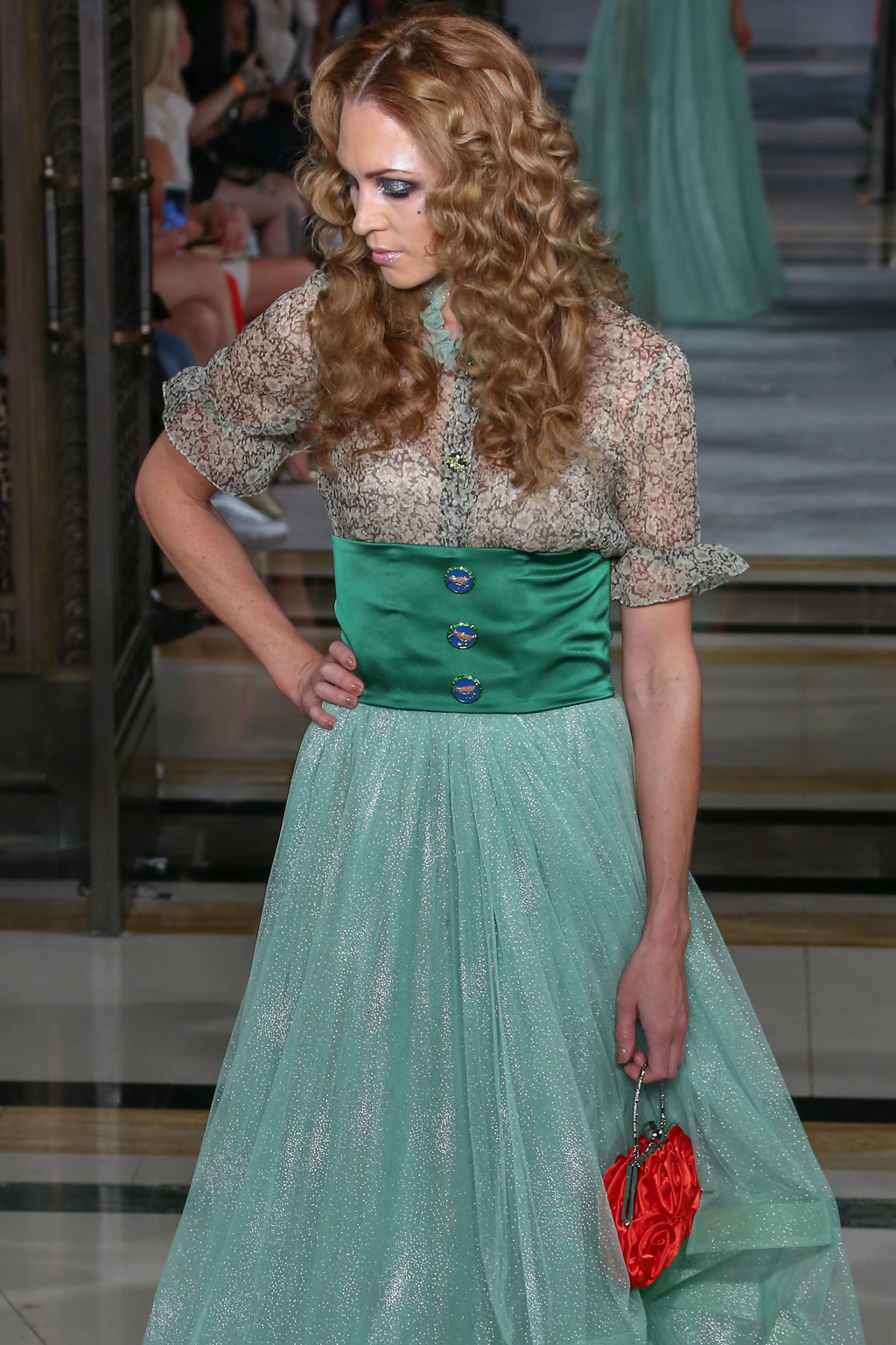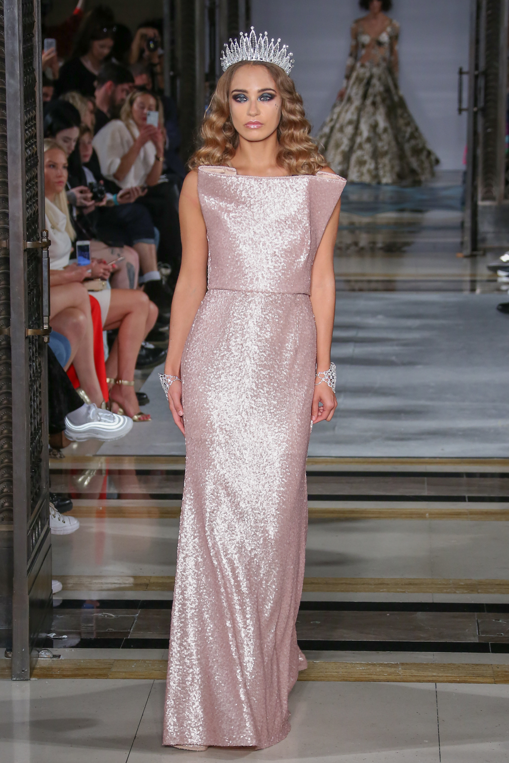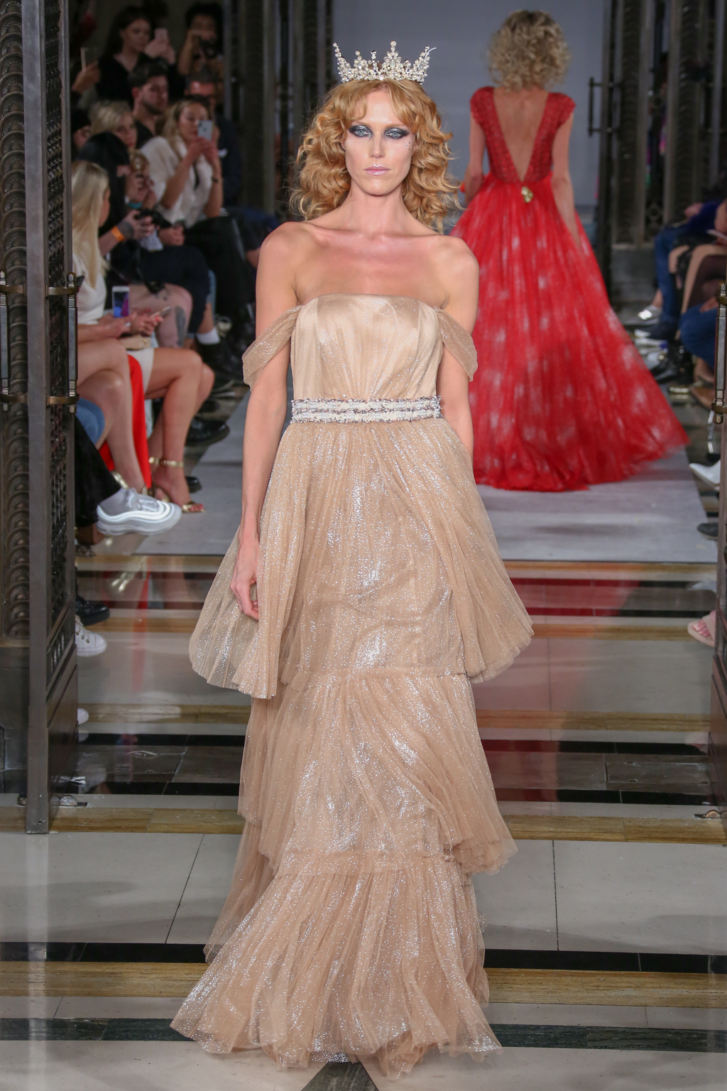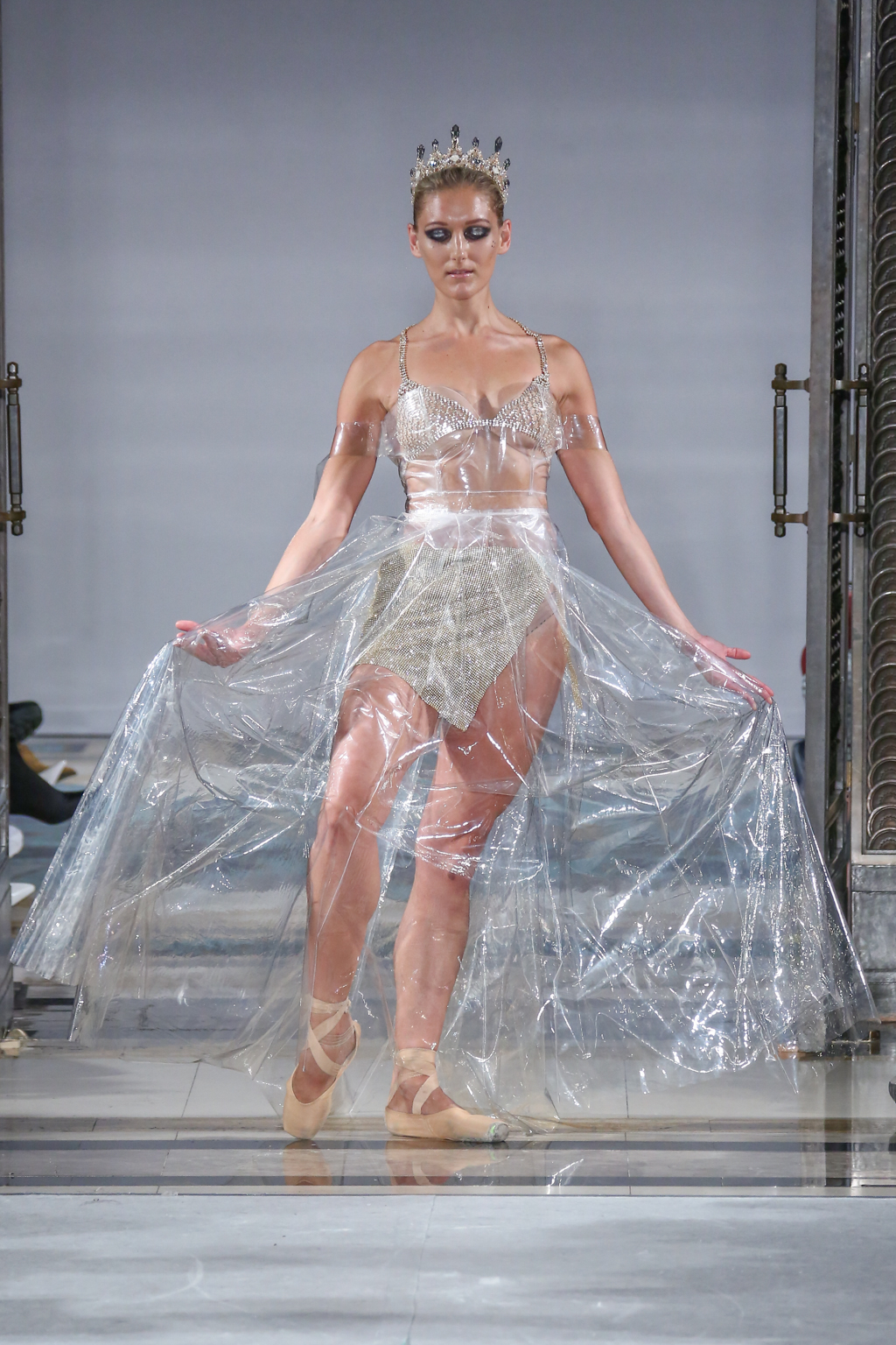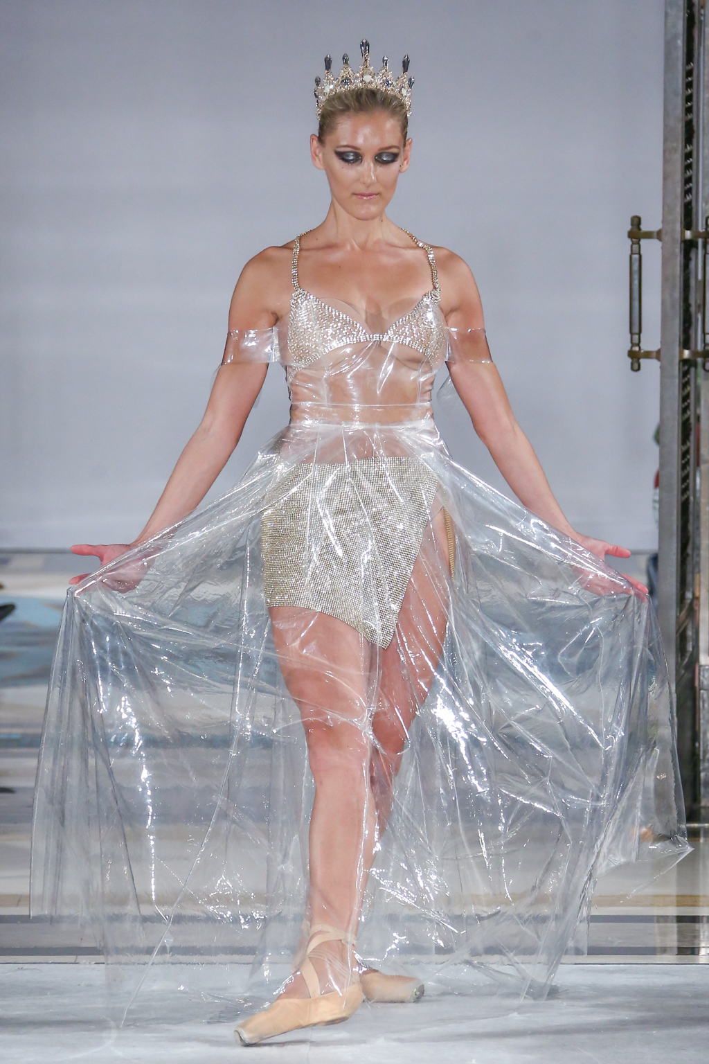This evolved to a series of even more fanciful gowns fit for a royal queen. To top off these ensembles, models wore rhinestone tiaras, rounding off the story of regality.