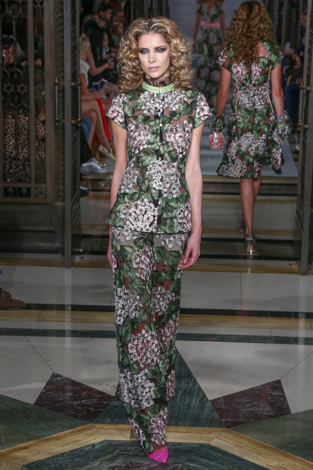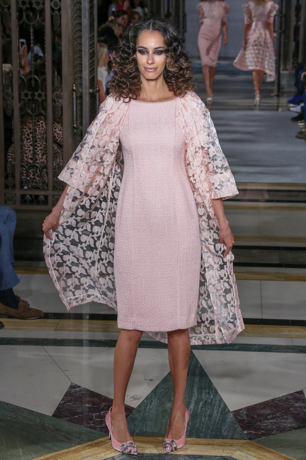 Opening with an instalment of powder pink, bouclé skirts, dresses and jackets were reminiscent of First Lady Jackie Kennedy. They were met with a floral garden of appliquéd hydrangea and other botanics on sheer fabric, emphasising a sensual femininity.