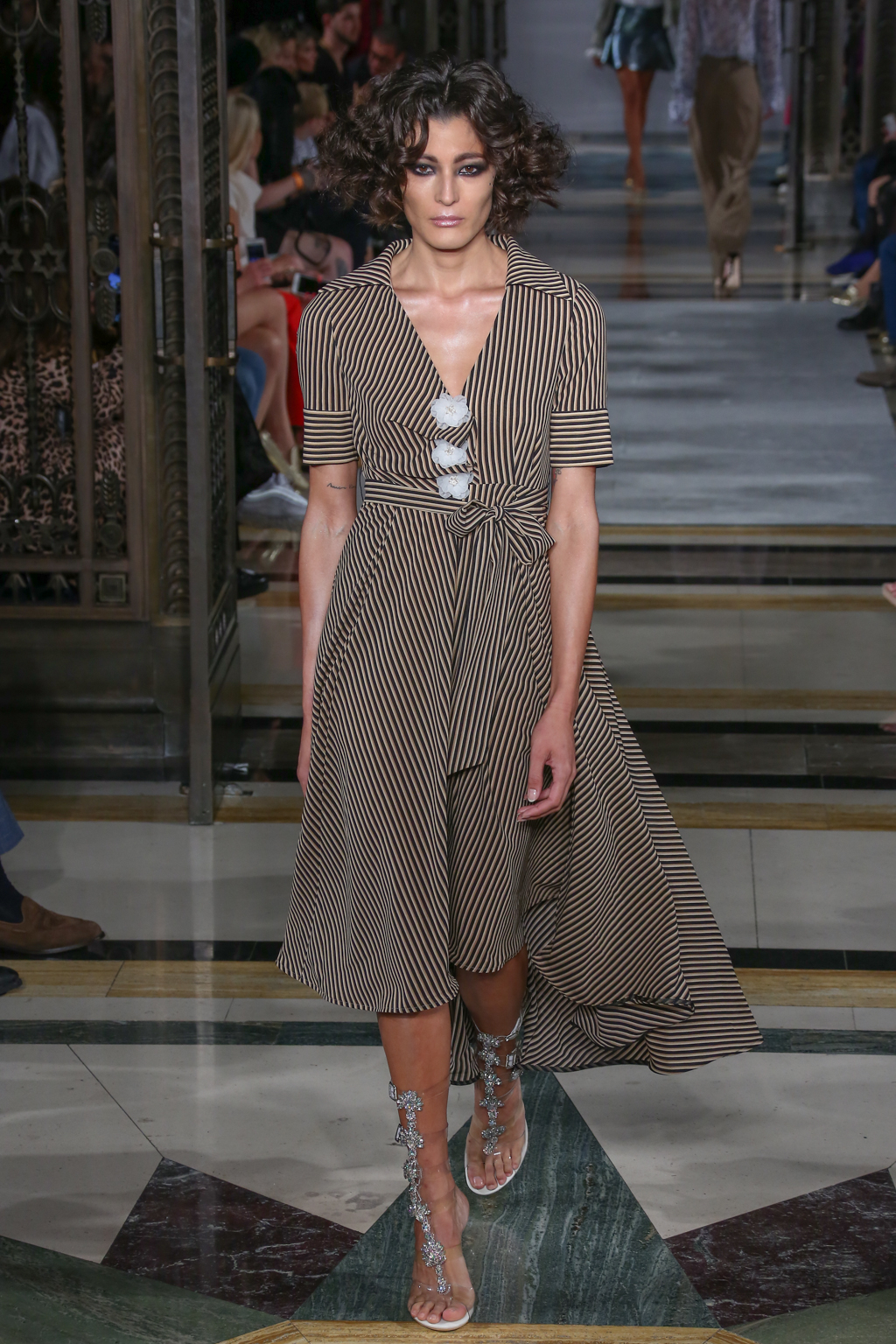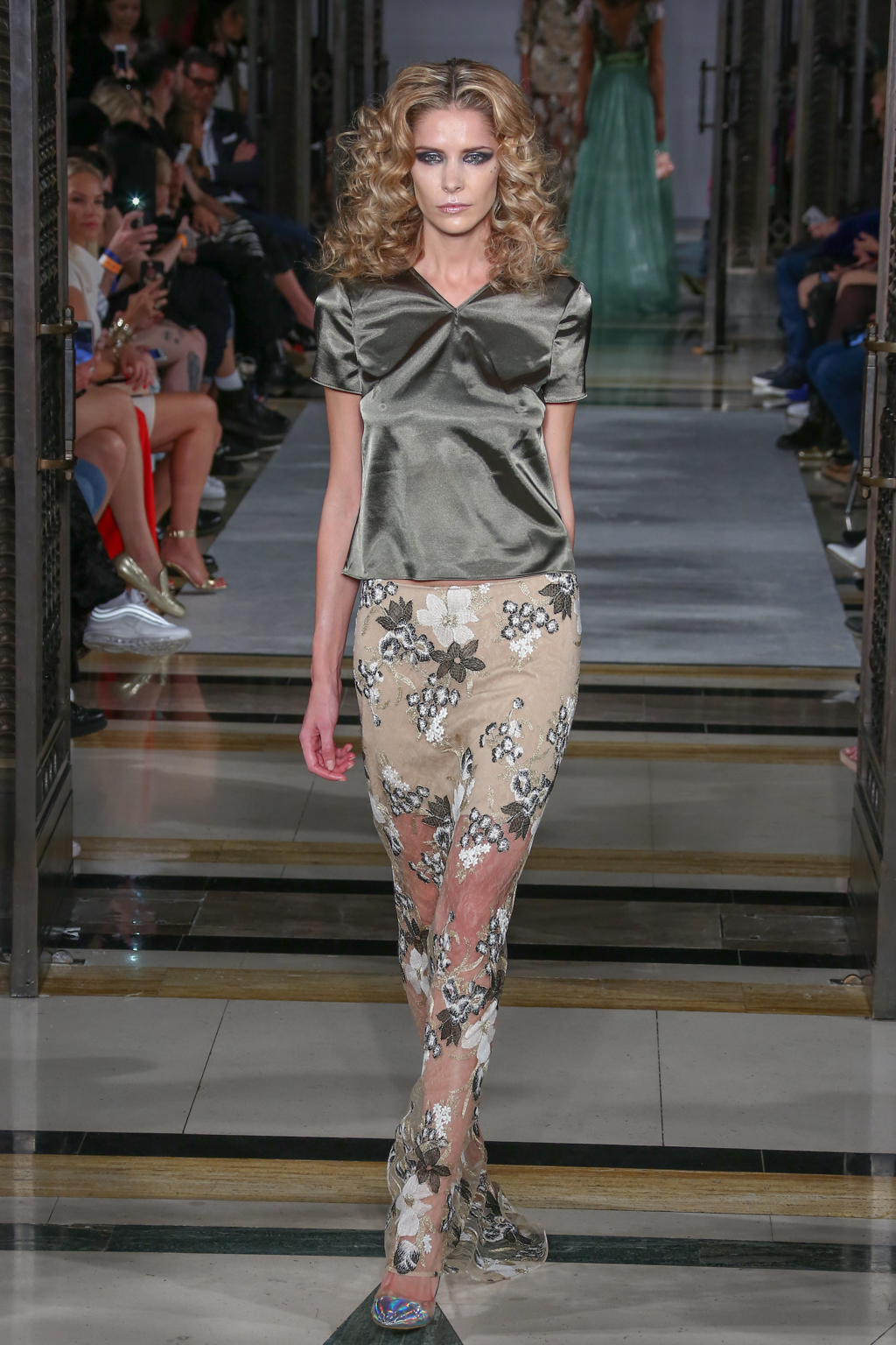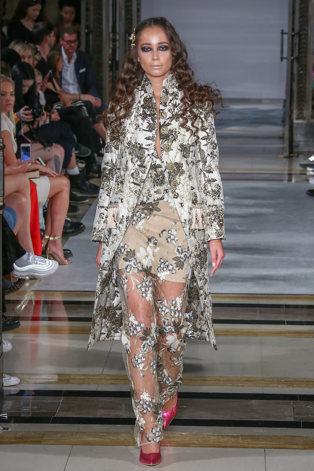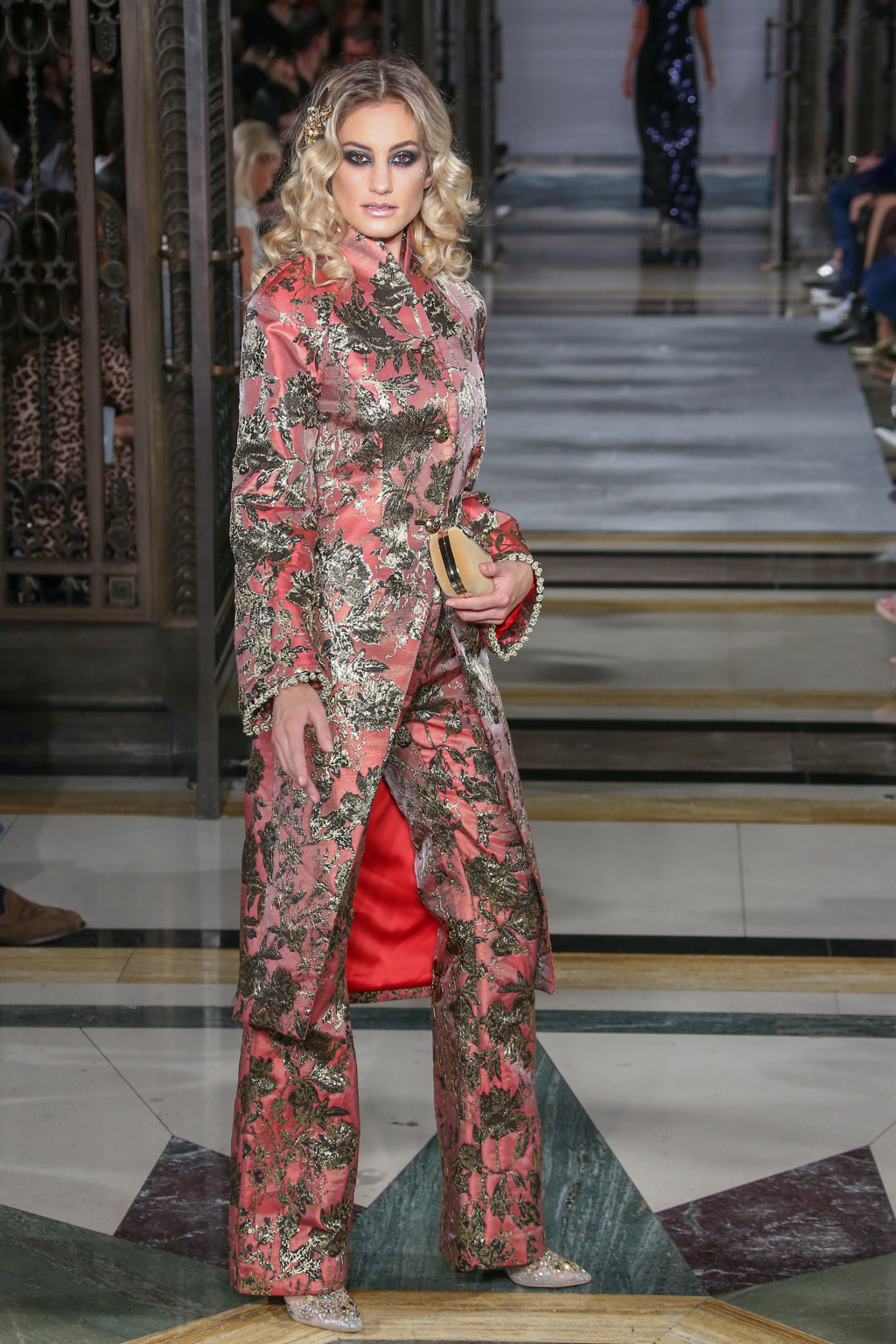 Lavish fabrics such as satin – which was used in tailored jackets paired with flowing wide-leg trousers; organza and dramatic gilded brocade coats worn on top of coordinating dresses – made for a frivolously feminine theme.