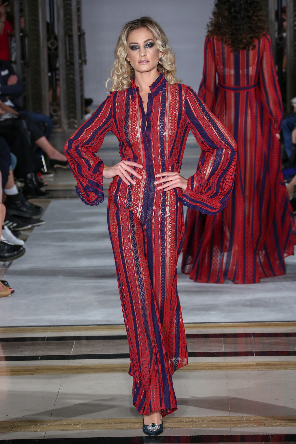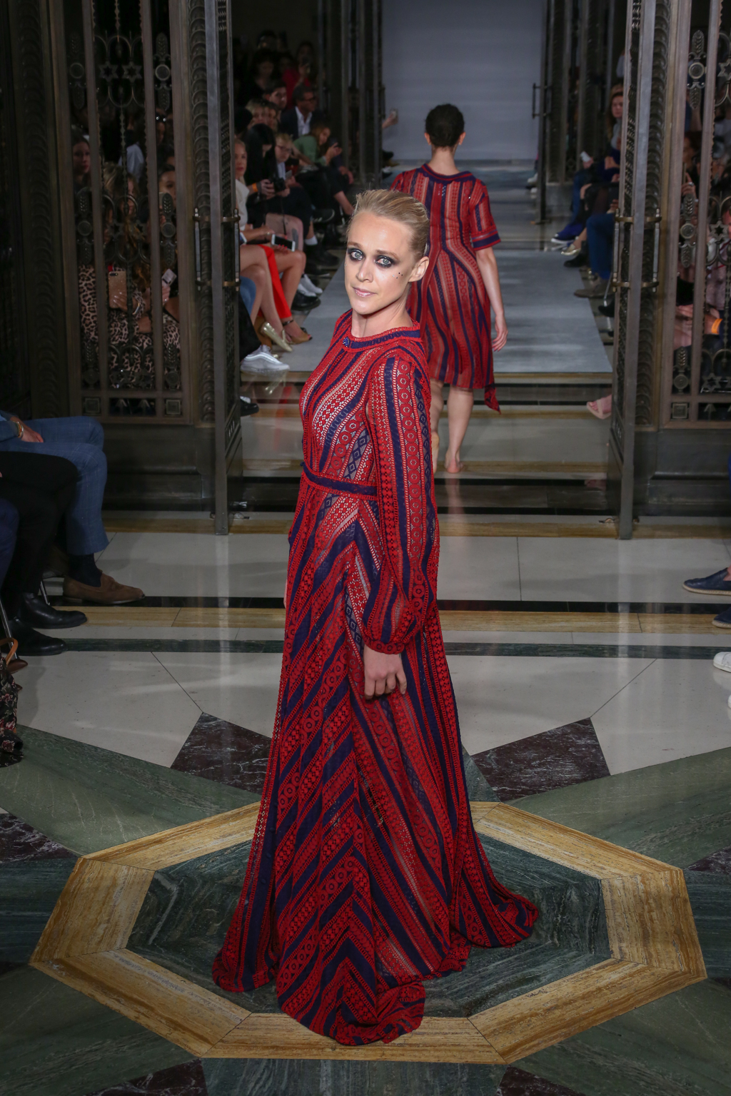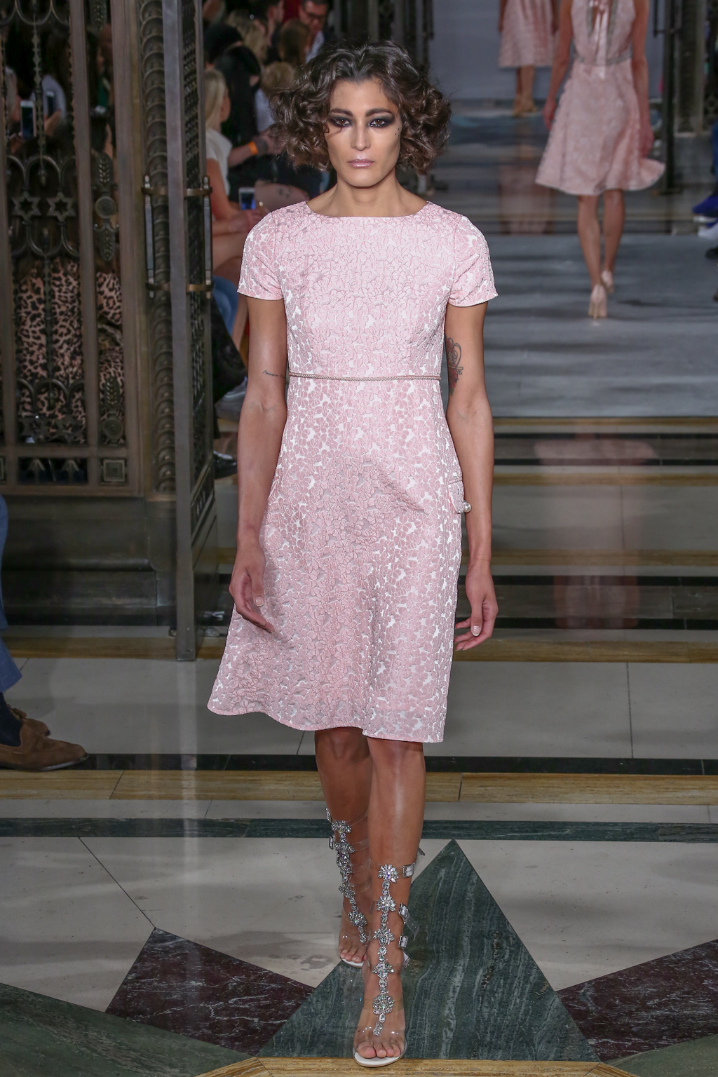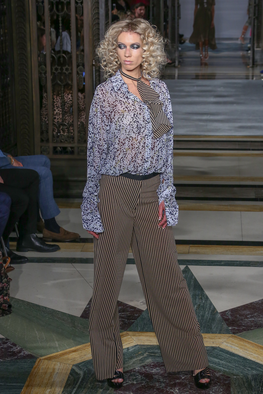 Lavish fabrics such as satin – which was used in tailored jackets paired with flowing wide-leg trousers; organza and dramatic gilded brocade coats worn on top of coordinating dresses – made for a frivolously feminine theme.