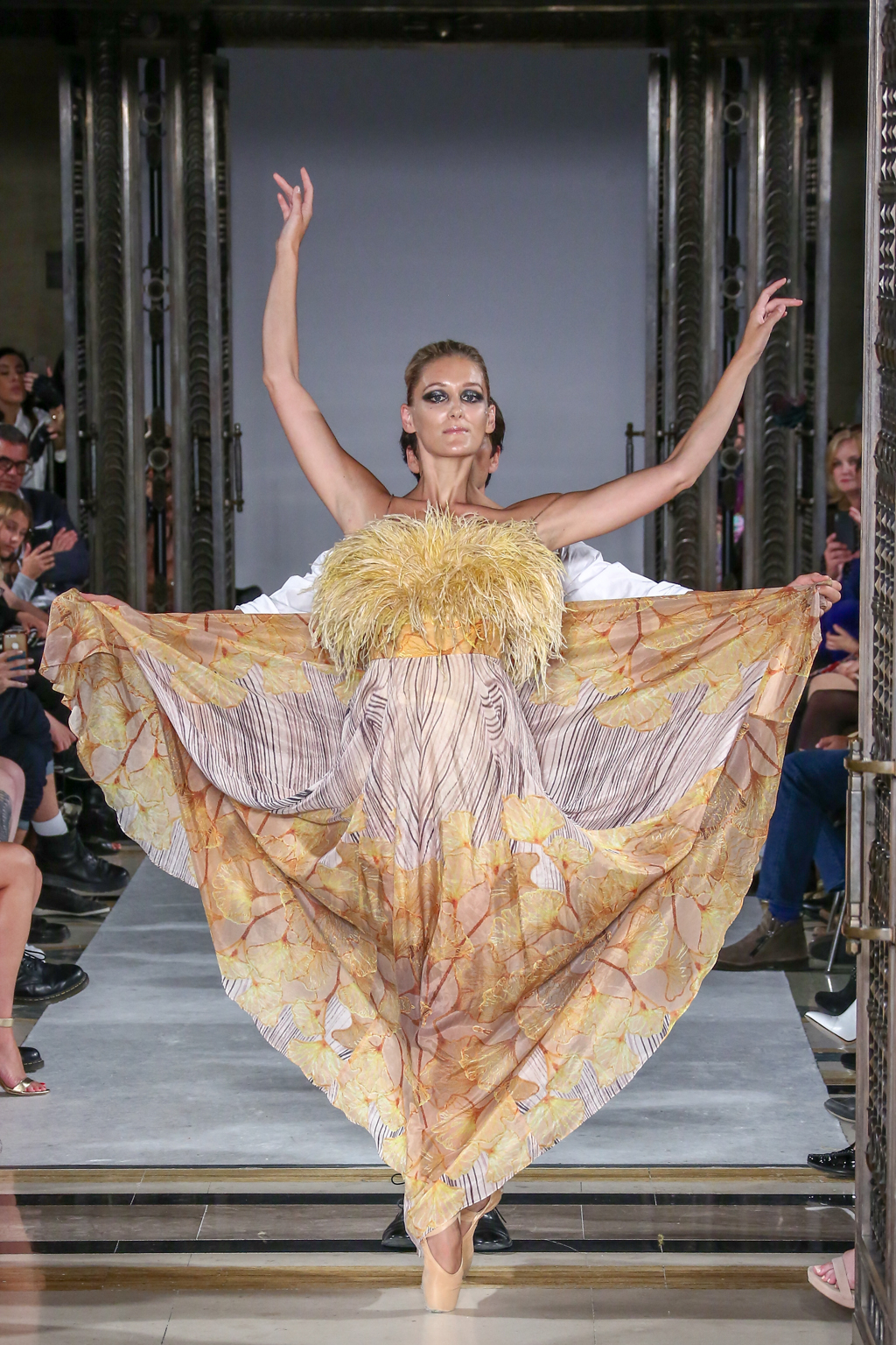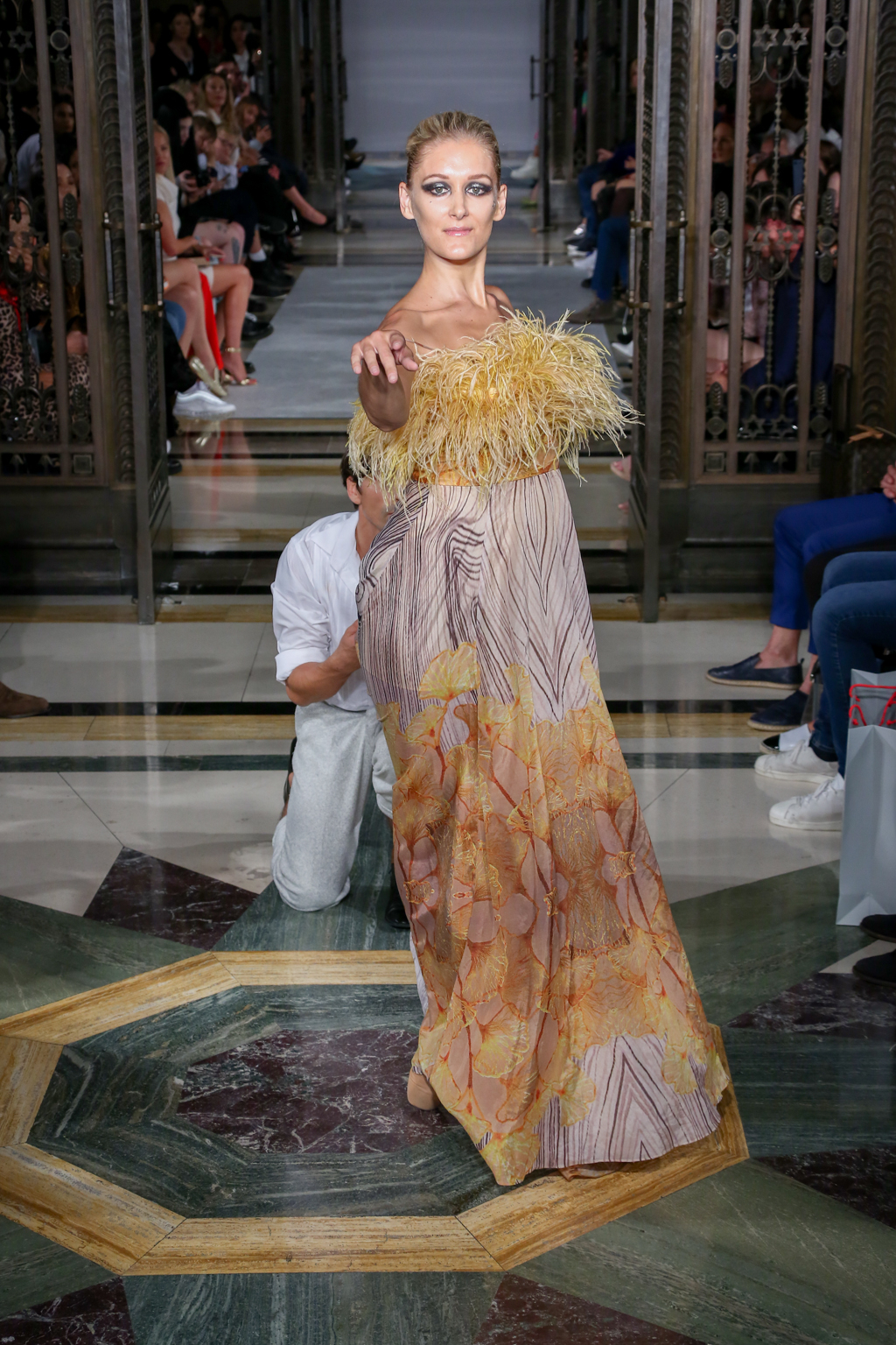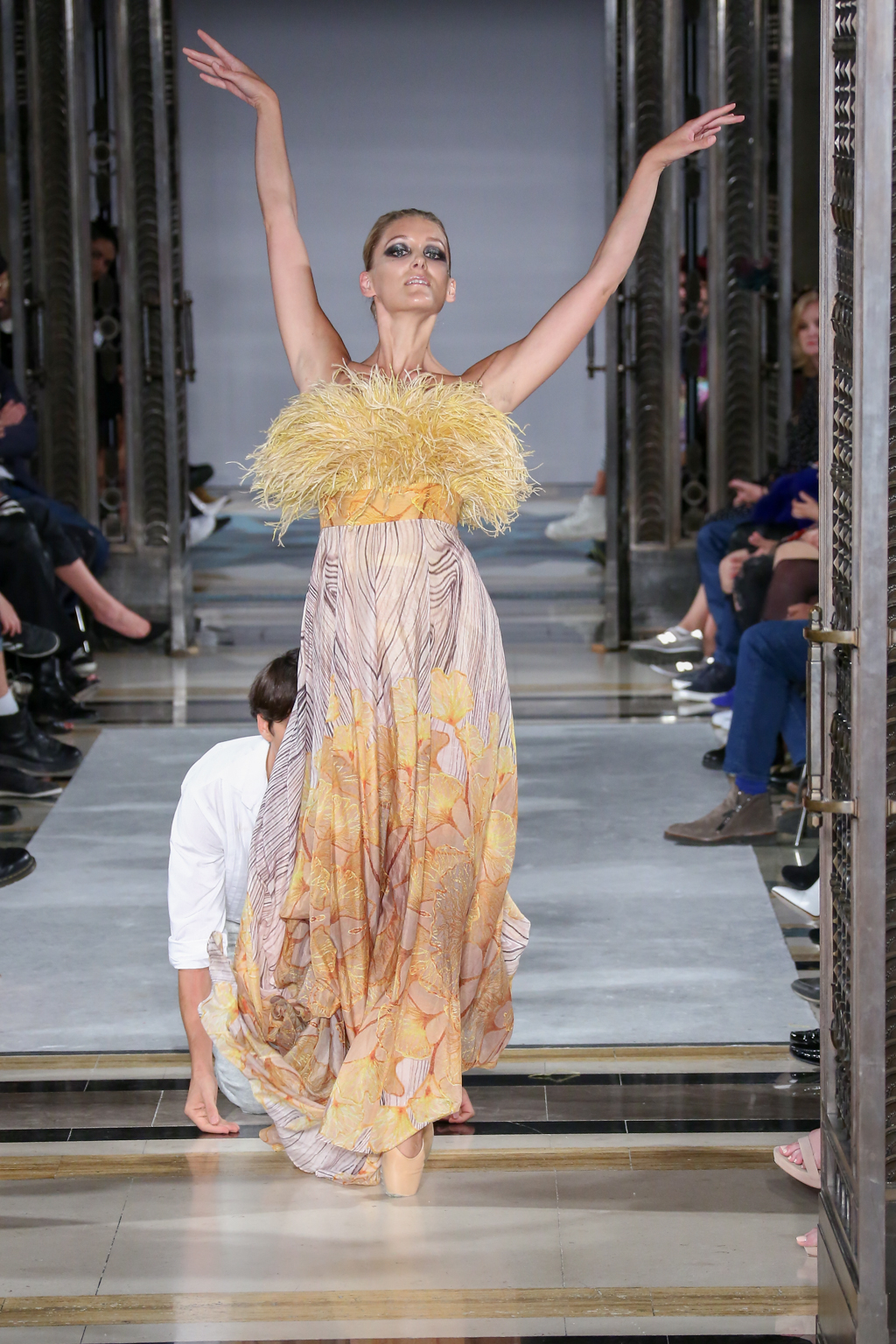 A colour palette of green, gold and midnight blue followed. Oversized bows tied across glamorous gowns, sequins and sweeping hemlines recalled pageantry. This was shortly before another burst of dramatic dance performances down the catwalk, which emphasised Rohmir’s obsession with drama. In one performance, a clear PVC trenchcoat initially signalled a diversion from the theme, yet even that had a touch of detail via metallic trimmings. Meanwhile, buttercup yellow Maribou feathers flounced across the top of a strapless dress with distorted woodland print.