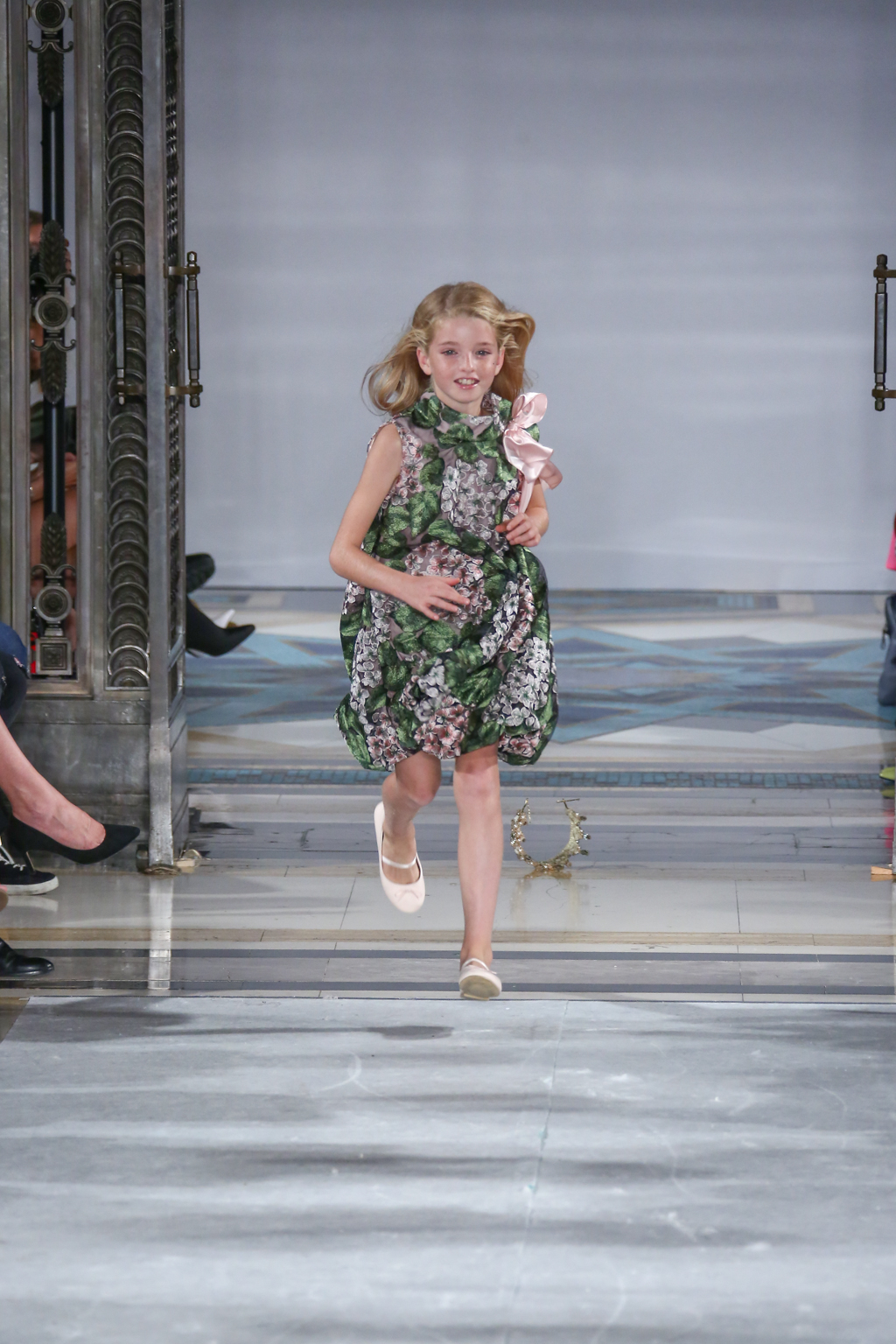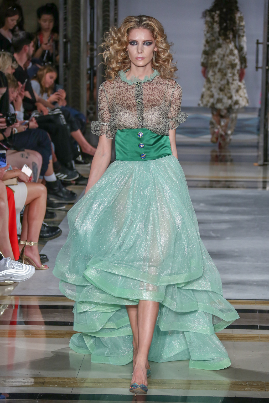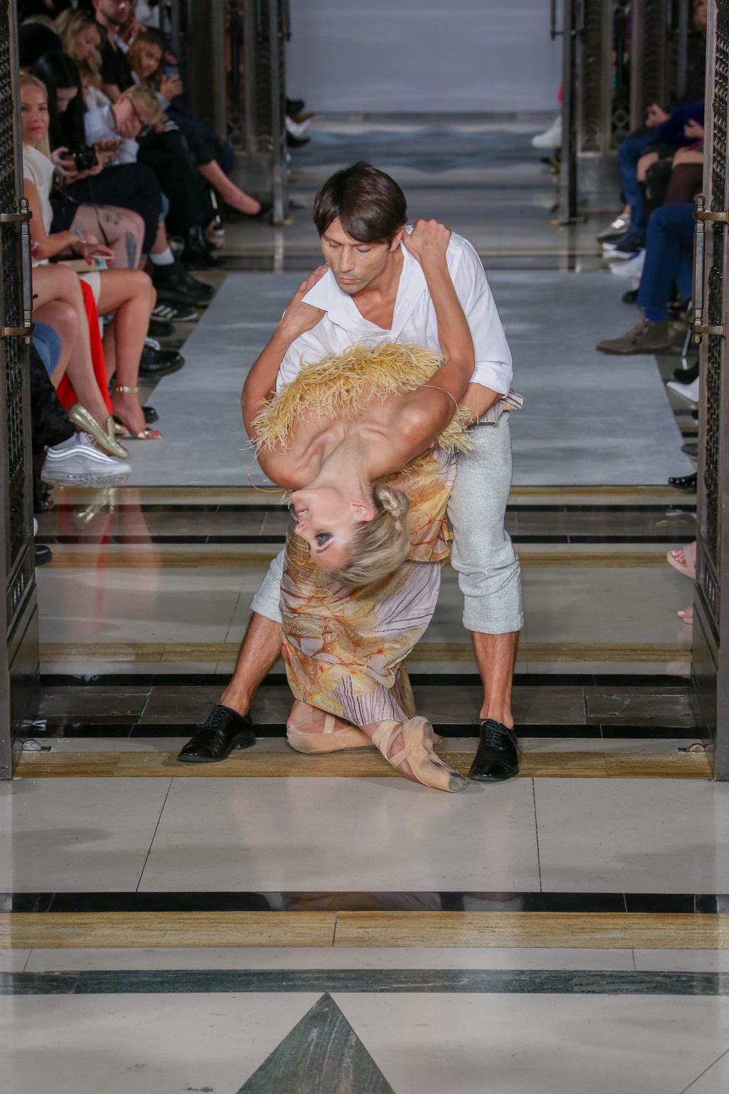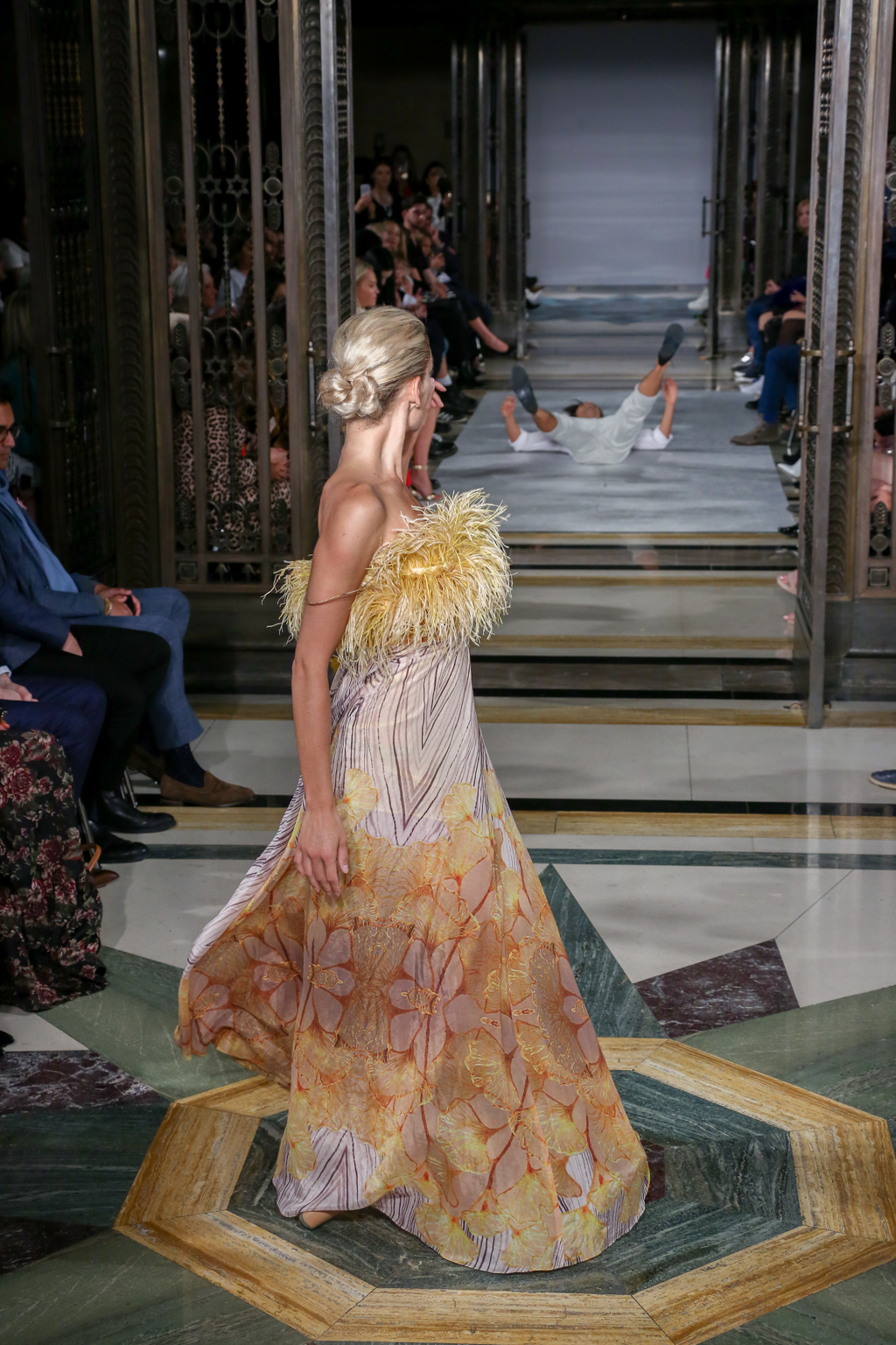 A colour palette of green, gold and midnight blue followed. Oversized bows tied across glamorous gowns, sequins and sweeping hemlines recalled pageantry. This was shortly before another burst of dramatic dance performances down the catwalk, which emphasised Rohmir’s obsession with drama. In one performance, a clear PVC trenchcoat initially signalled a diversion from the theme, yet even that had a touch of detail via metallic trimmings. Meanwhile, buttercup yellow Maribou feathers flounced across the top of a strapless dress with distorted woodland print.