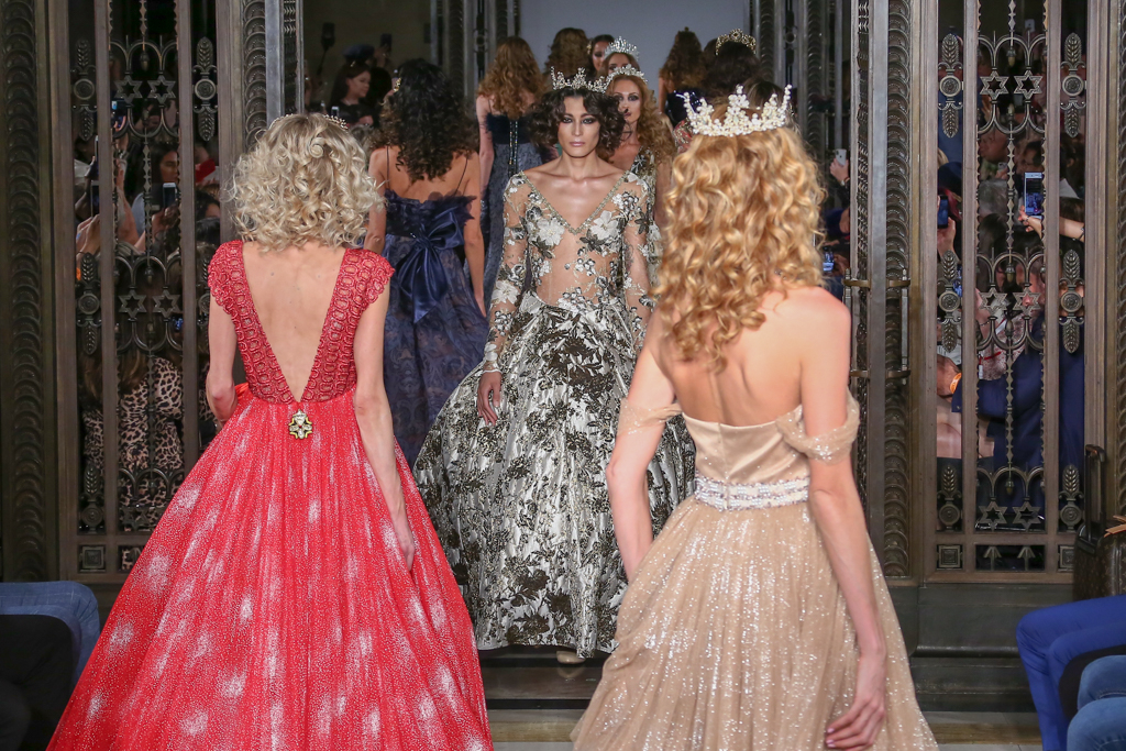 Rohmir’s expansive SS19 collection painted a fairytale full of evening gowns, excessive drama and elaborate performance.