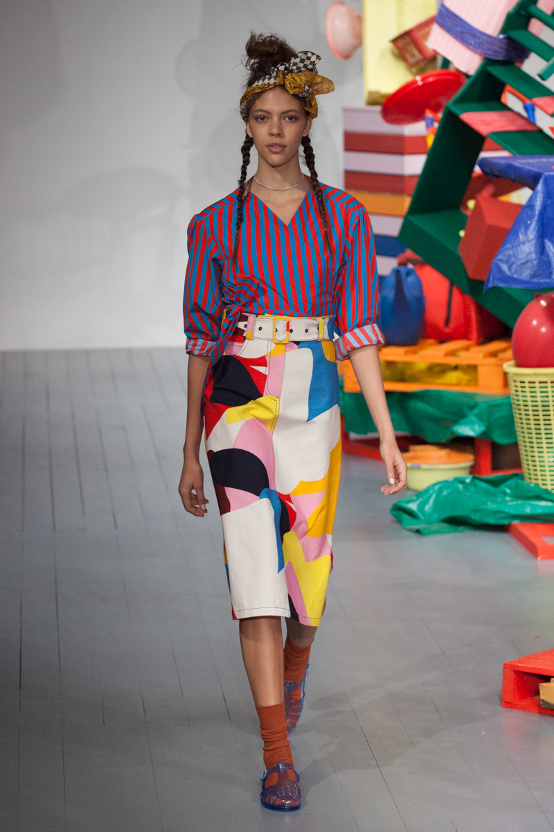 A playground colour clash of bright yellow, pink, blue and red were mixed with more muted navy, khaki and rust to create abstract prints and patterns. The playful colour palette interpreted the vibrant chaos, eclecticism and randomness of the Nigerian Balogun Market, as captured by artist and photographer Lorenzo Vitturi.