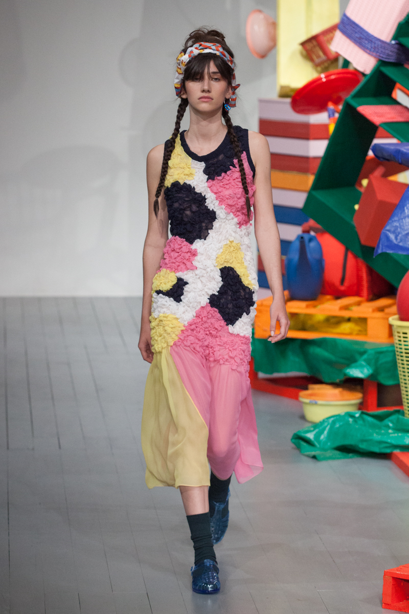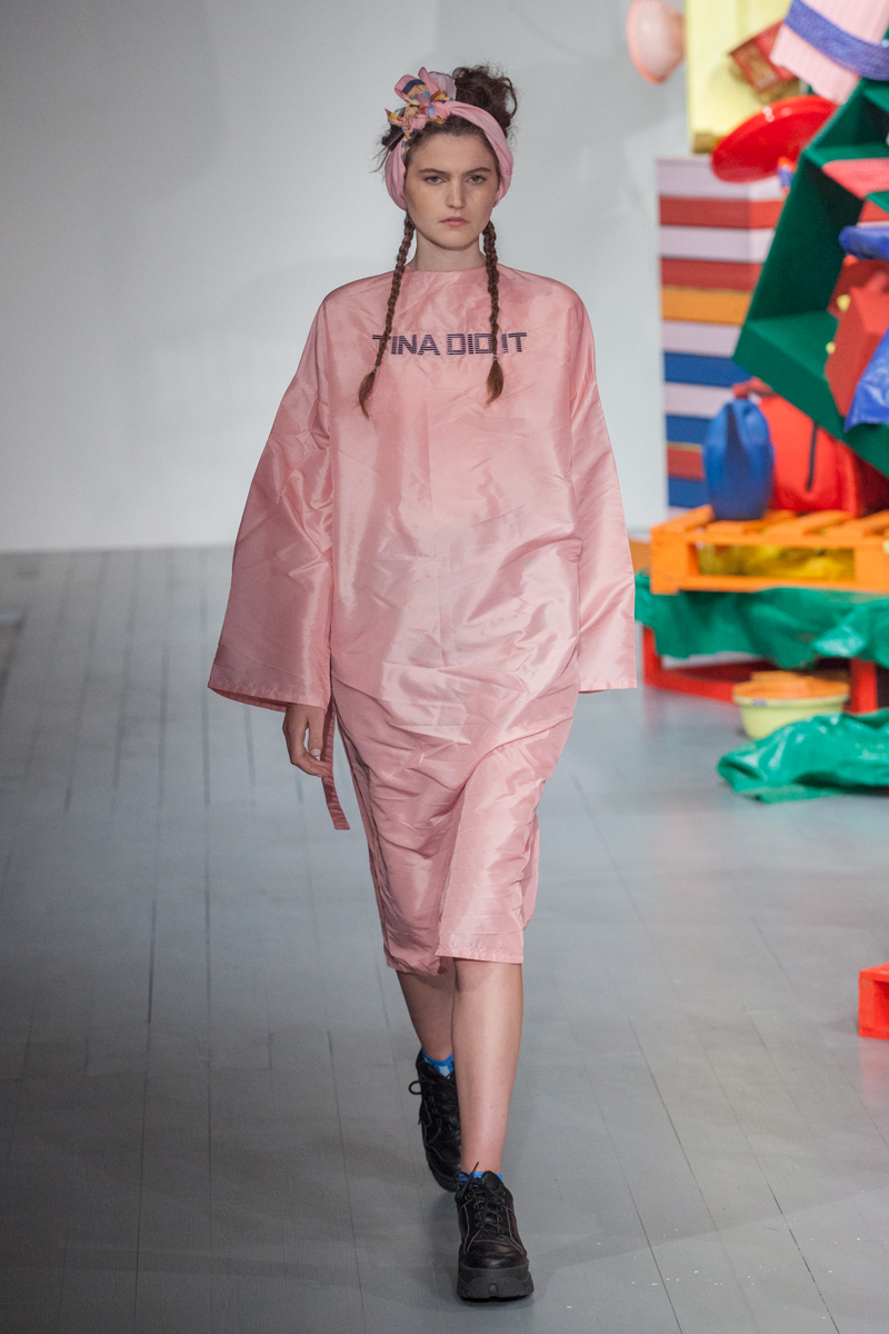 Metallic slogan sweatshirts in candy pink, sandstone and vermillion, styled with pushed up sleeves and worn on top of popped collar shirts, added an additional facet of quirky preppiness. Looks were completed with sweet patterned head ties and socks worn with jelly sandals, emphasising Minki’s unique kookiness.