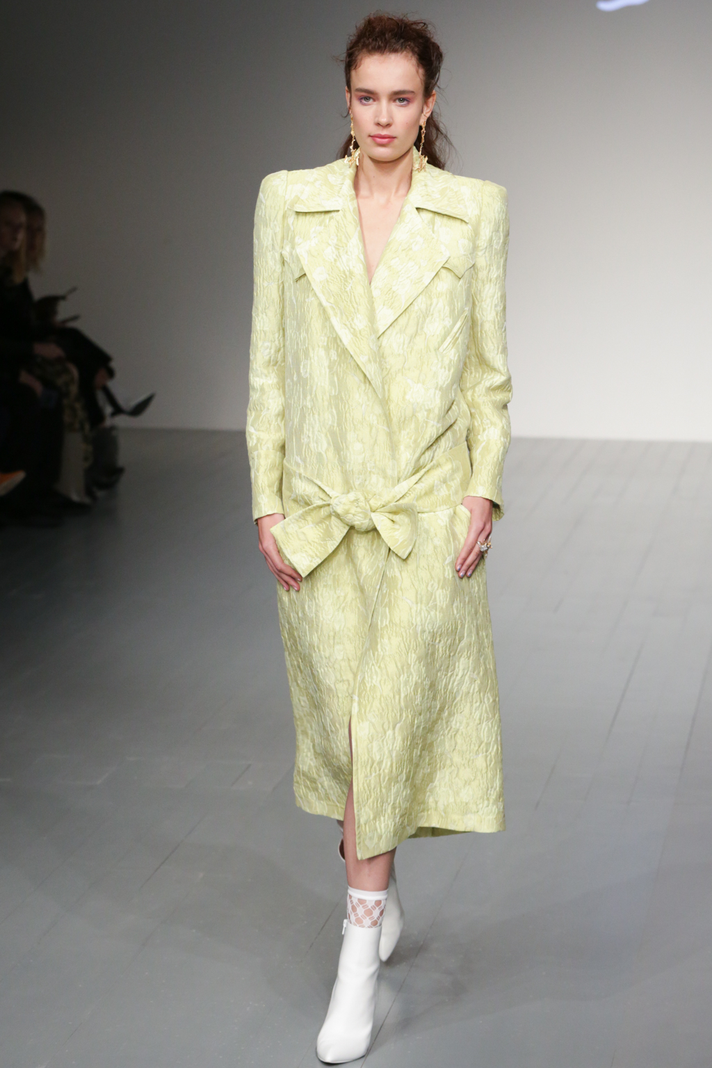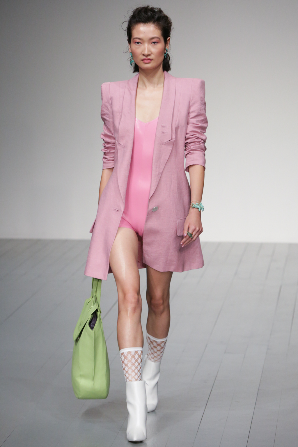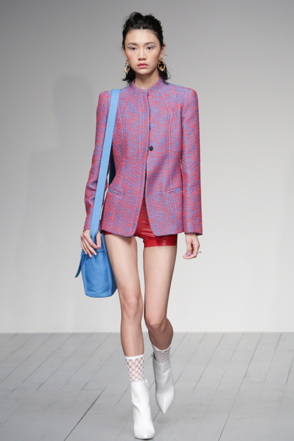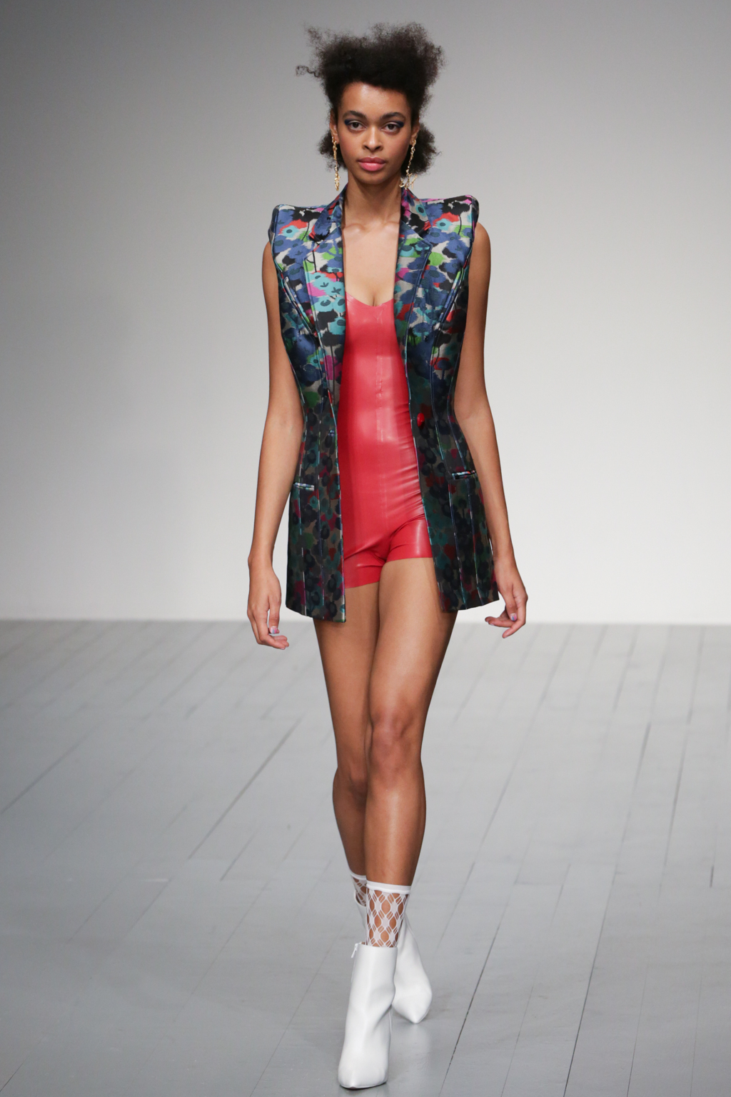 The pleasant surprise was a sports luxe theme that arose through vibrant bodysuits shielded with longline tailored jackets in complementary hues. Styled with quiffed hair, ankle boots and fishnet socks, these looks created a welcome sense of 80s nostalgia.