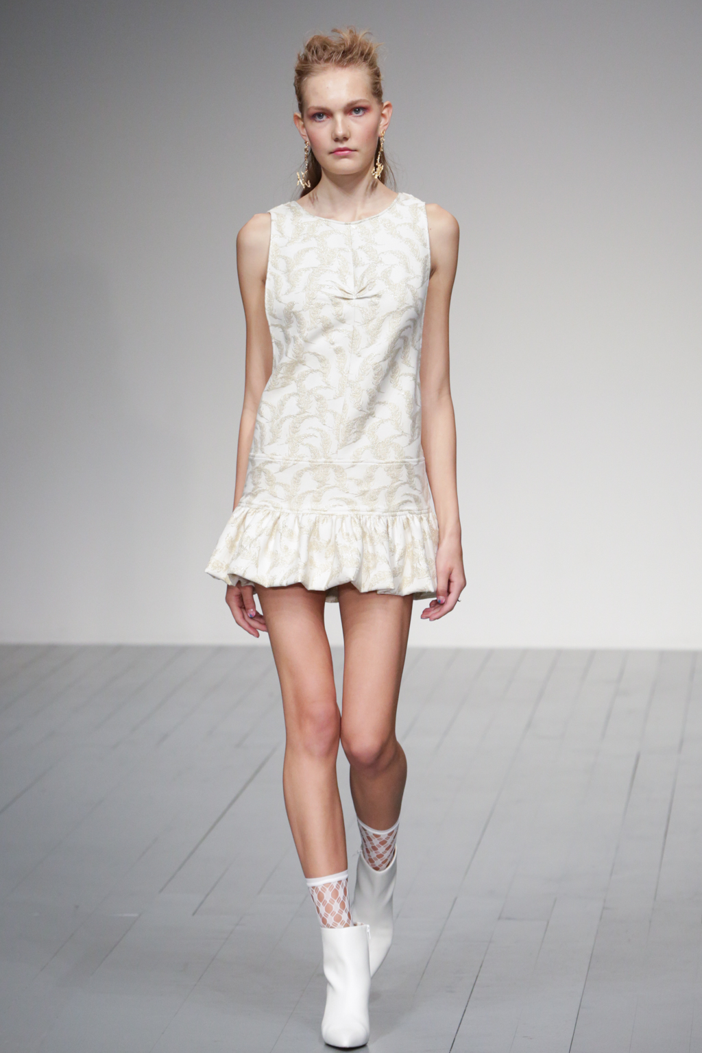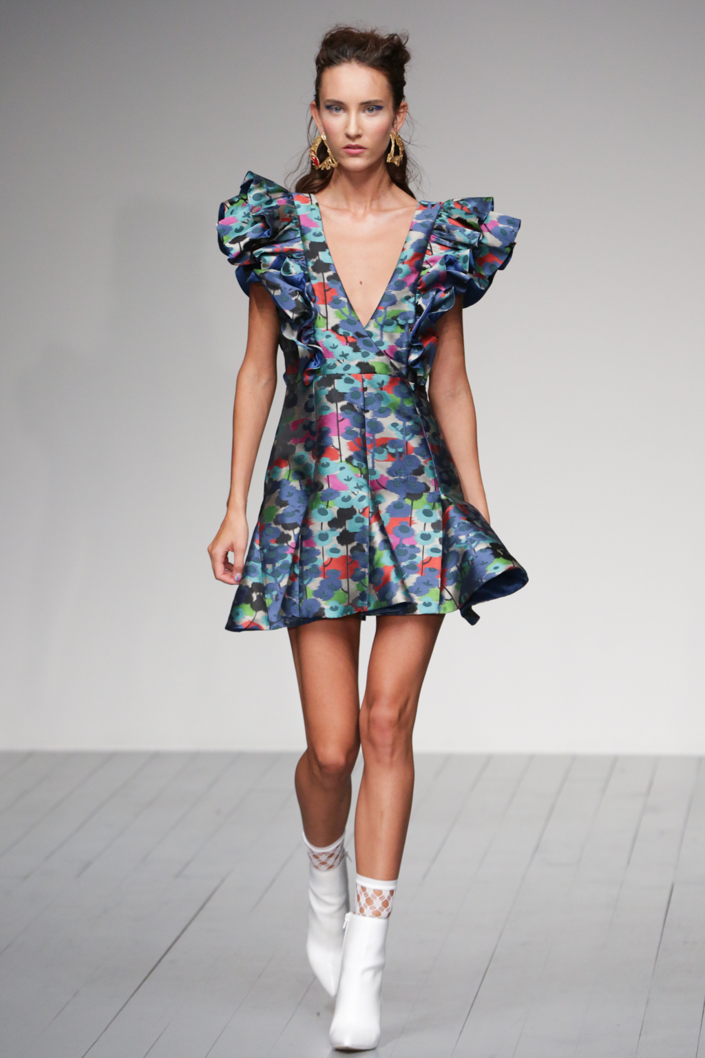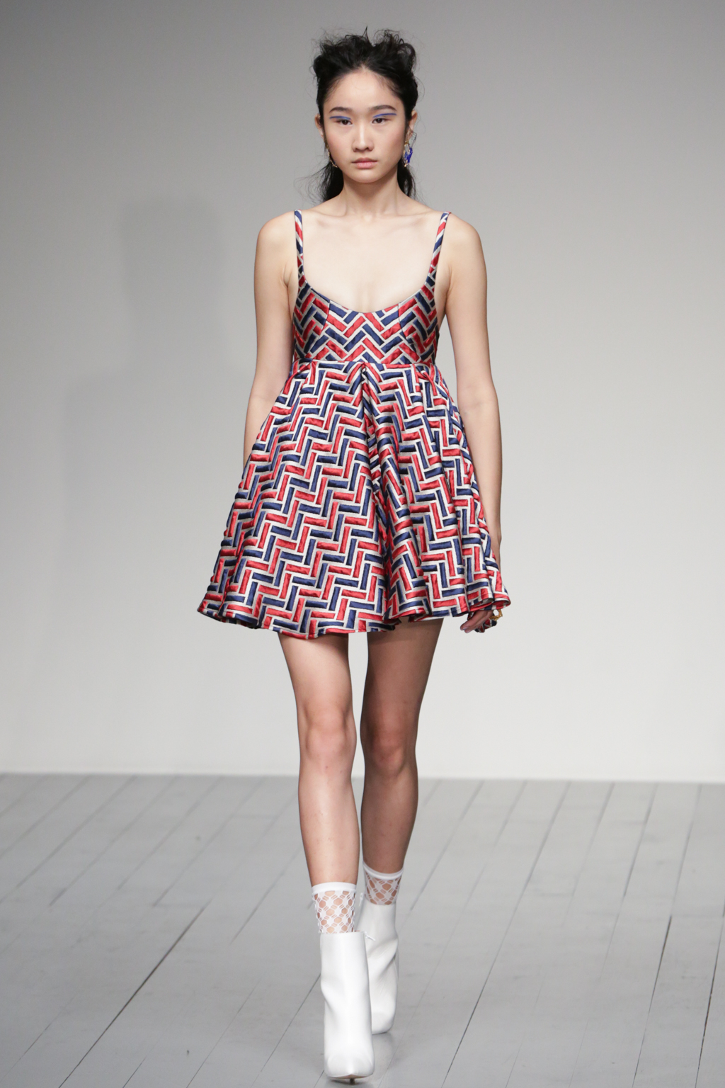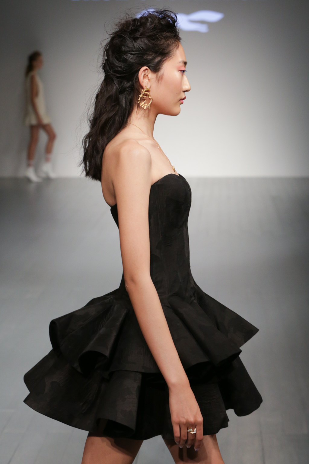 The pleasant surprise was a sports luxe theme that arose through vibrant bodysuits shielded with longline tailored jackets in complementary hues. Styled with quiffed hair, ankle boots and fishnet socks, these looks created a welcome sense of 80s nostalgia.