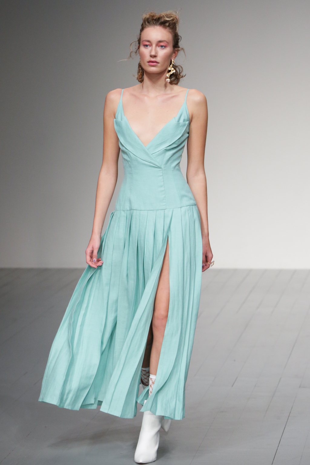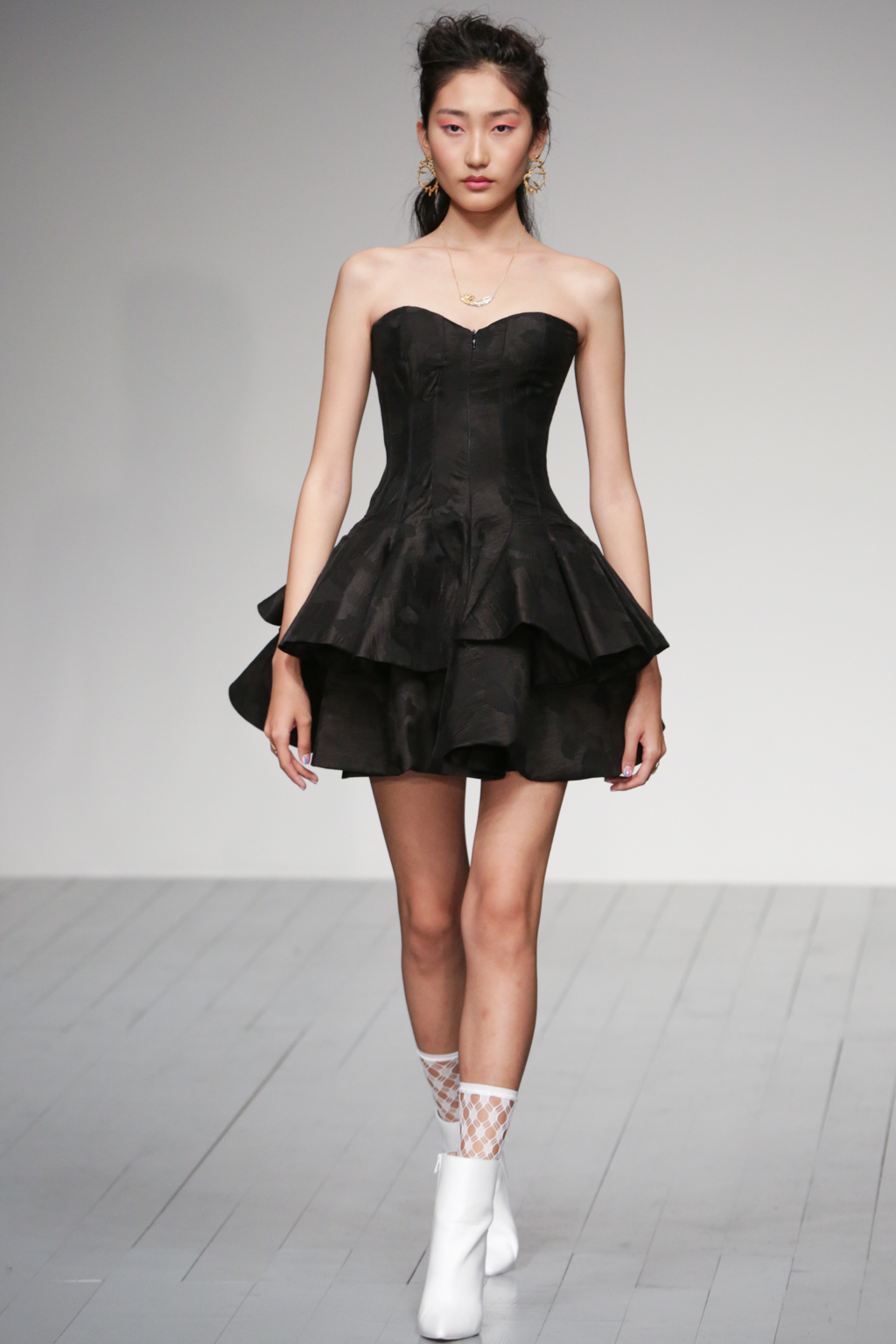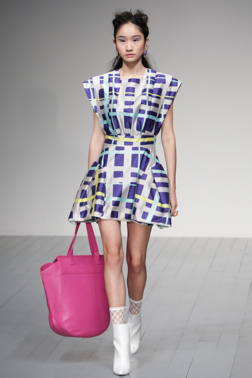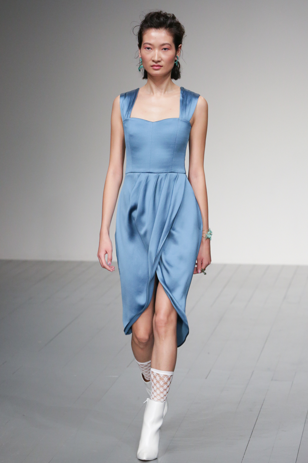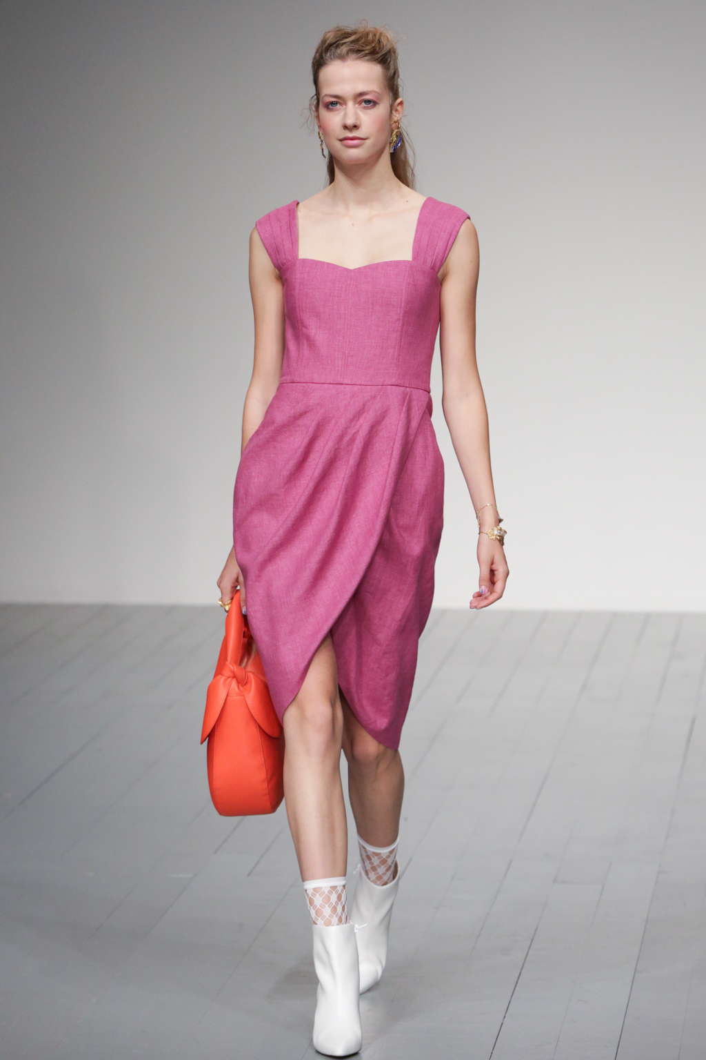 The pleasant surprise was a sports luxe theme that arose through vibrant bodysuits shielded with longline tailored jackets in complementary hues. Styled with quiffed hair, ankle boots and fishnet socks, these looks created a welcome sense of 80s nostalgia.