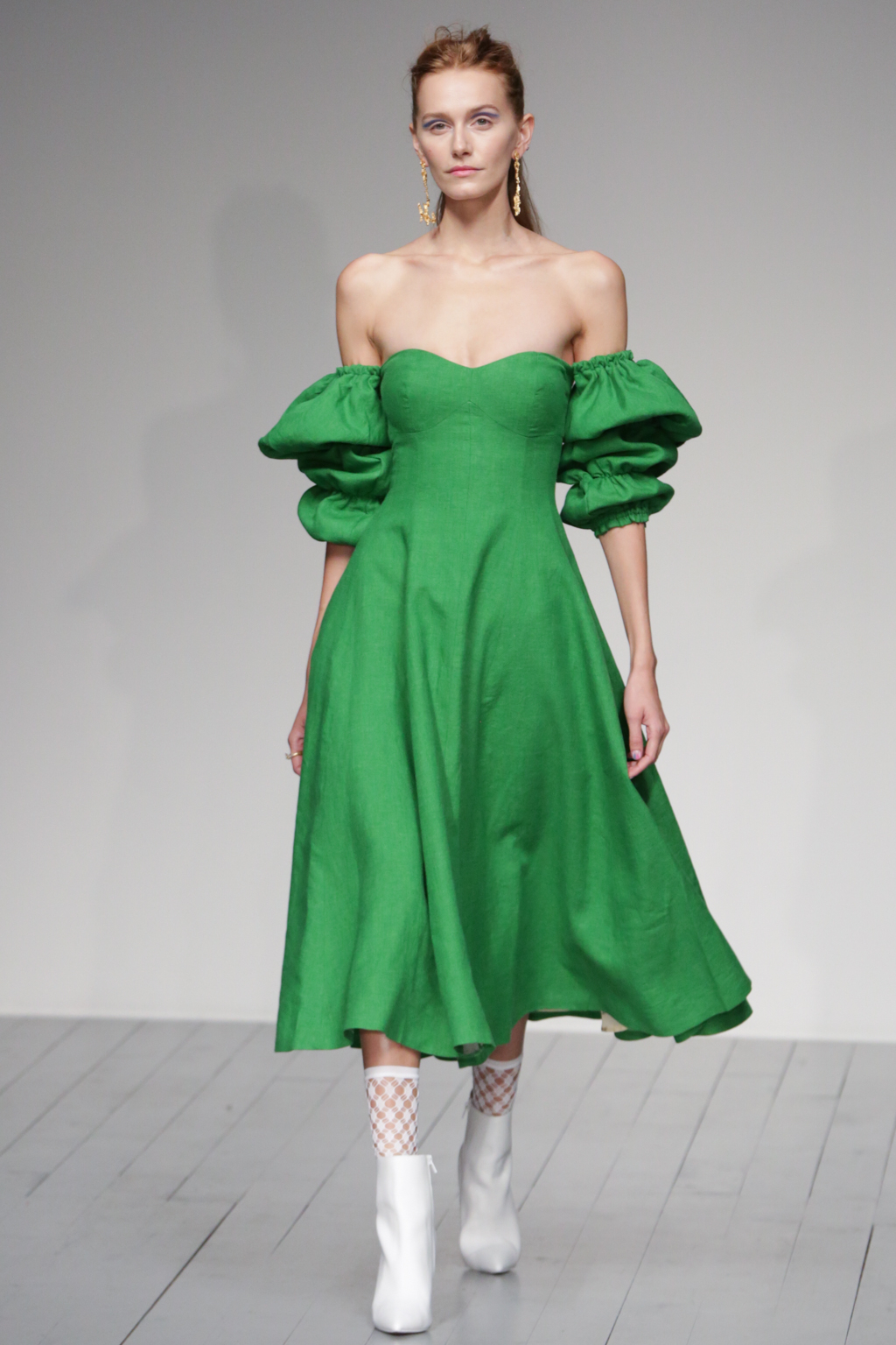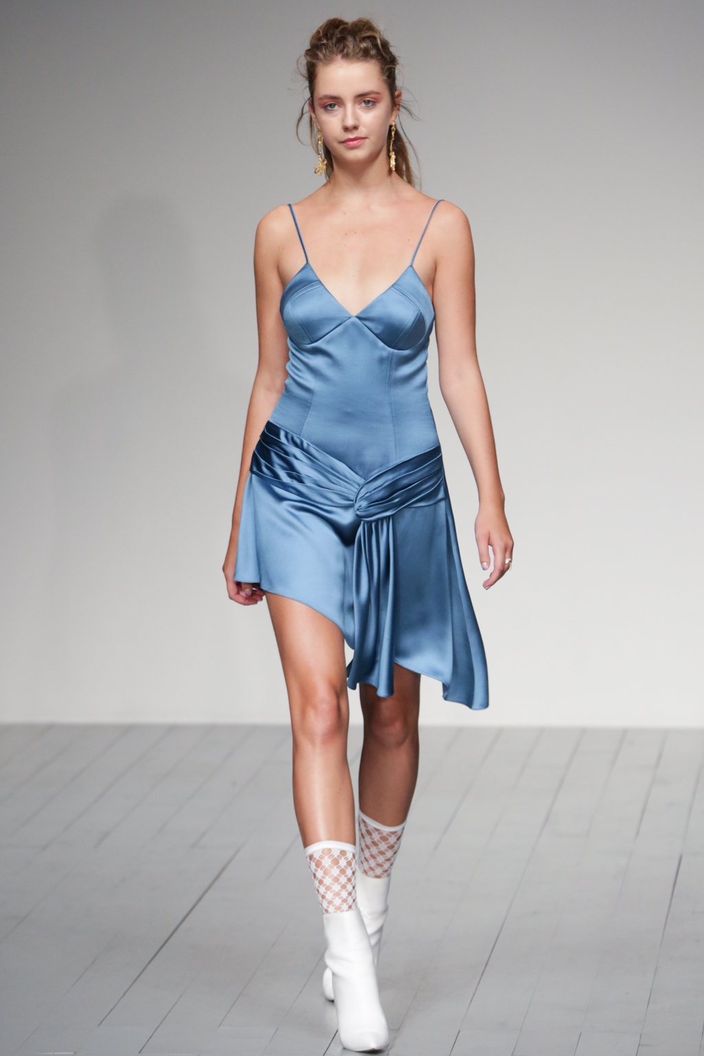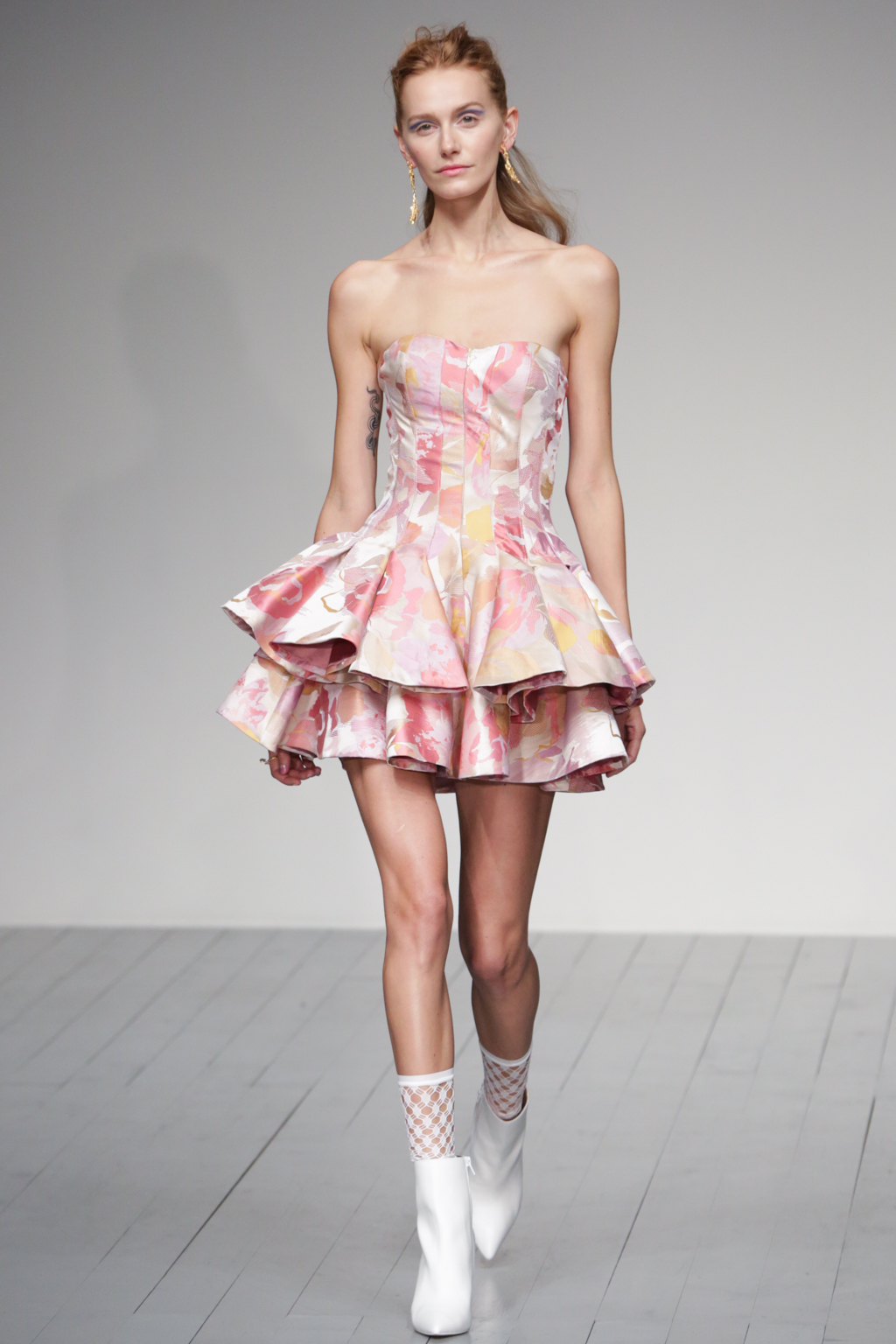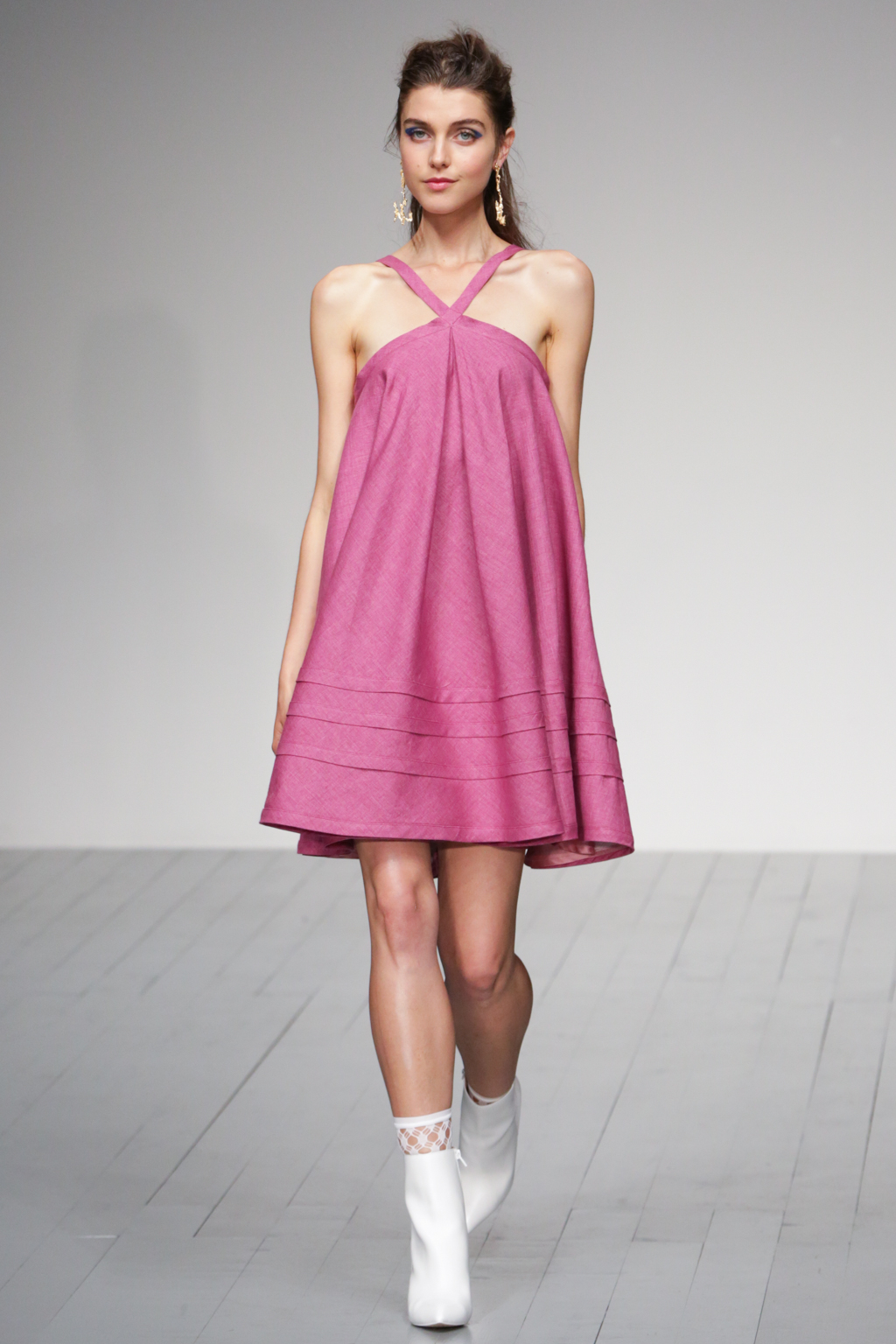 The pleasant surprise was a sports luxe theme that arose through vibrant bodysuits shielded with longline tailored jackets in complementary hues. Styled with quiffed hair, ankle boots and fishnet socks, these looks created a welcome sense of 80s nostalgia.