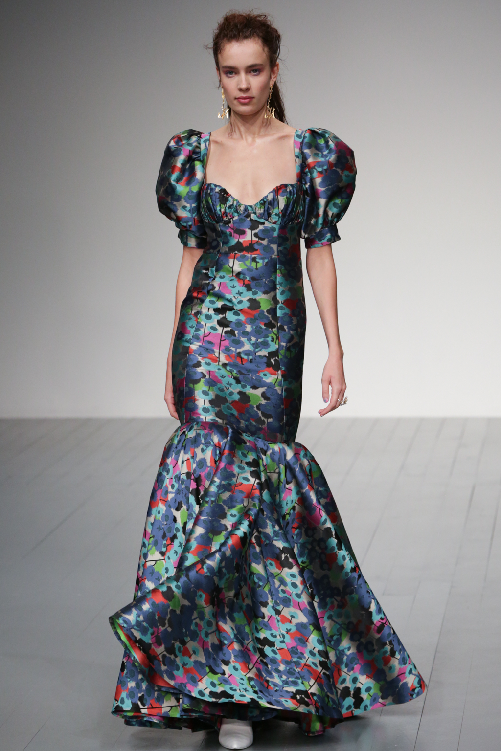 As usual, his signature elegance was amplified throughout the collection, particularly in voluminous layered mini dresses and dramatic evening gowns. The latter highlighted the décolletage with wide necklines, frequently adorned with heavy floral and jacquard prints.