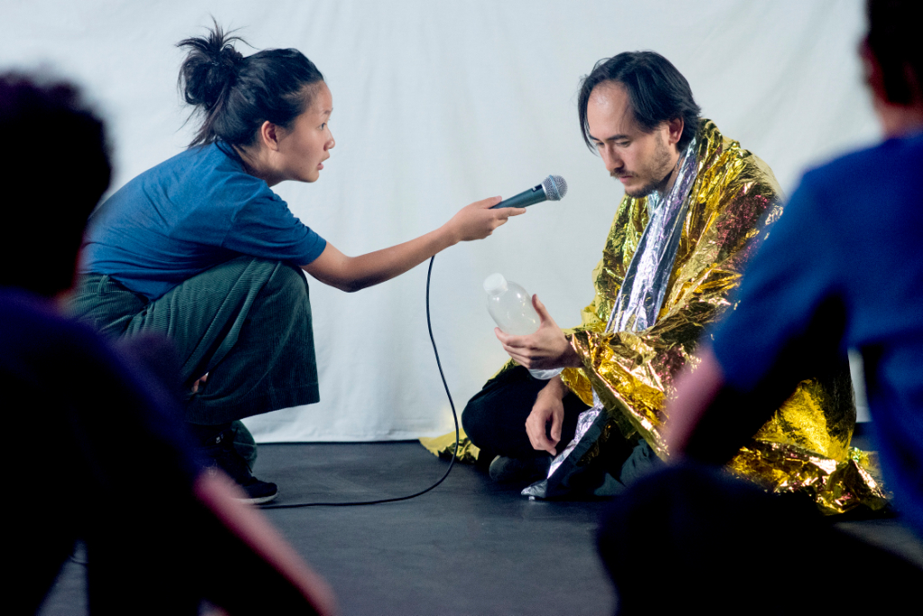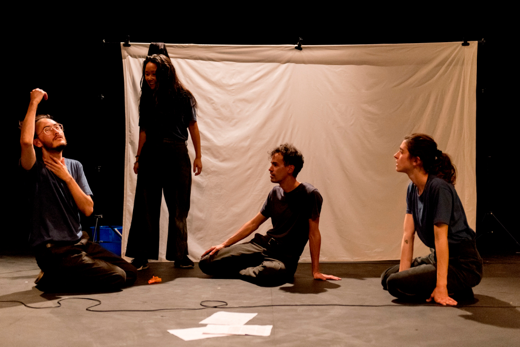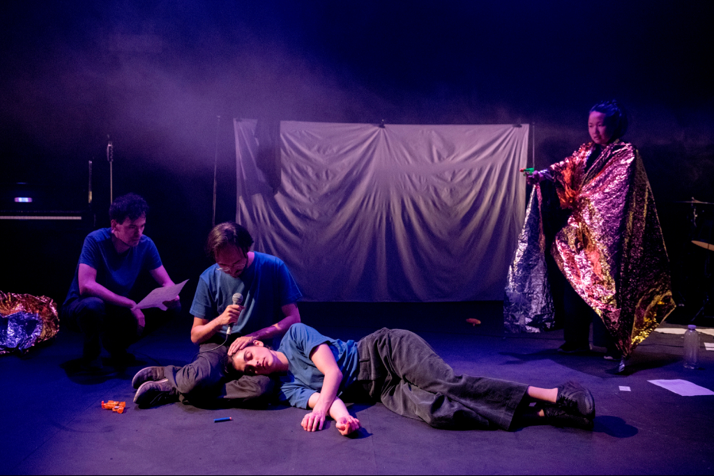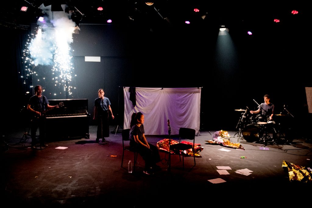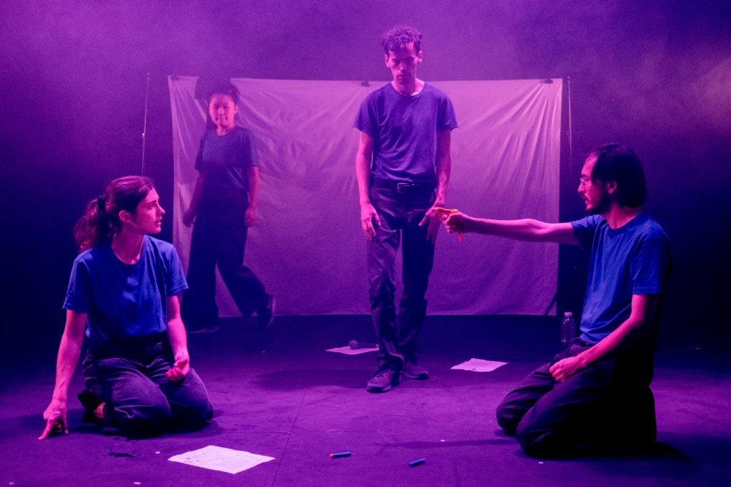 The four actors operate the lights, move the props and set the special effects themselves, as a real work-in-progress is opened up to the audience. On the stage, there are yellow foils theatregoers may recognise from recent news bulletins as the blankets used to cover the rescued migrants; there are other subtle, effective uses of these technical aspects, like the kitch neon light signalling the presence of corpses, or the smoke hiding and making (in)visible the depicted mental confusion. The curated presence of these objects, without being too overwhelming, is a wonderful communicative extra.