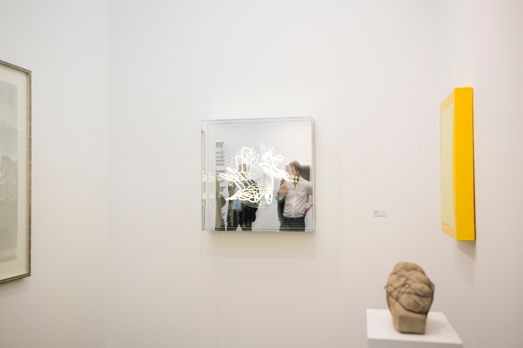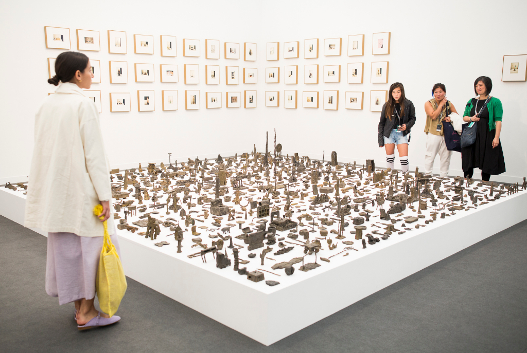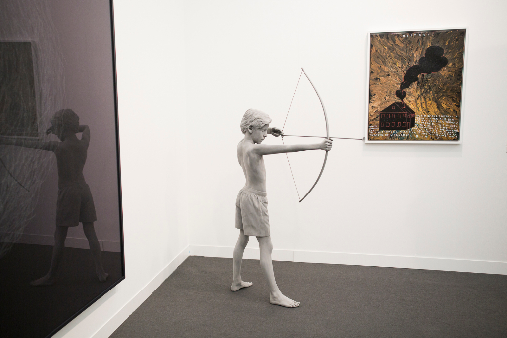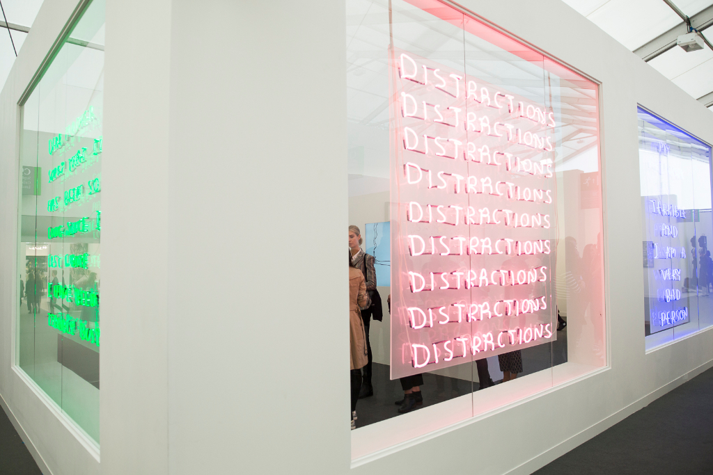 This year the fair is divided into four segments: the main section, focus, social work and live. The first is where exhibitors from commercial galleries showcase their international artists. Within this area and close to the entrance of the marquee, we encounter a breathtaking feat from Paris-based installation artist Tatiana Trouvé (Booth A2). A fallen tree, cast from bronze with twiggy roots, protrudes from heavily cracked concrete and a pile of folded marble blankets. This grand display weighs in at 30 tonnes and carries a rather hefty price tag to match. Other highlights in this main space include an oversized wax statue by Urs Fischer and the rather wonderful David Shrigley’s huge and contentious neon scrawlings. (Booth C9). A gleaming Tracey Emin and work from Marina Abramovic keep the Instagram crowd happy, and the 973 beautiful tiny clay and bronze sculptures from Ouyung Chun (Booth A13), which took him a year to complete, remind us how utterly time consuming some of these pieces can be.
