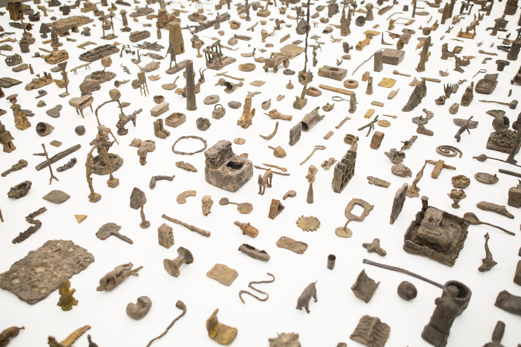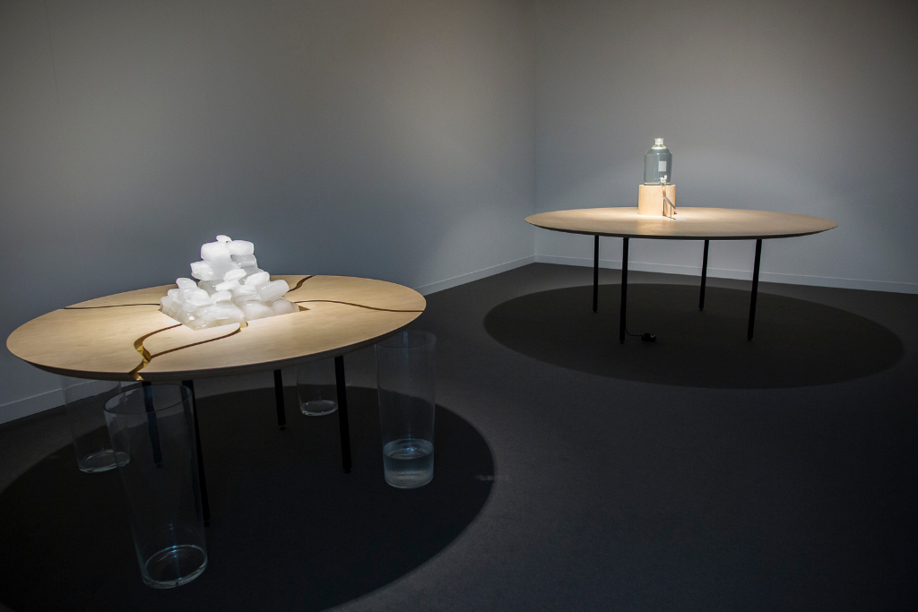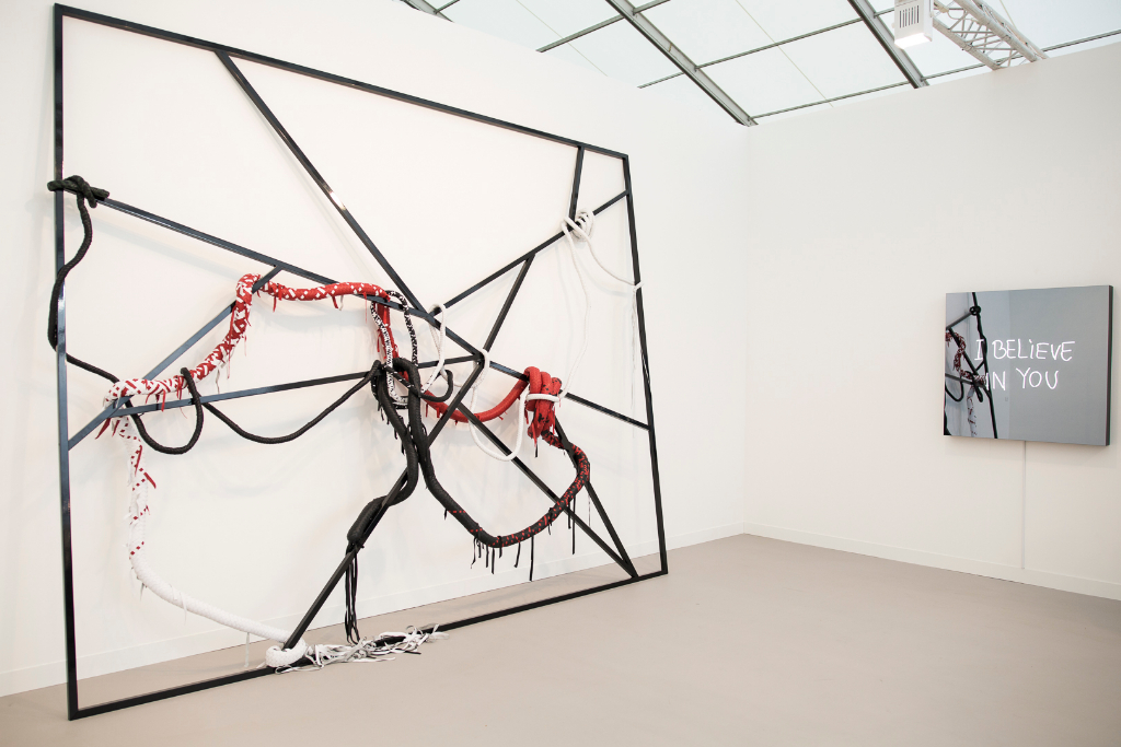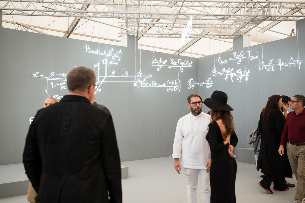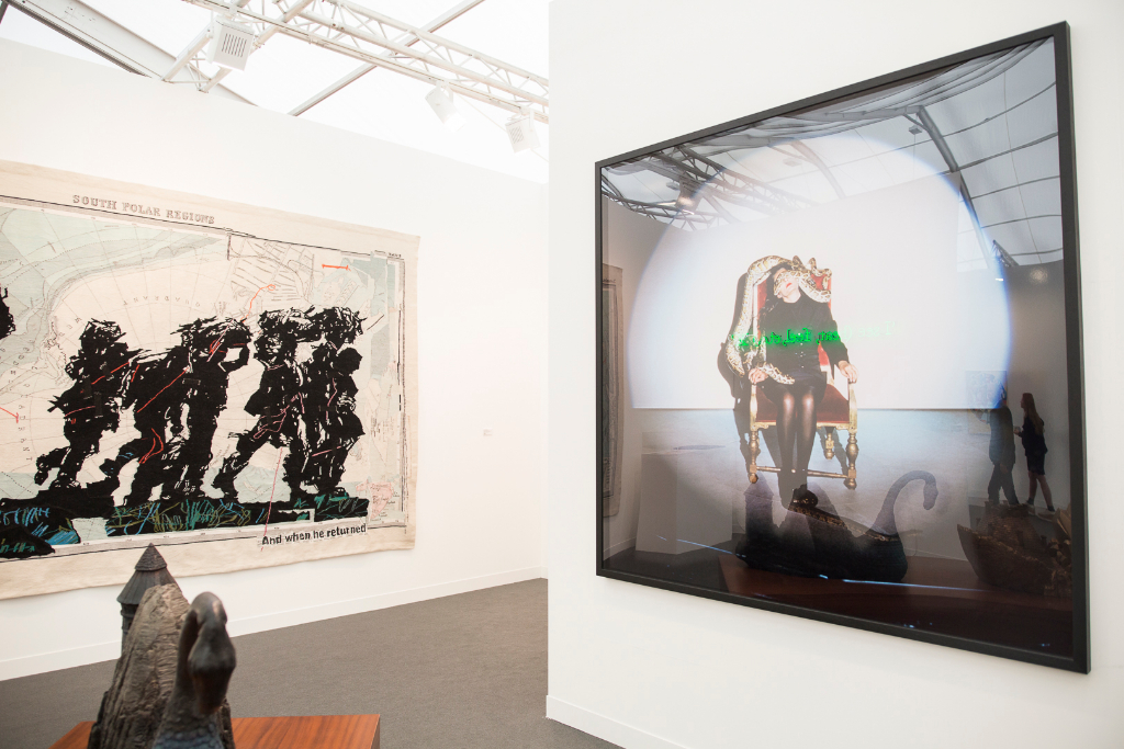 This year the fair is divided into four segments: the main section, focus, social work and live. The first is where exhibitors from commercial galleries showcase their international artists. Within this area and close to the entrance of the marquee, we encounter a breathtaking feat from Paris-based installation artist Tatiana Trouvé (Booth A2). A fallen tree, cast from bronze with twiggy roots, protrudes from heavily cracked concrete and a pile of folded marble blankets. This grand display weighs in at 30 tonnes and carries a rather hefty price tag to match. Other highlights in this main space include an oversized wax statue by Urs Fischer and the rather wonderful David Shrigley’s huge and contentious neon scrawlings. (Booth C9). A gleaming Tracey Emin and work from Marina Abramovic keep the Instagram crowd happy, and the 973 beautiful tiny clay and bronze sculptures from Ouyung Chun (Booth A13), which took him a year to complete, remind us how utterly time consuming some of these pieces can be.