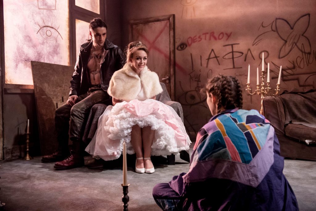 Mirren Mack captures inquisitive Naz perfectly, while Oli Higginson plays Party Guest with an air of privilege and a subtle humour that gives way to chilling menace. Brandon Ashford brings a sensible sturdiness to the cast as Lola, her relationship with Elliott one of the lone comforting aspects of the play. Then there’s the delicate Duchess, played by Isabella Brownson as capably in her moments of wide-eyed song as in her convulsive fits. Ellis Howard wrenches heartstrings as the befuddled Party Piece. Dominic Gilday exudes desperation and danger as leader Spinx.