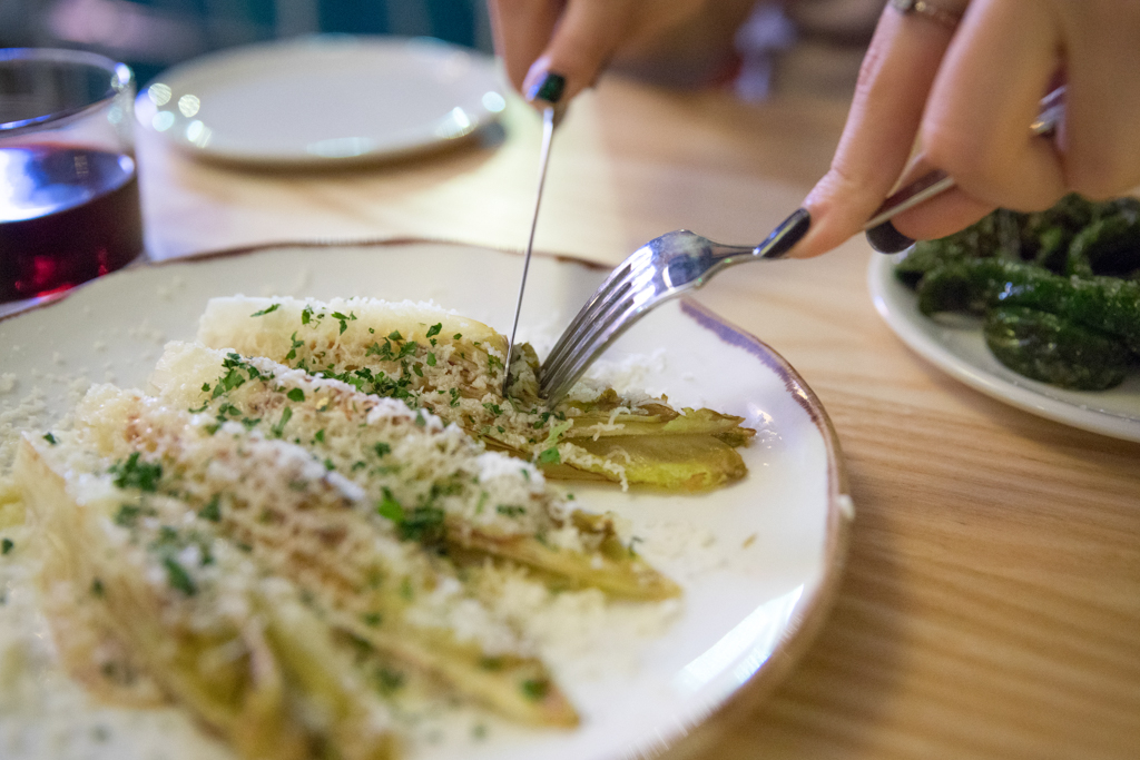 Getting onto the main dishes, all of which were served in small tapas portions, we started out with the a la plancha chicory with garlic oil and grated manchego cheese, which was light and satisfying, offering a great combo of flavours.
