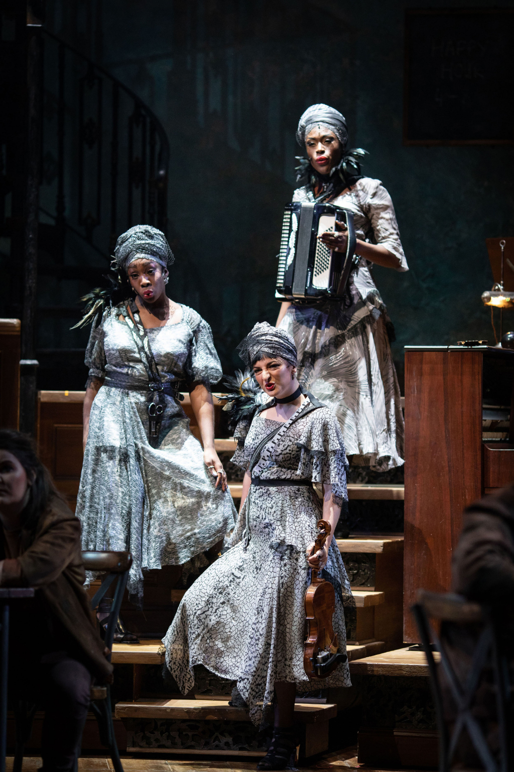 The sound of the show is great, a riotous blast of bluesy, folky Americana. On a song-by-song basis, however, it is slightly less memorable, a problem exacerbated by Chavkin’s repetitive direction. Nearly every number involves some configuration of round-and-round, up-and-down, the Olivier’s spinning central drum getting a full workout without the production ever justifying its use beyond the very basic idea of sinking into the depths of Hades.