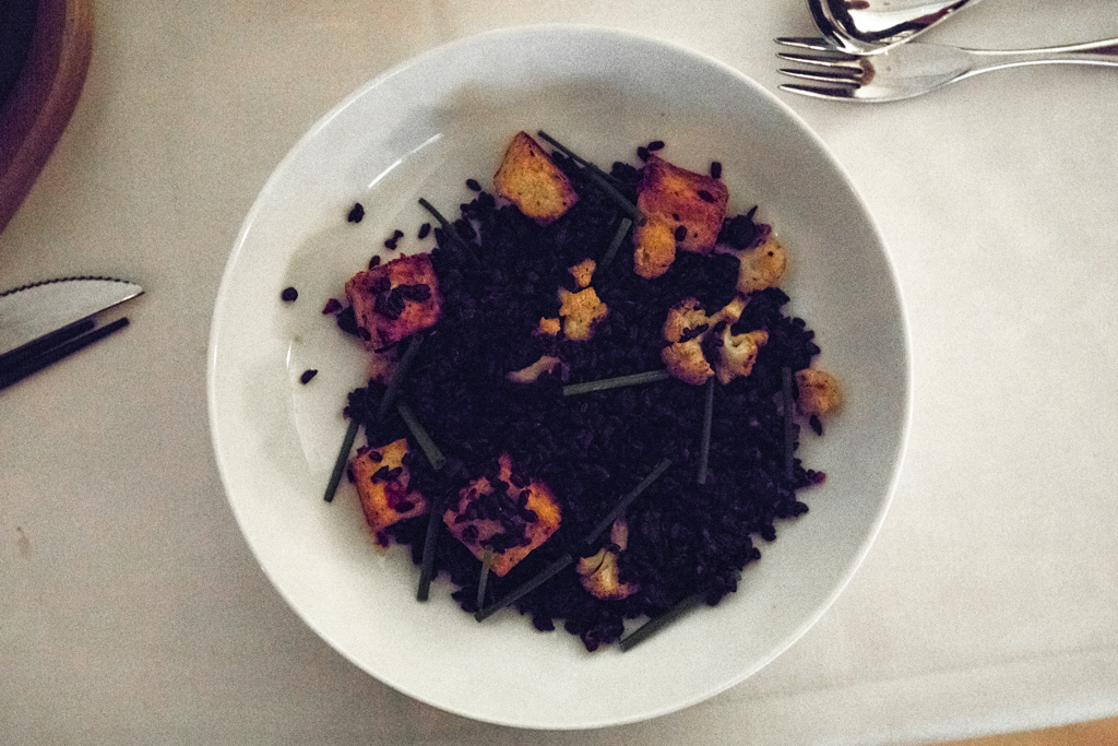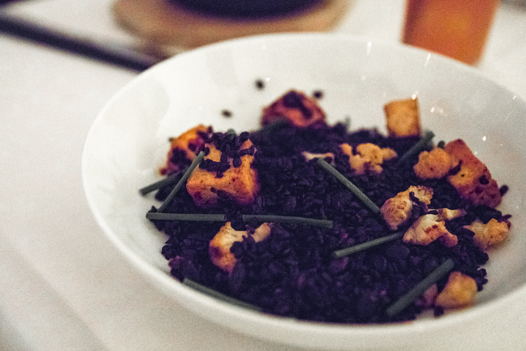 For mains, we chose a hearty lamb shank and replaced the Chilli-Rubbed Scallops with a tofu substitute. A mini cauldron-style pot contained the meaty dish, the lamb so tender it literally fell off the bone. Whole Shimeji mushrooms added a wonderful Asian twist and soft pieces of aubergine filled out the plate, keeping the carb-free course full and robust. The vegetarian dish with black rice, beans and roasted cauliflower oozed a wondrous, smoky chargrilled taste, whilst the tofu provided a much-needed blander balance.