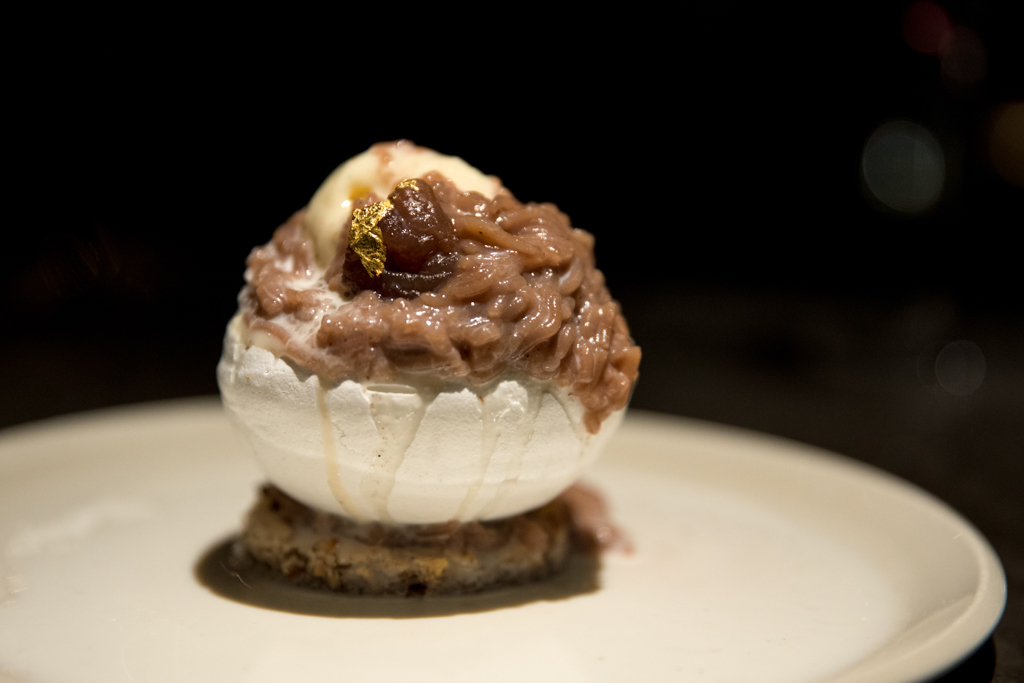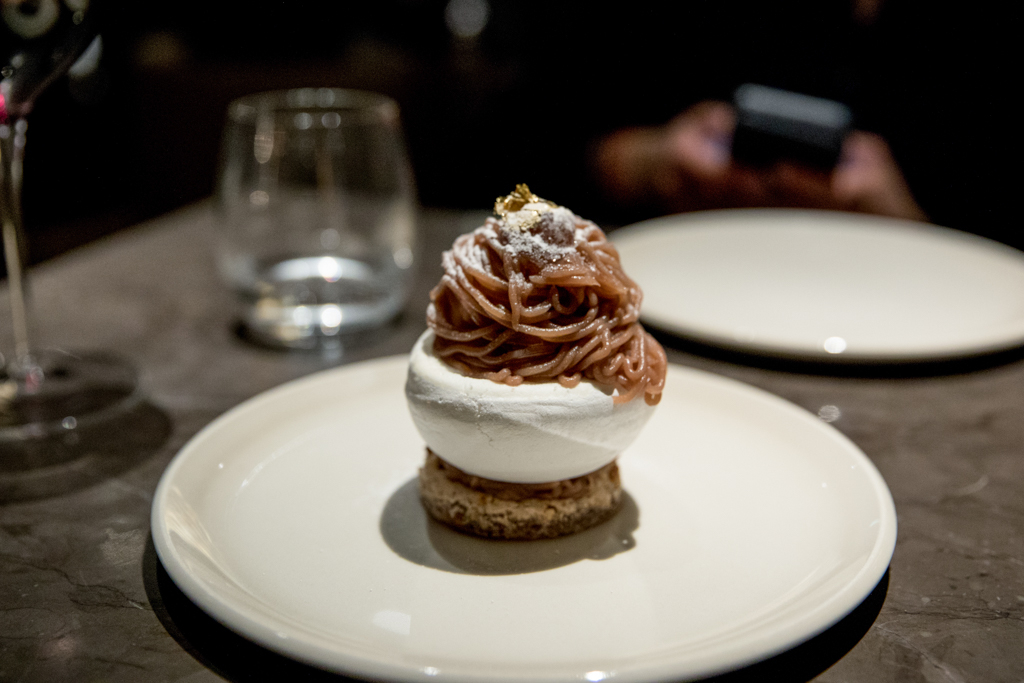 As desserts, we ordered two rather different delicacies. The Chestnut Meringue “Mont Blanc” consisted of a hard hazelnut biscuit surmounted by a spherical meringue covered in smooth chestnut cream. This was followed by the heavenly, melt-in-the-mouth Milk Chocolate Peanut Butter Croquant, the sublime ending the dinner deserved. Surrounded by liquid chocolate, the croquant and the accompanying spoonful of banana ice-cream were a guilty pleasure that enveloped us in pure bliss.