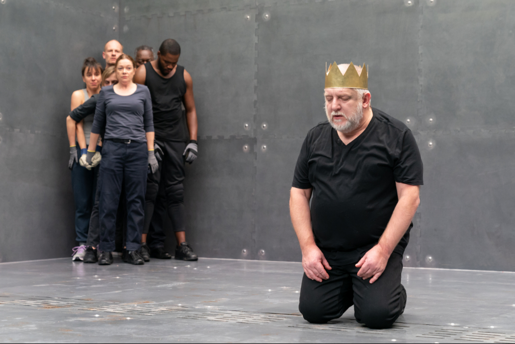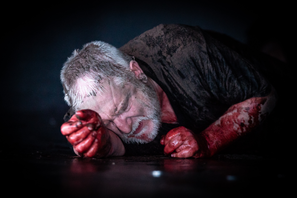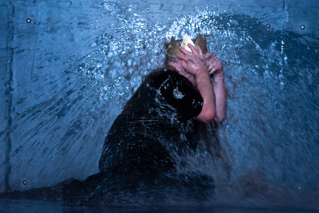 Other than that, there is almost nothing – merely a few buckets with various liquids and dirt, as well as some gloves for props. Sound effects by Peter Rice are kept to a minimum, with occasional subtle throbbing underlining various speeches and moments during the plot, and louder sounds indicating the change between the acts. Consequently, the entire focus shifts onto the actors – and they are all fantastic. Everyone gives their best: especially Beale, who delivers a pristine performance as the pitiful, pathetic king, which is sure to draw a tear from even the sturdiest of souls. The whole play is performed in a single abridged setting with the whole cast constantly present on stage. When not part of the action, they go into a freeze, resulting in many a pretty – or horrific – picture.