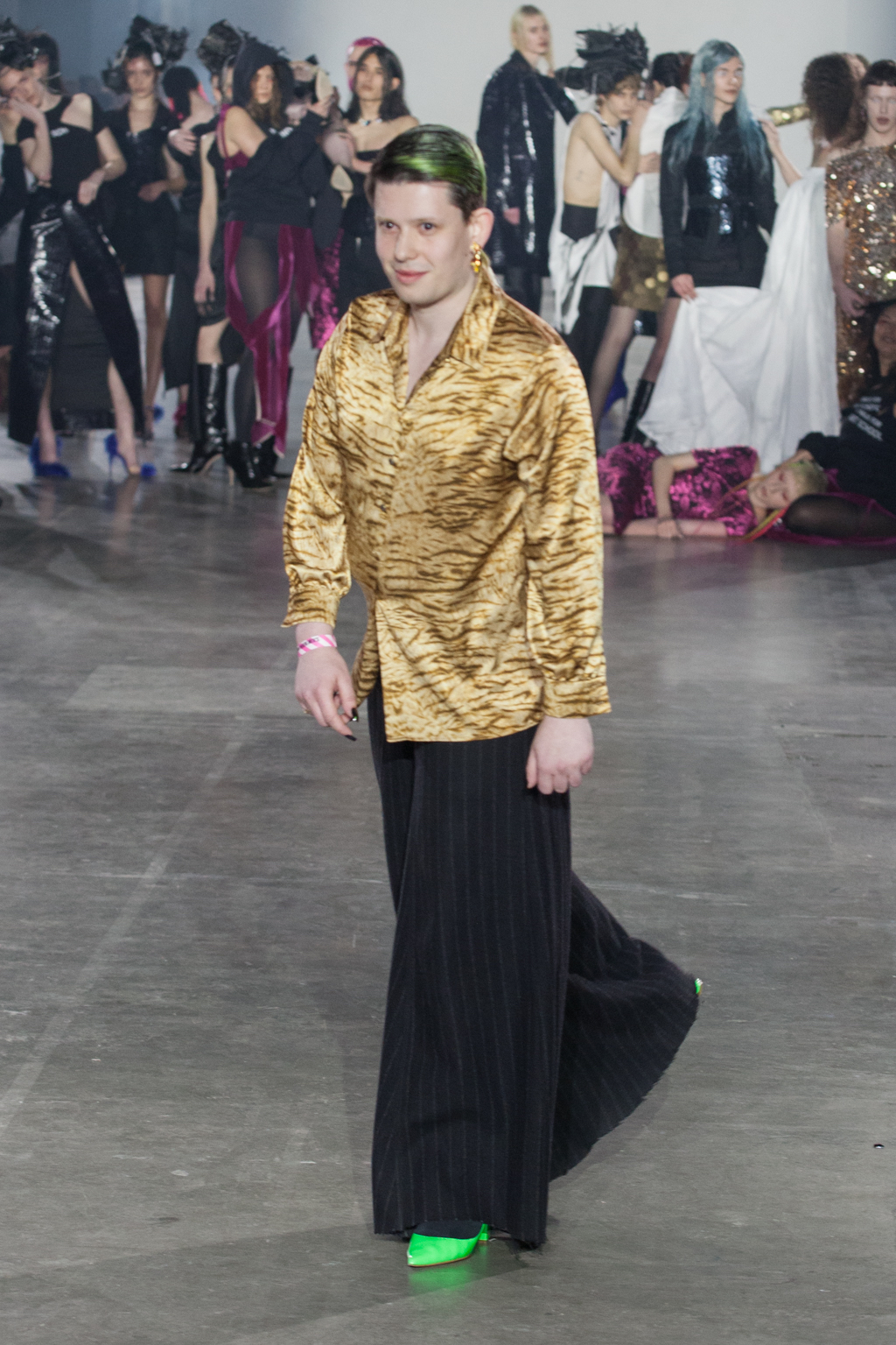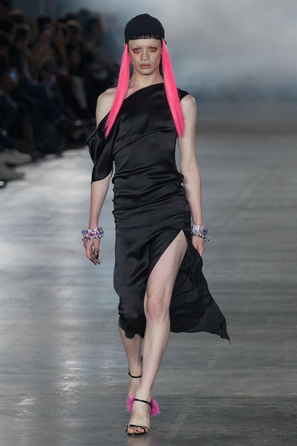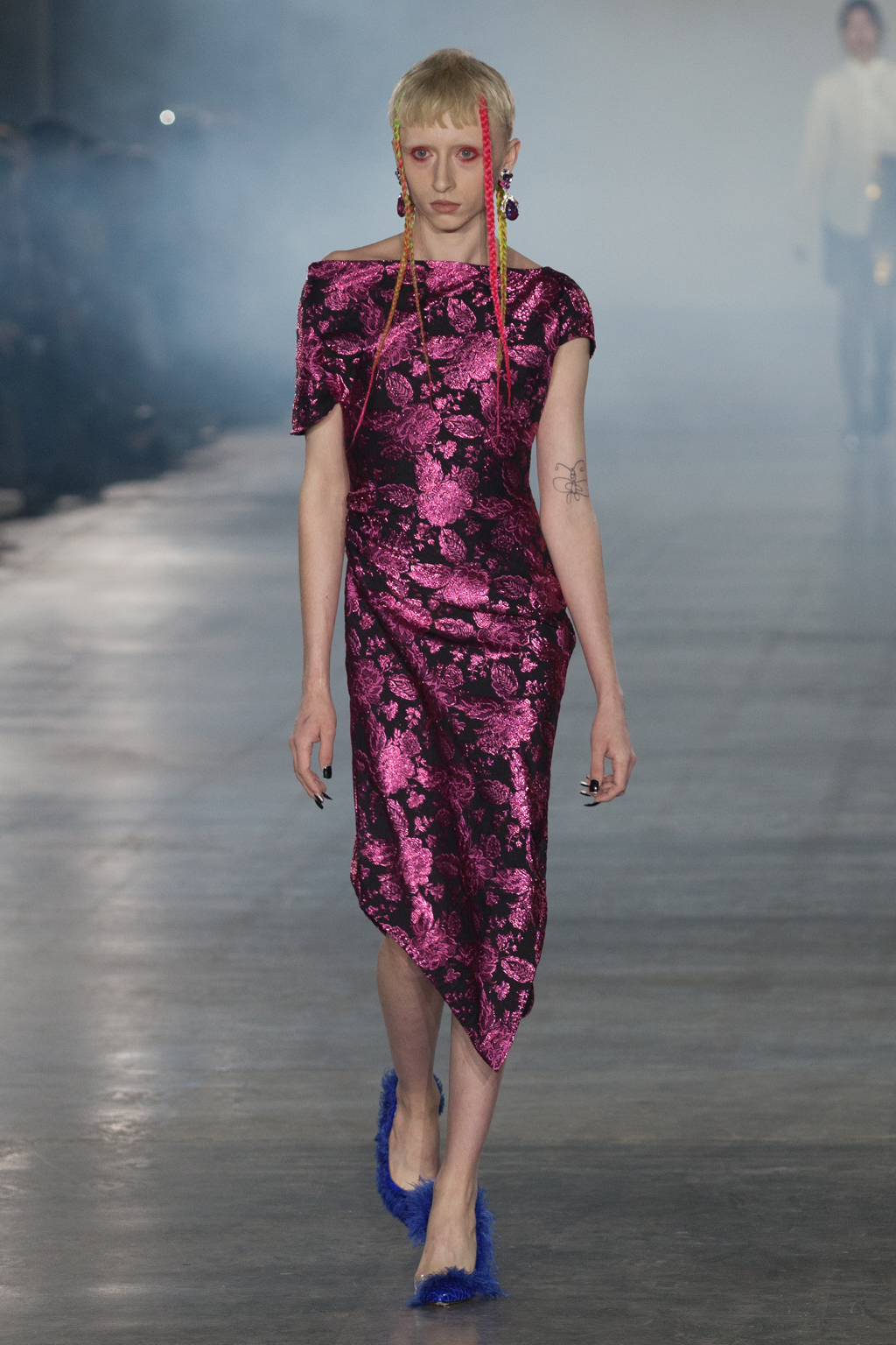 A celebration of queerness and inclusivity, each look drew emphasis towards the bodily form: whether cisgendered, trans or non-binary, the designs and cuts mirrored the fluidity of the body of whom it was worn on. Tailored jackets formed both boxy and sculpted silhouettes. One particular design was coined by the duo as the “dagger dress”, and it was instantly apparent why: fabricated with either black silk or decadent pink jacquard, the dress was cut on the bias, rushed slightly at the waist, warping and welting the fabric to fall diagonally across the body until coming to a sharp, slanted hemline jutting out at the knees.