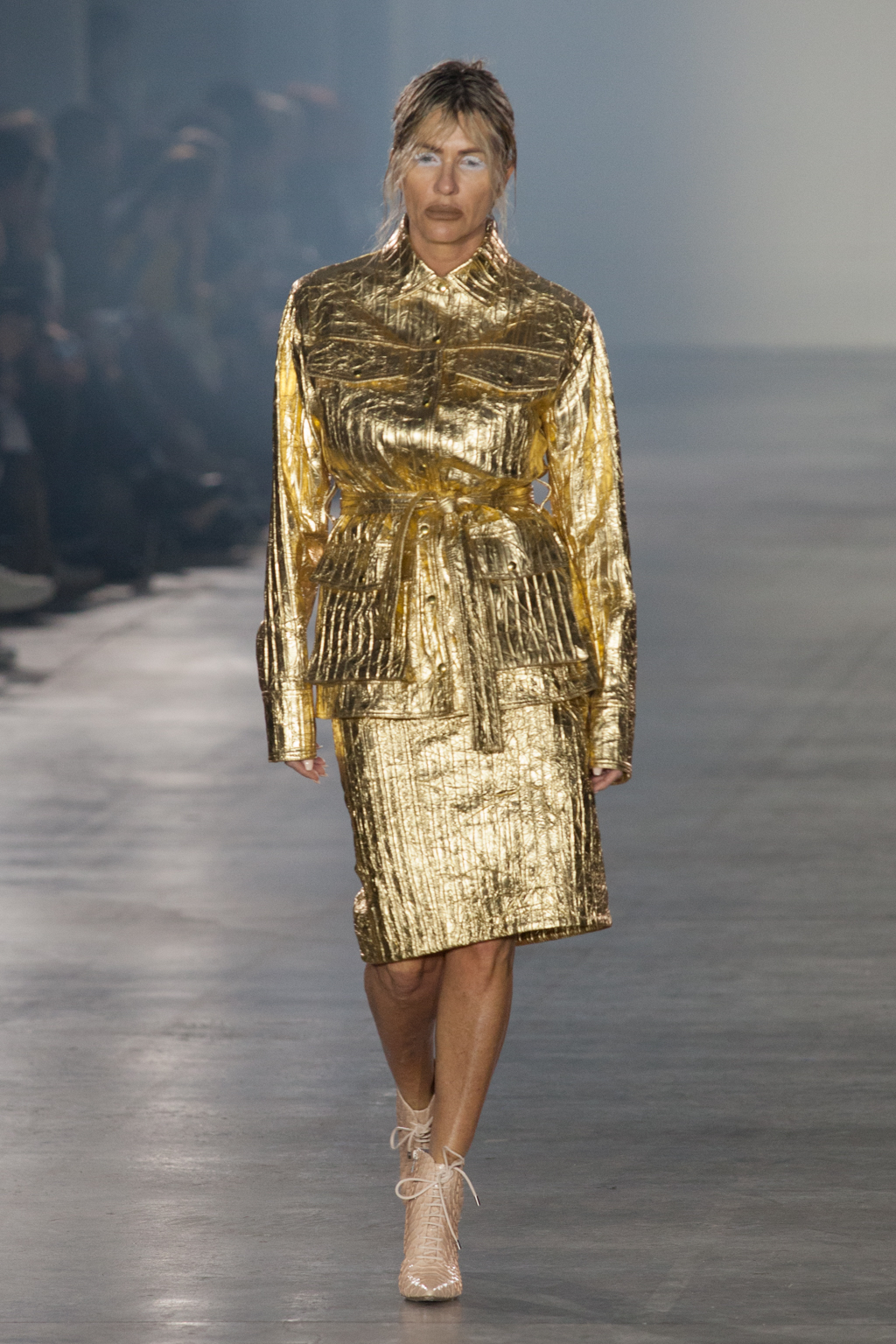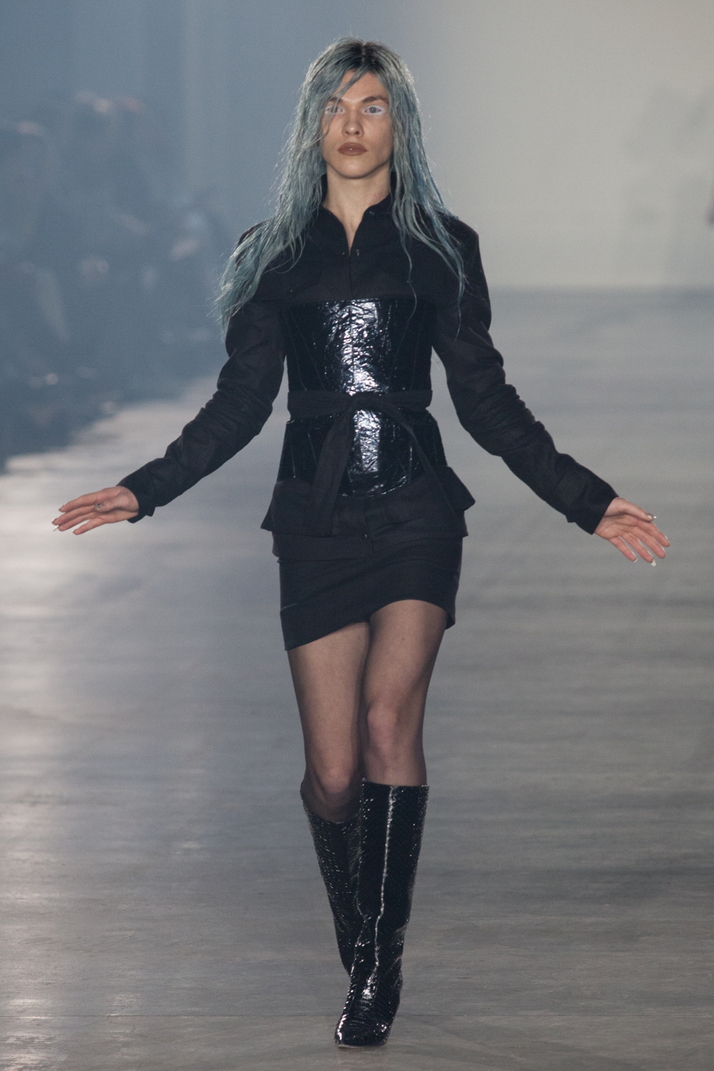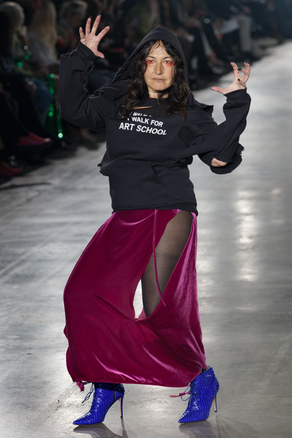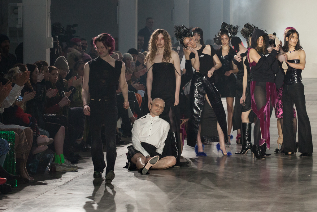 Fabrics were often richly tactile, as seen in a foiled gold leather trench coat and a black corset bound over a workshirt, illustrious, cracked textures. A plush plum velvet skirt was split at the thigh, but not in the way you would think: instead, the convex cutout begun at the top of the skirt and ended halfway down the thigh, exposing the body. It was nuances like this that demonstrated Art School’s ability to flip conventional design on its head.
