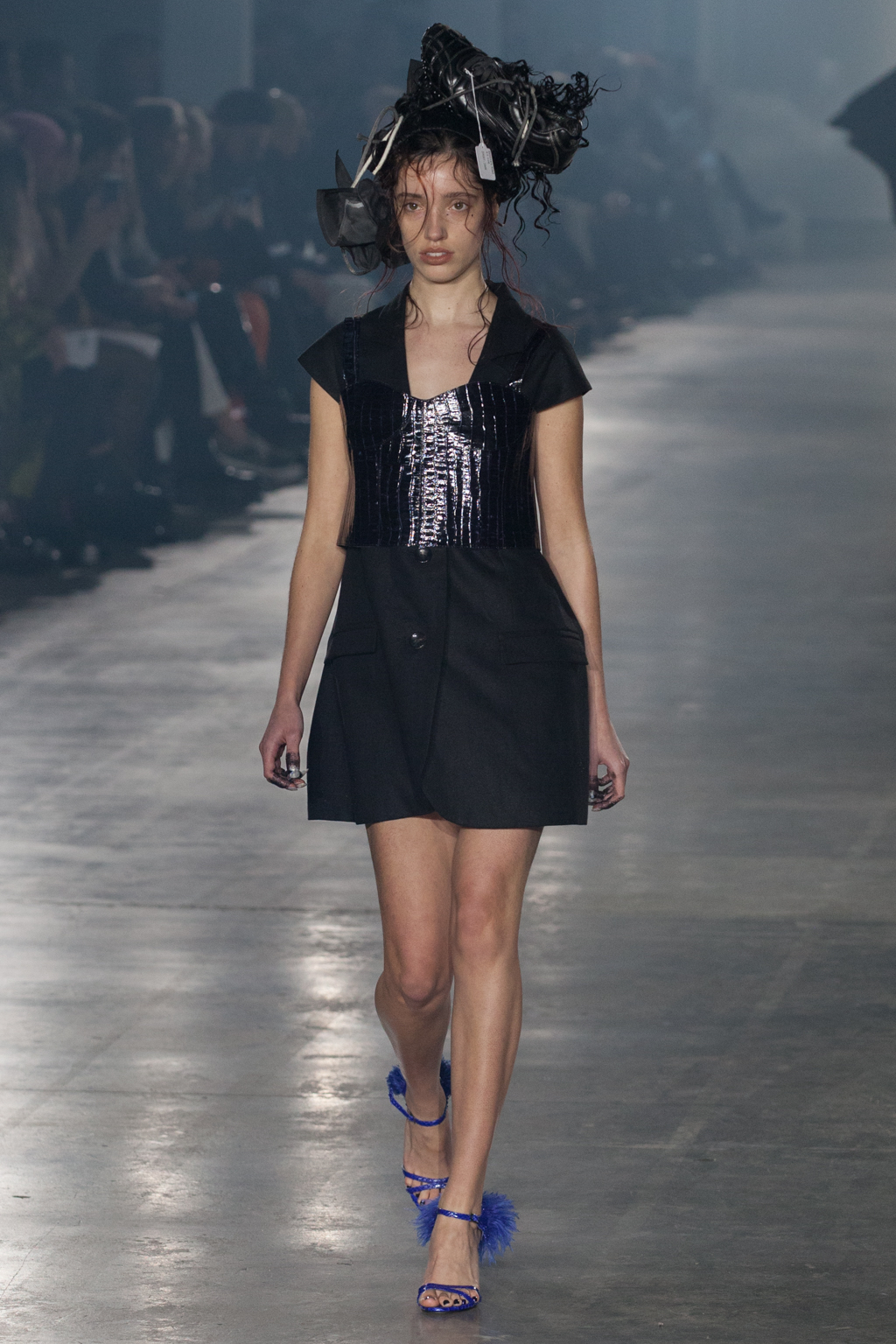The collection showcased work with previous collaborator, Gina Shoes, producing cobalt blue laced stiletto boots and heels lined with acid pink feathers. Meanwhile, hair sculptures encompassed found articles interwoven with human hair. Created from disregarded, repurposed lost property from queer safe spaces across London, it showed what was close to Loweth and Barratt’s hearts. Meanwhile, the odd flash of neon pink or lurid green made a nod to the 80s.