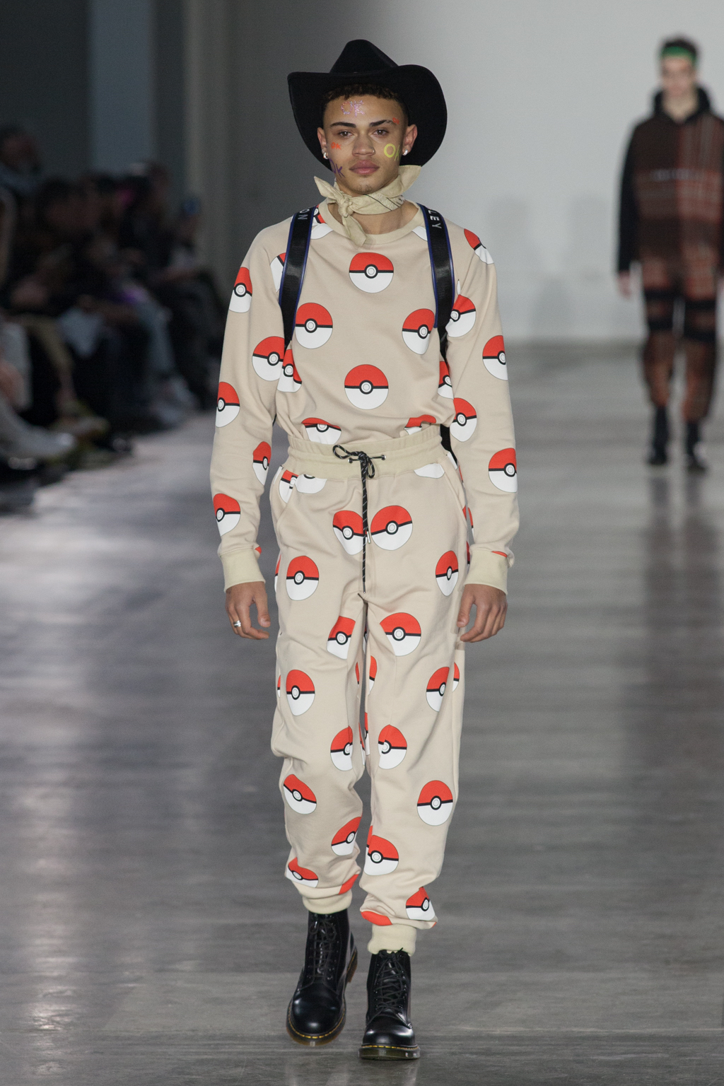 It also seemed as though the Abley boys were ready for adventure. Cowboy hats, cravats and Western-cut denim jackets induced a boyish nostalgia. However, you could not pry Abley’s charming obsession with Pokemon away from him: the finale featured a life-sized Pikachu toddling down the catwalk. All in all, the collection succinctly demonstrated Abley’s ability to blend personal reminiscence and playful imagery into a unique brand of contemporary menswear.